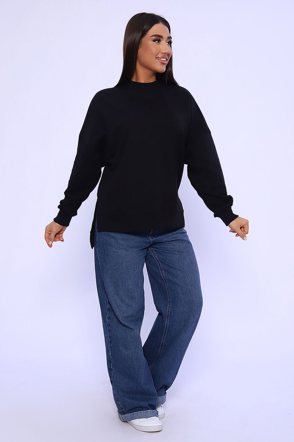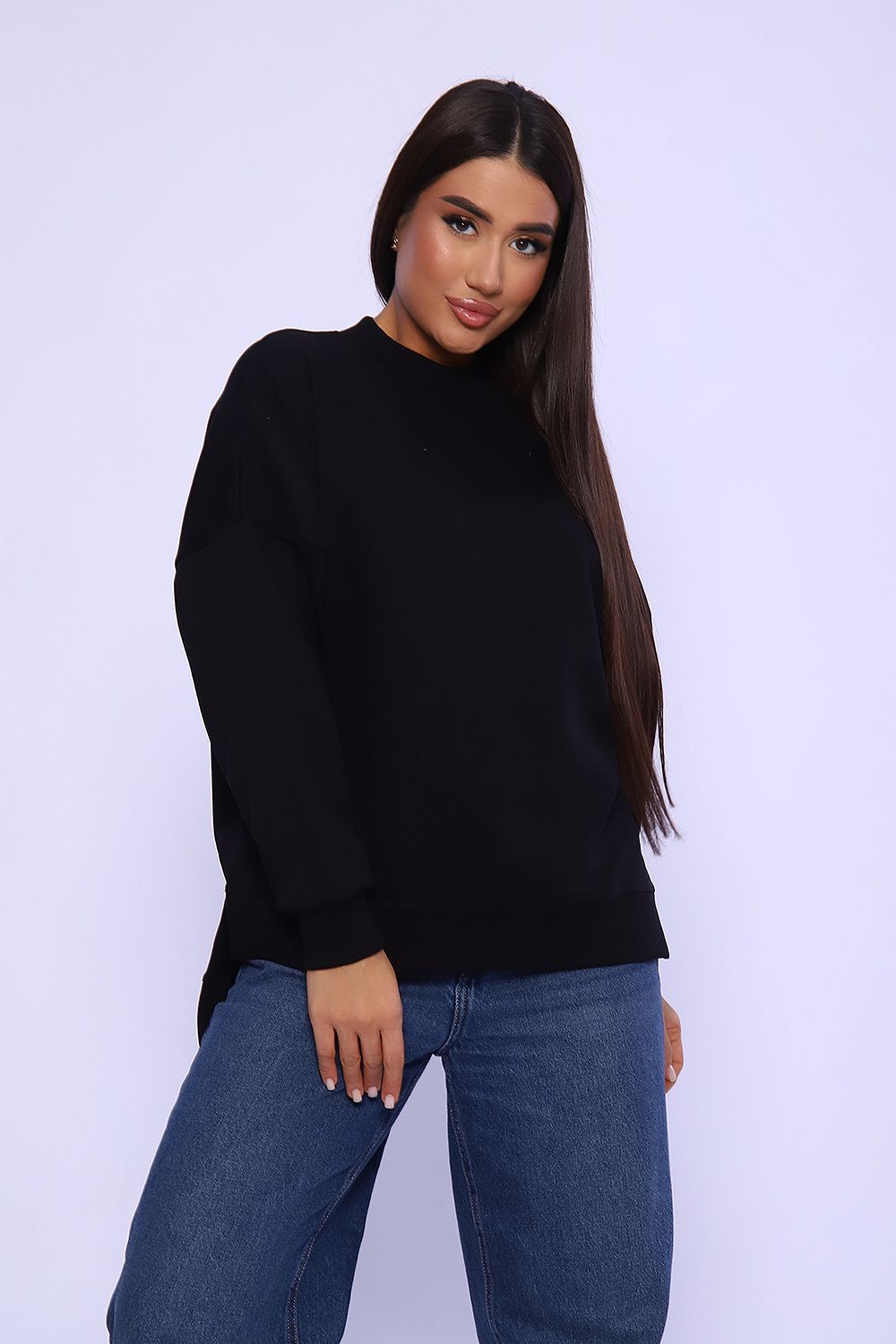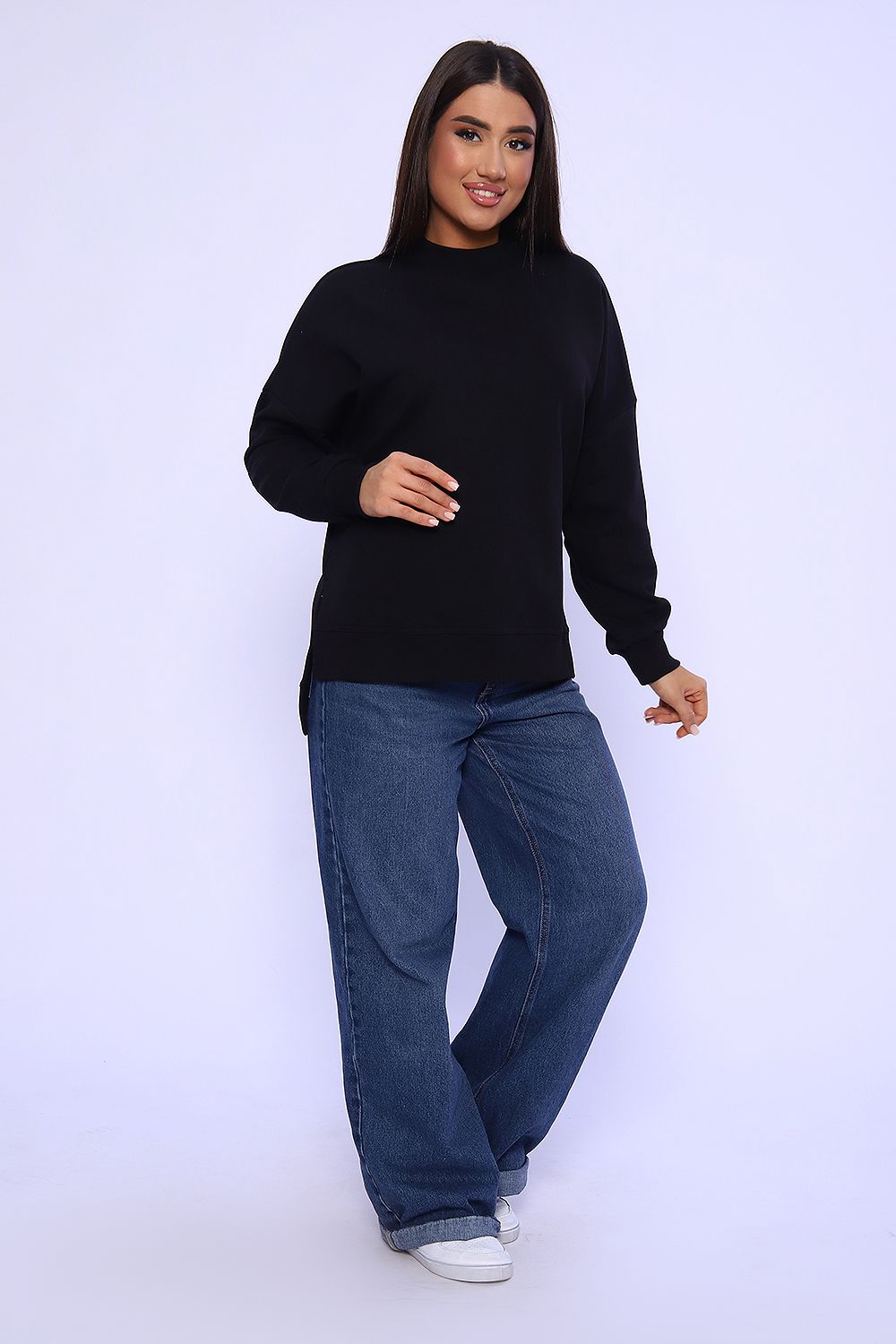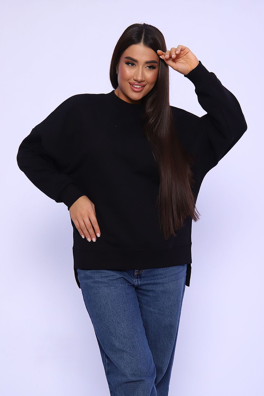 Свитшот женский выполнен в классических цветах. Особенность этой модели - спущенный рукав (летучая мышь), удлиненная спинка и боковые разрезы. Округлая горловина декорированная отстрочкой. Свитшот изготовлен из футера 3‑х нитки (петля). В 52 и 54 размеры, по спинке шов.