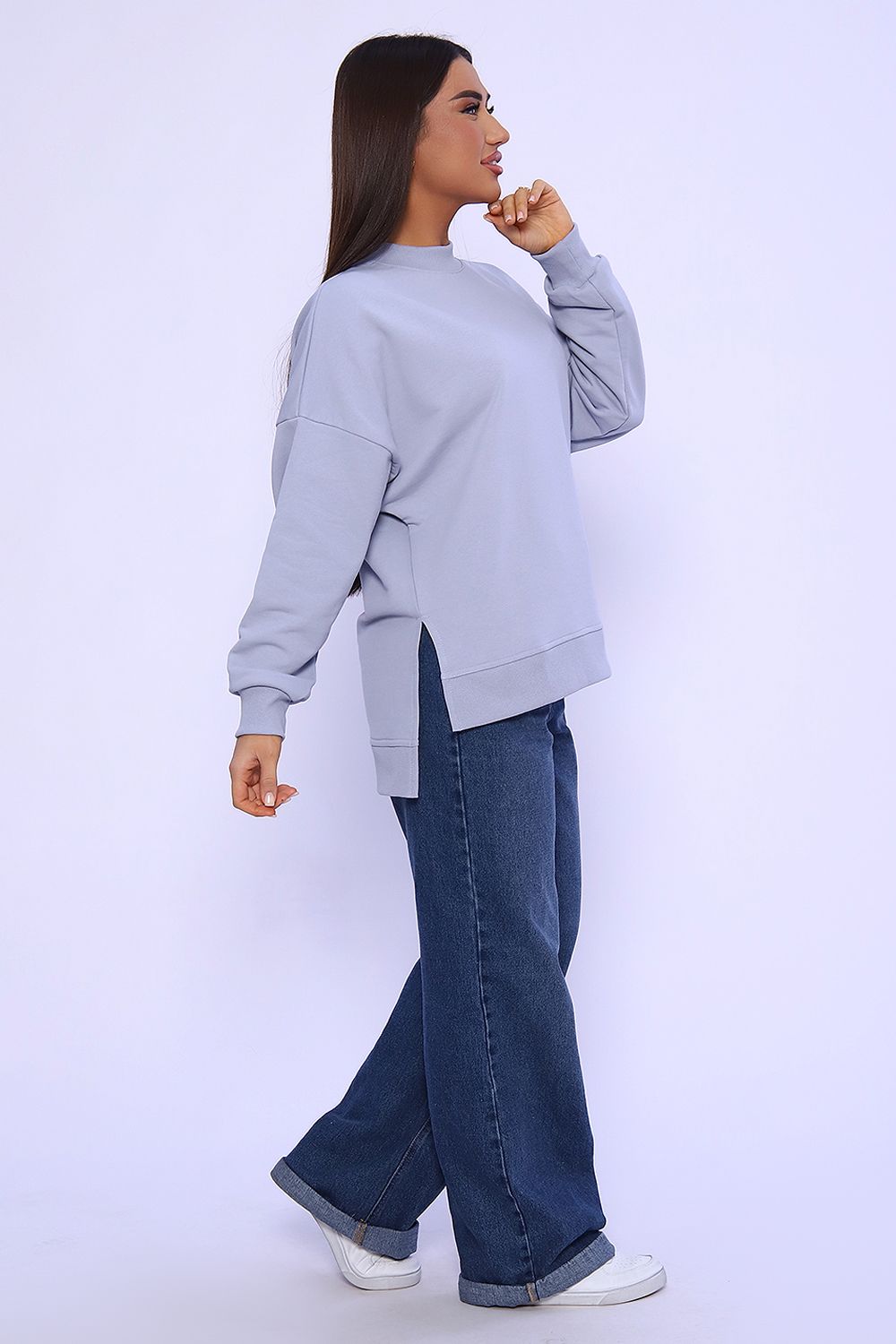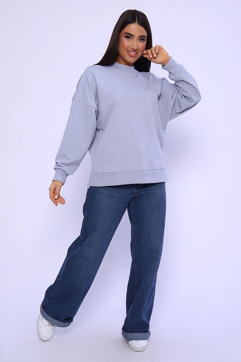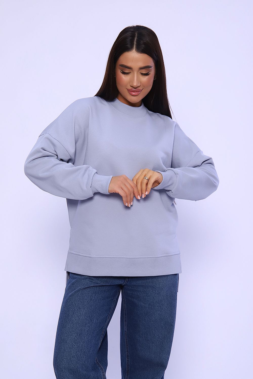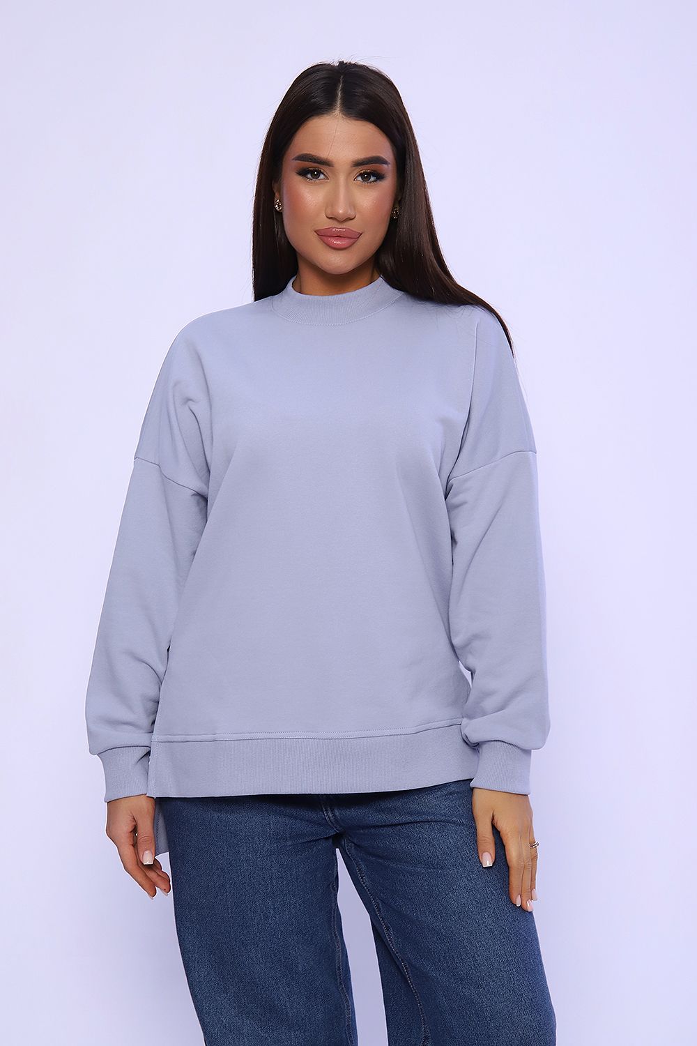 Свитшот женский выполнен в классических цветах. Особенность этой модели - спущенный рукав (летучая мышь), удлиненная спинка и боковые разрезы. Округлая горловина декорированная отстрочкой. Свитшот изготовлен из футера 3‑х нитки (петля). В 52 и 54 размеры, по спинке шов.
