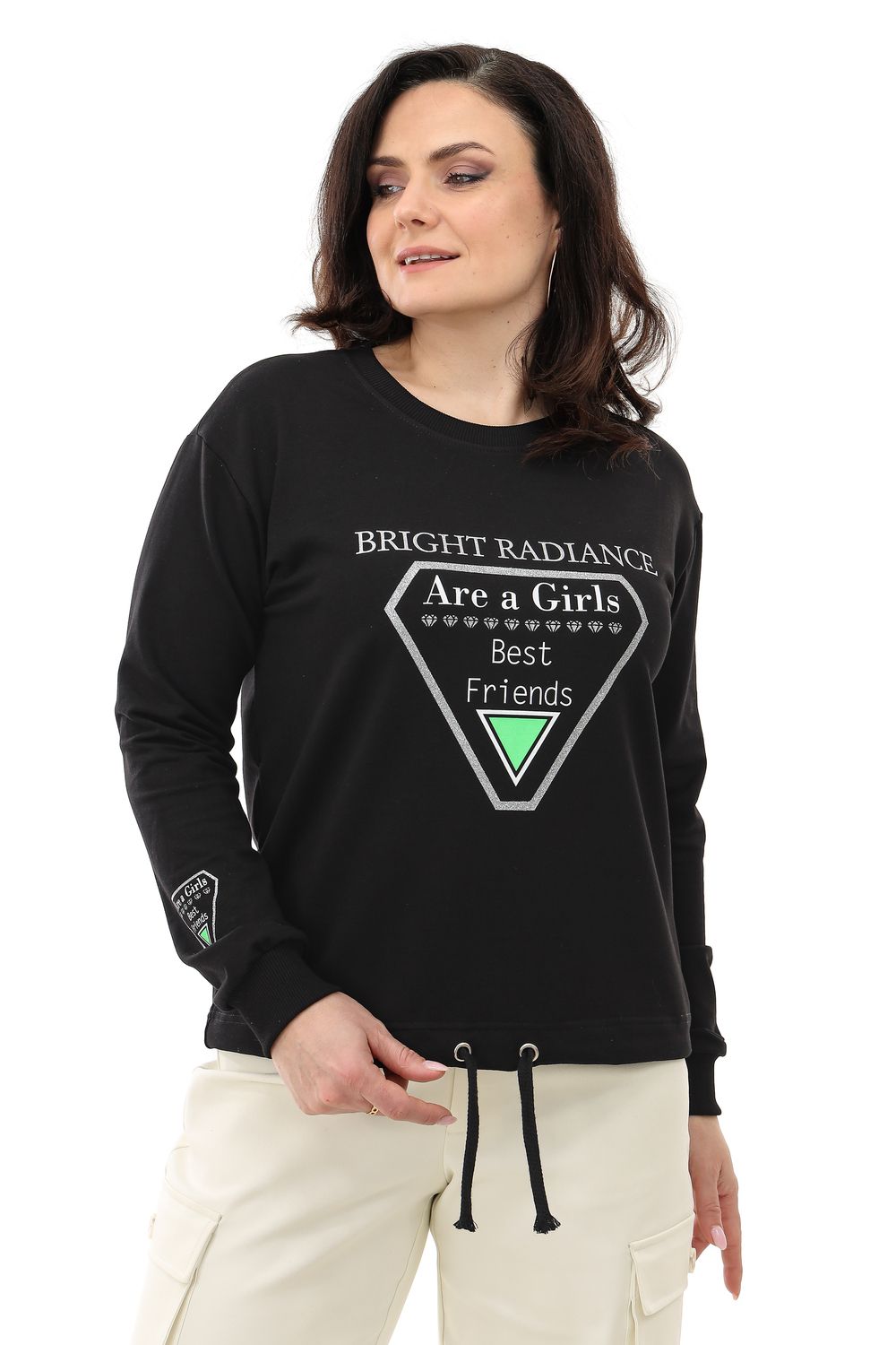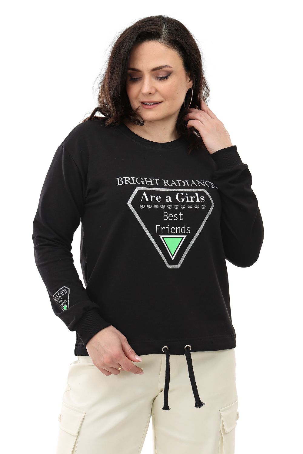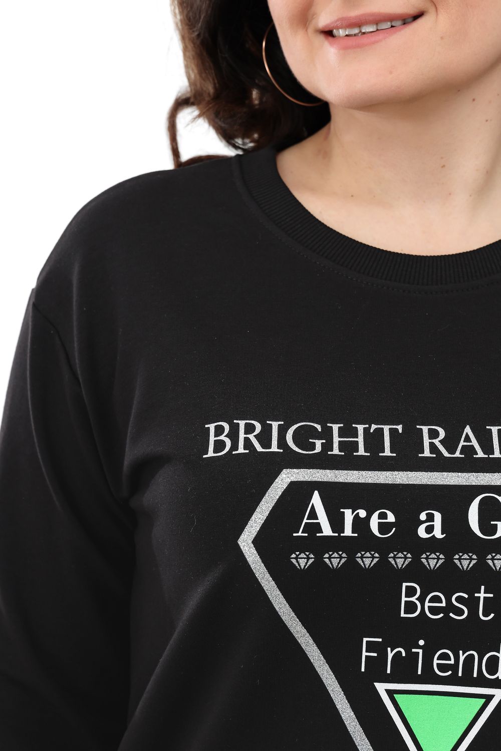 Свитшот свободного силуэта, прямого кроя. На переде печать с серебром, которое будет эффектно искриться на солнце. Линия плеча спущена. Манжеты из кашкорсе подобраны в тон ткани. Низ изделия регулируется шнуром.