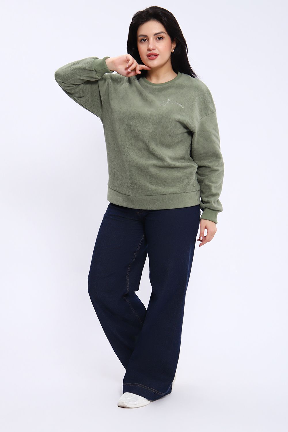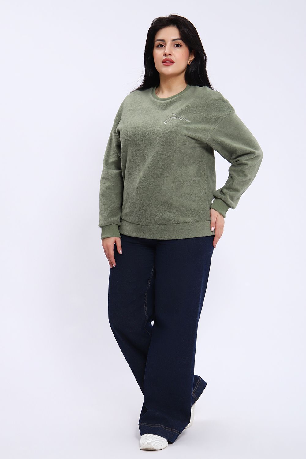 Свитшот женский из футера 3-х нитки барашек качества пенье. Модель свободного кроя в стиле оверсайз, спущенная пройма, горловина и манжеты обработаны эластичным кашкорсе, на груди слева вышивка. Низ джемпера на широком манжете из основного полотна. Толстовка стильная, приятная к телу, выполнена из двухслойного, плотного трикотажа - внутри интерлок -хлопок, с наружи начёс в виде пушистого "барашка" из полиэстера. Барашек не скатывается, не пиллингуется. Универсальный, тёплый свитшот - необходимая вещь в прохладную погоду, отлично подойдёт для прогулок, активного отдыха, занятием спортом.