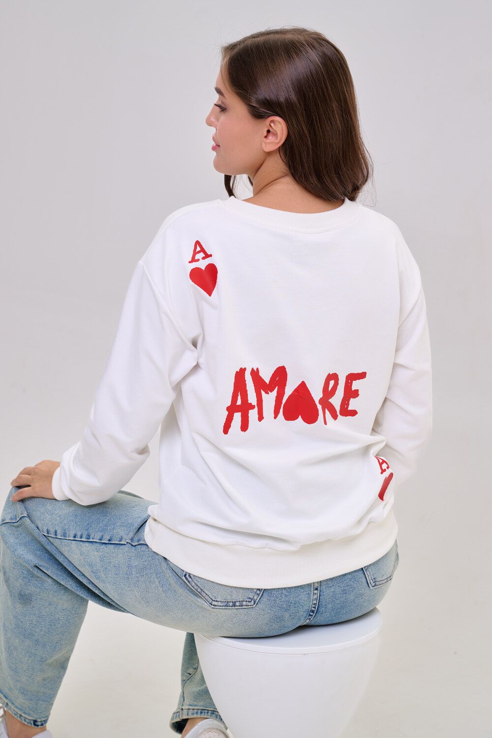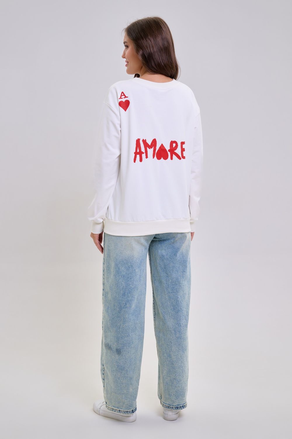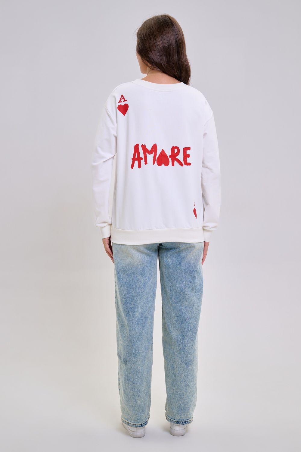 Женский свитшот свободного прямого кроя с круглой горловиной и слегка приспущенными плечами. На спинке нанесён принт в виде надписи "AMORE". Выполнен из мягкого и приятного материала — футера 2-х нитки, обеспечивающего дополнительный комфорт и сохранение тепла даже в холодную погоду. Доступен в сдвоенных размерах, что удобно для подбора идеальной посадки. Подходит как для повседневной носки, так и для создания эффектных образов в любом стиле.
