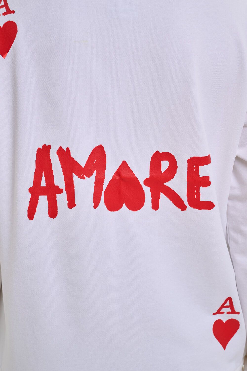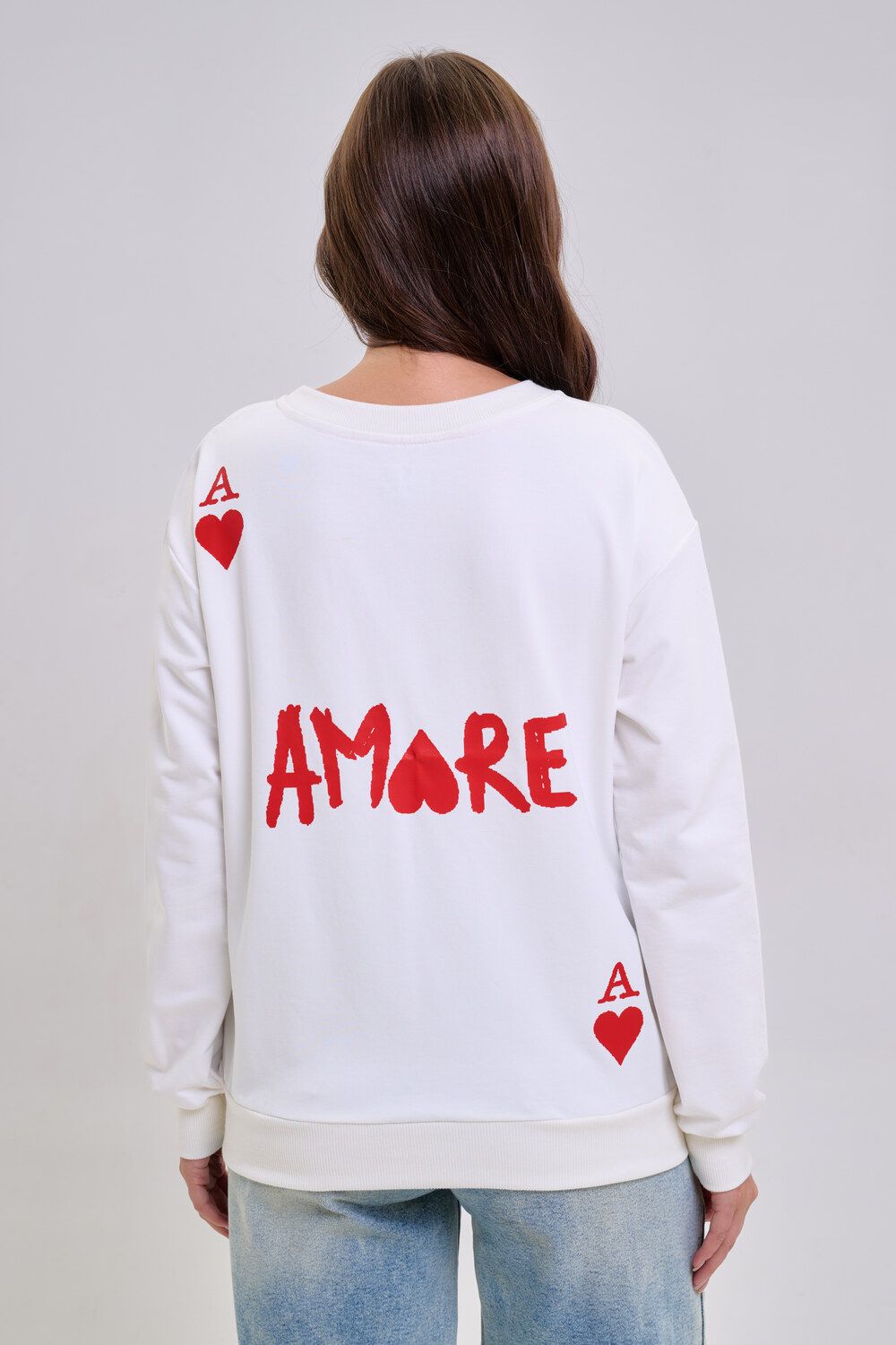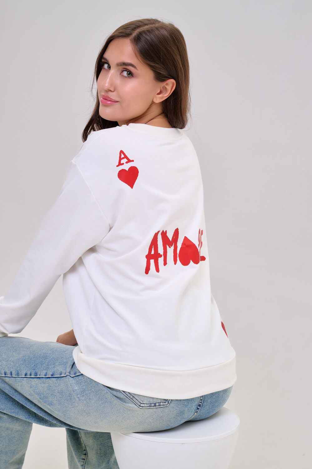 Женский свитшот свободного прямого кроя с круглой горловиной и слегка приспущенными плечами. На спинке нанесён принт в виде надписи "AMORE". Выполнен из мягкого и приятного материала — футера 2-х нитки, обеспечивающего дополнительный комфорт и сохранение тепла даже в холодную погоду. Доступен в сдвоенных размерах, что удобно для подбора идеальной посадки. Подходит как для повседневной носки, так и для создания эффектных образов в любом стиле.