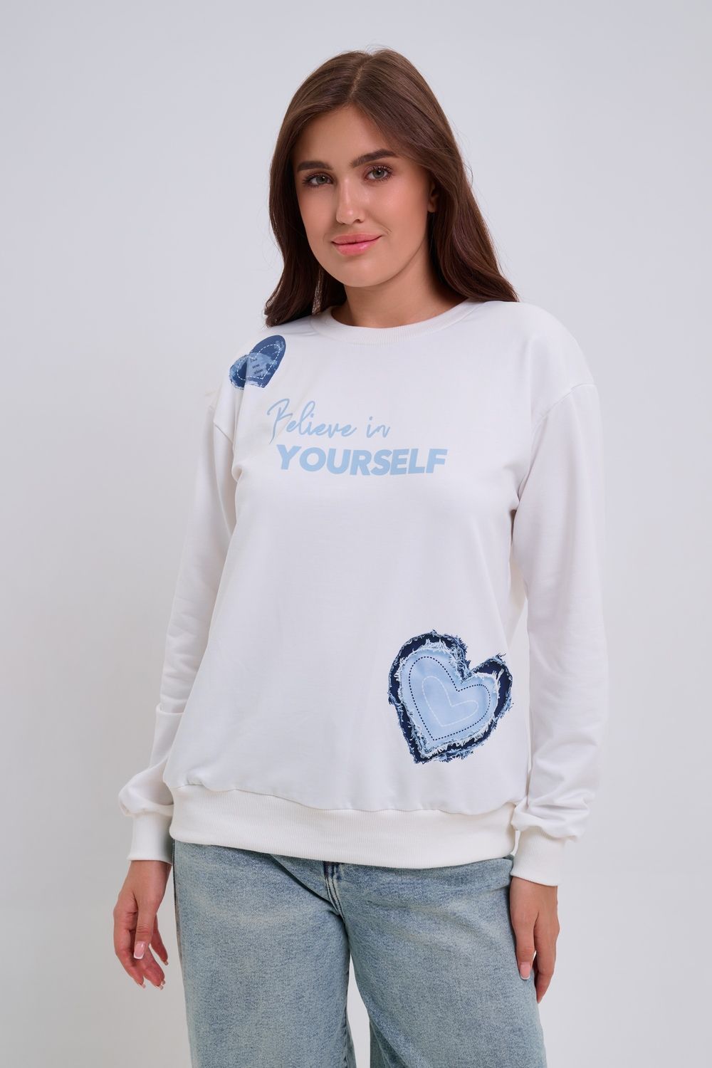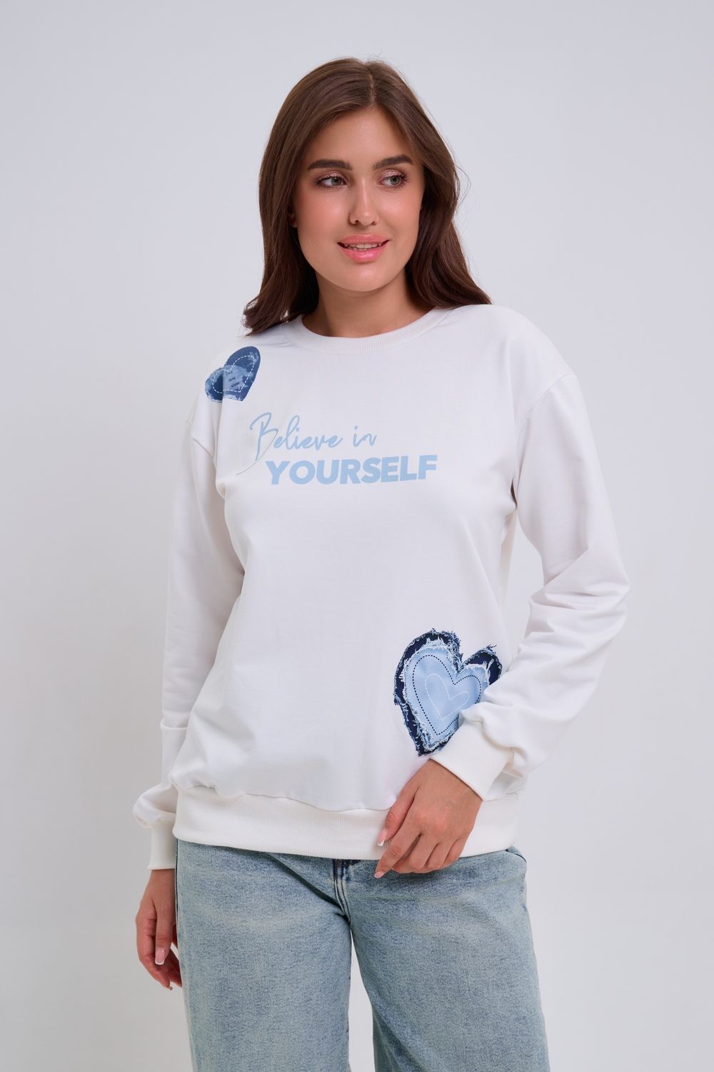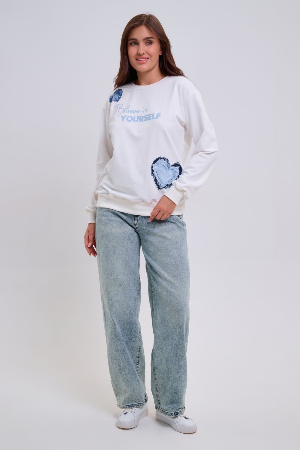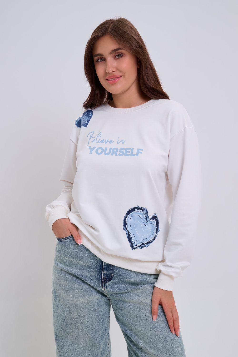 Женский свитшот свободного прямого кроя с круглой горловиной и слегка приспущенными плечами. Спереди нанесён принт в виде сердец и надписи. Выполнен из мягкого и приятного материала — футера 2-х нитки, обеспечивающего дополнительный комфорт и сохранение тепла даже в холодную погоду. Доступен в сдвоенных размерах, что удобно для подбора идеальной посадки. Подходит как для повседневной носки, так и для создания эффектных образов в любом стиле.