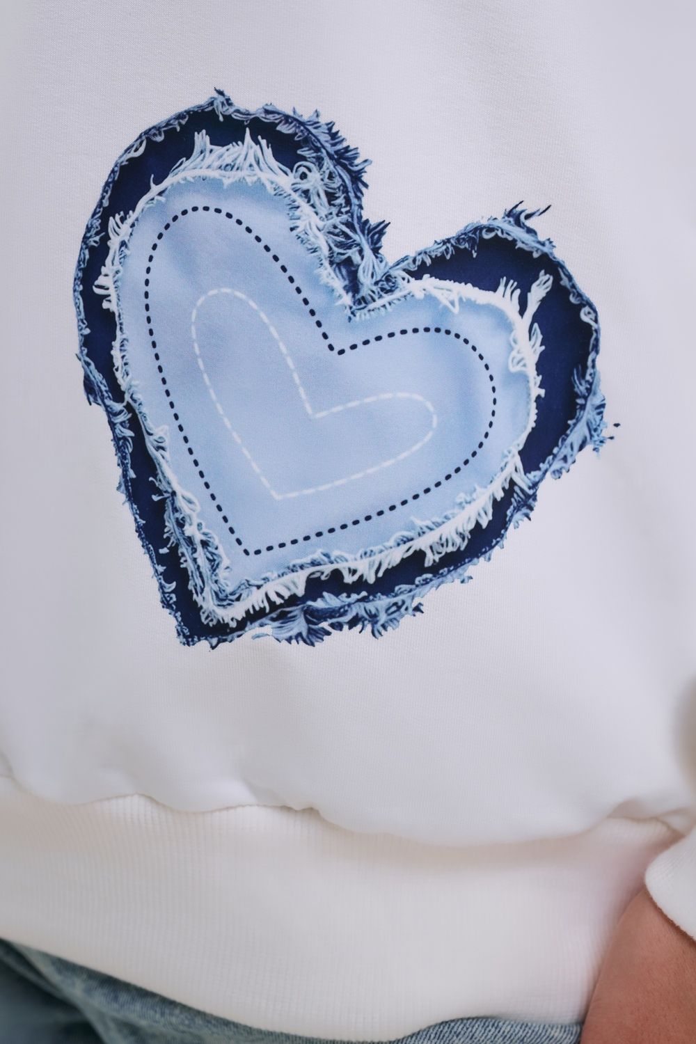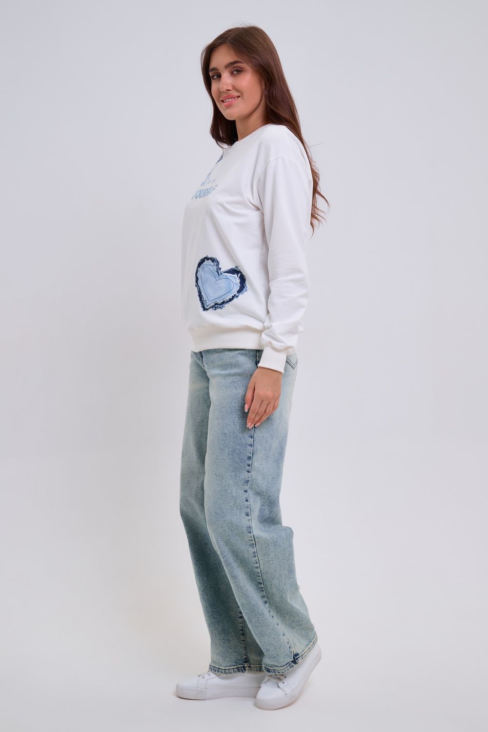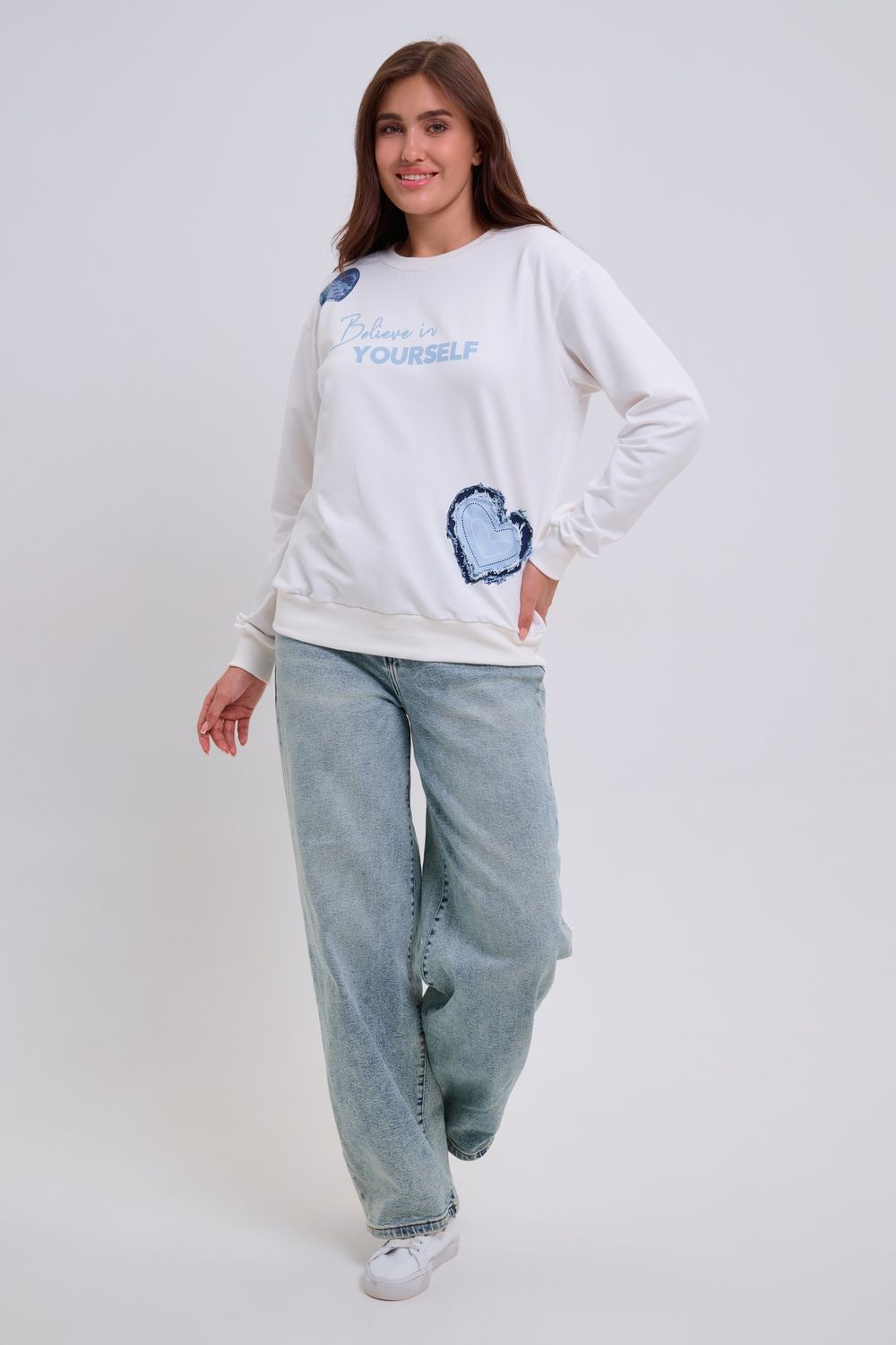 Женский свитшот свободного прямого кроя с круглой горловиной и слегка приспущенными плечами. Спереди нанесён принт в виде сердец и надписи. Выполнен из мягкого и приятного материала — футера 2-х нитки, обеспечивающего дополнительный комфорт и сохранение тепла даже в холодную погоду. Доступен в сдвоенных размерах, что удобно для подбора идеальной посадки. Подходит как для повседневной носки, так и для создания эффектных образов в любом стиле.