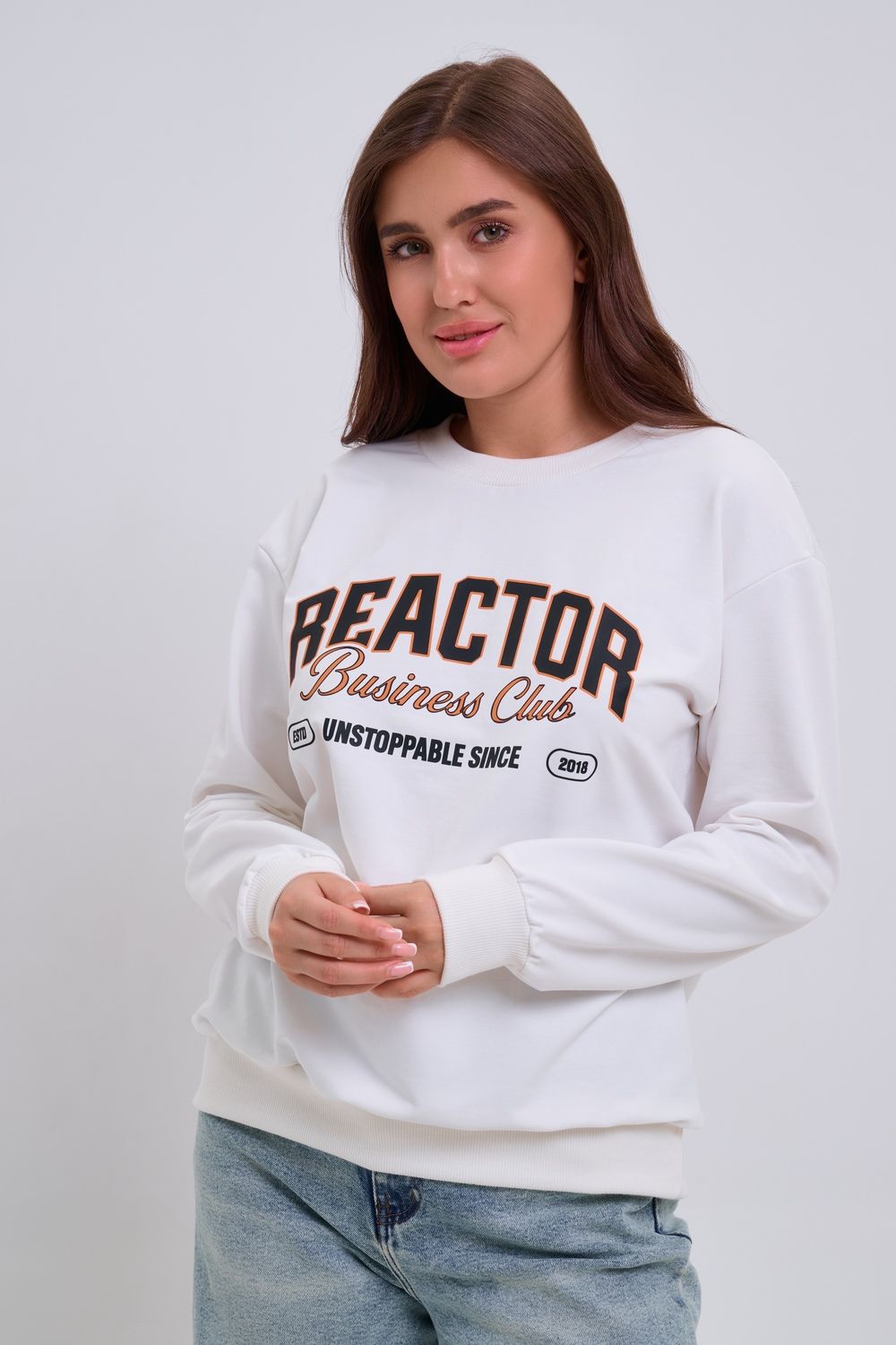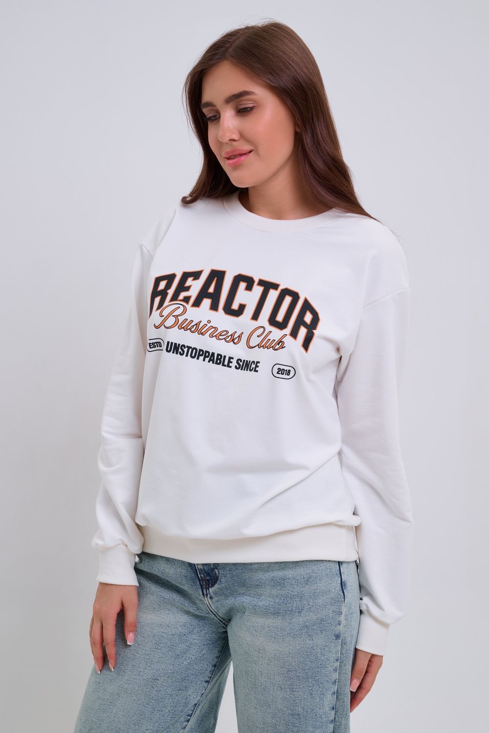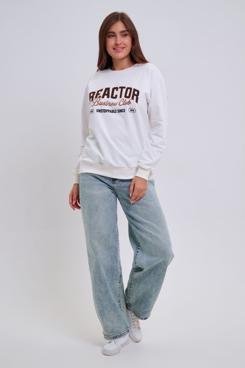 Женский свитшот свободного прямого кроя с круглой горловиной и слегка приспущенными плечами. Спереди нанесён принт в виде надписи "REACTOR". Выполнен из мягкого и приятного материала — футера 2-х нитки, обеспечивающего дополнительный комфорт и сохранение тепла даже в холодную погоду. Доступен в сдвоенных размерах, что удобно для подбора идеальной посадки. Подходит как для повседневной носки, так и для создания эффектных образов в любом стиле.