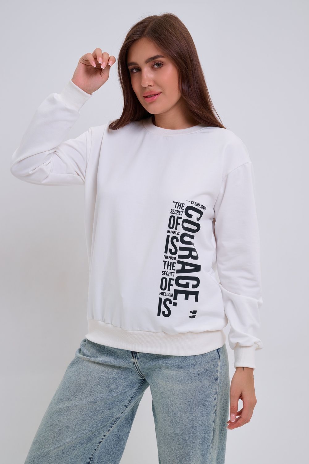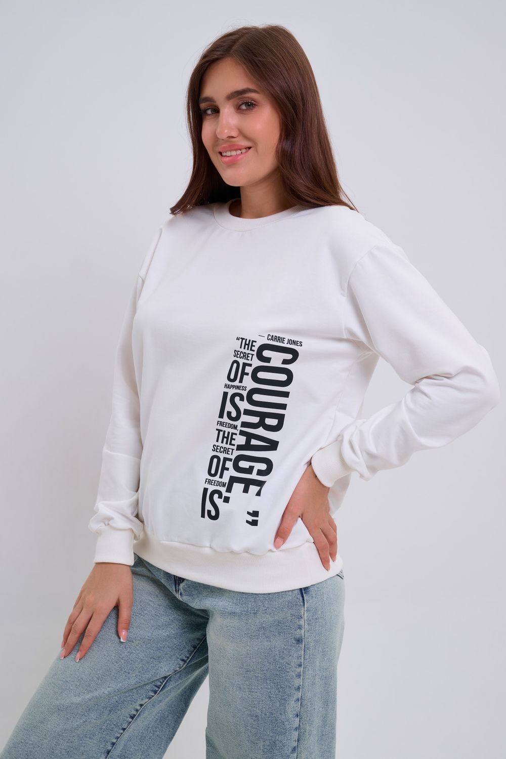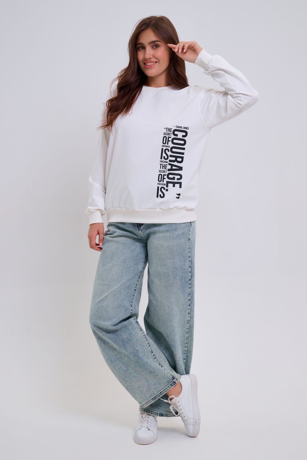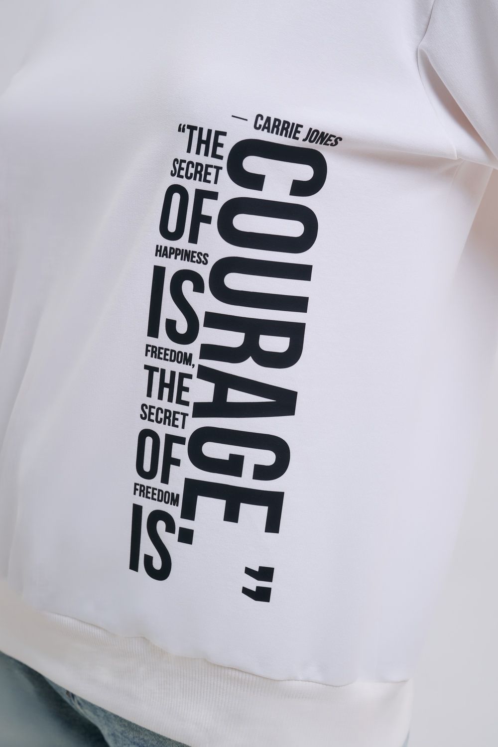 Женский свитшот свободного прямого кроя с круглой горловиной и слегка приспущенными плечами. Спереди нанесён принт в виде надписи "COURAGE". Выполнен из мягкого и приятного материала — футера 2-х нитки, обеспечивающего дополнительный комфорт и сохранение тепла даже в холодную погоду. Доступен в сдвоенных размерах, что удобно для подбора идеальной посадки. Подходит как для повседневной носки, так и для создания эффектных образов в любом стиле.