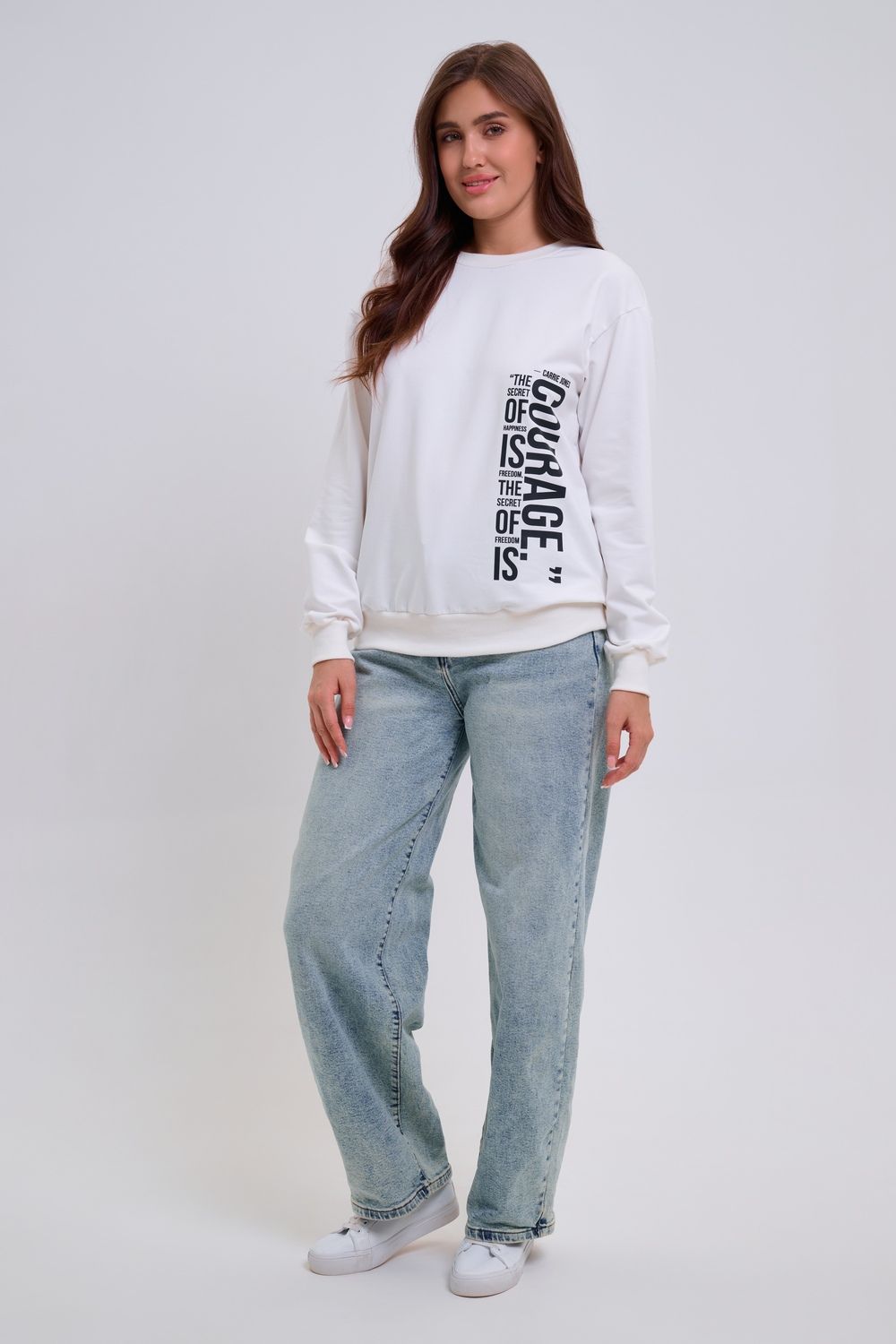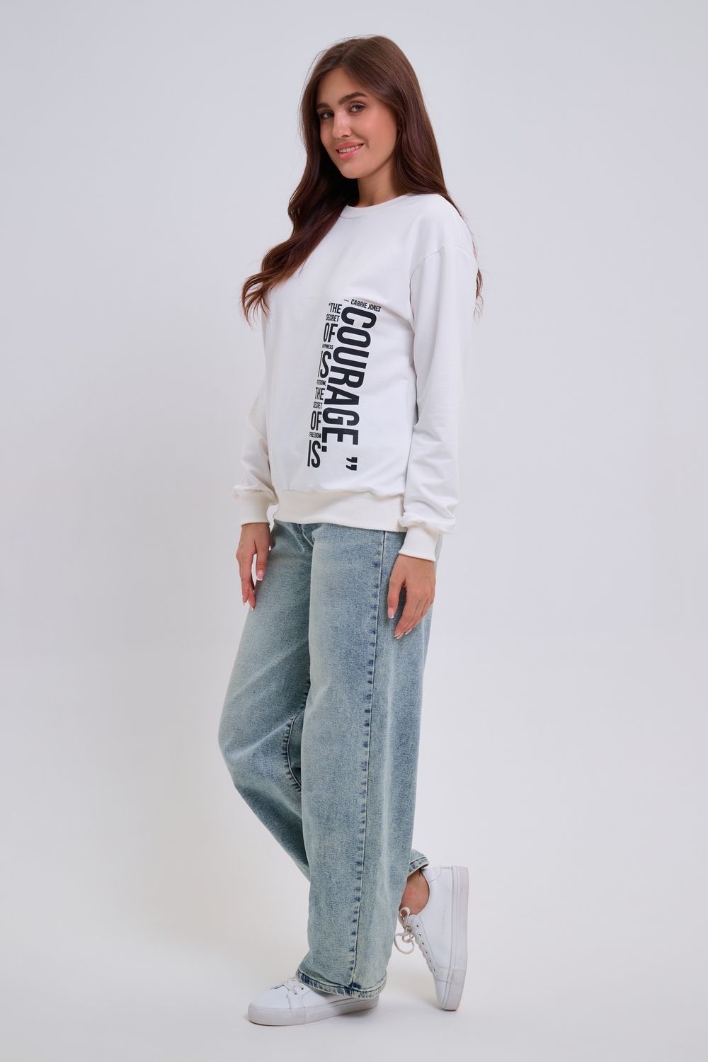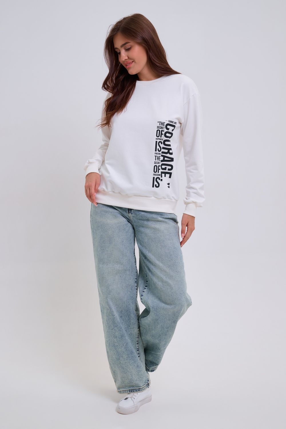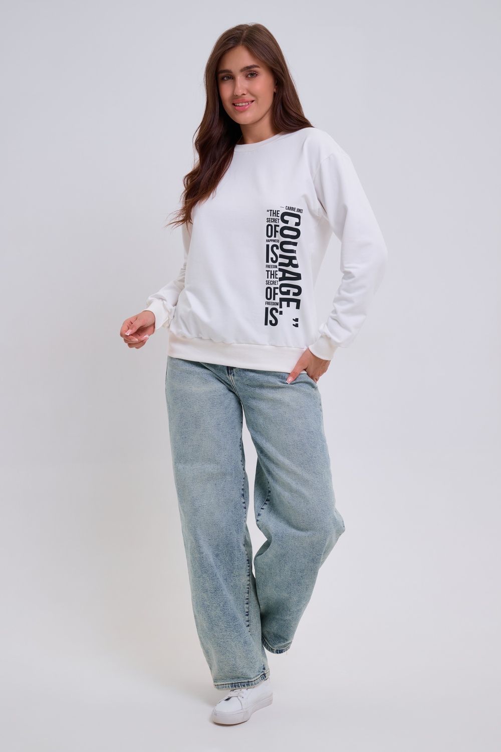 Женский свитшот свободного прямого кроя с круглой горловиной и слегка приспущенными плечами. Спереди нанесён принт в виде надписи "COURAGE". Выполнен из мягкого и приятного материала — футера 2-х нитки, обеспечивающего дополнительный комфорт и сохранение тепла даже в холодную погоду. Доступен в сдвоенных размерах, что удобно для подбора идеальной посадки. Подходит как для повседневной носки, так и для создания эффектных образов в любом стиле.