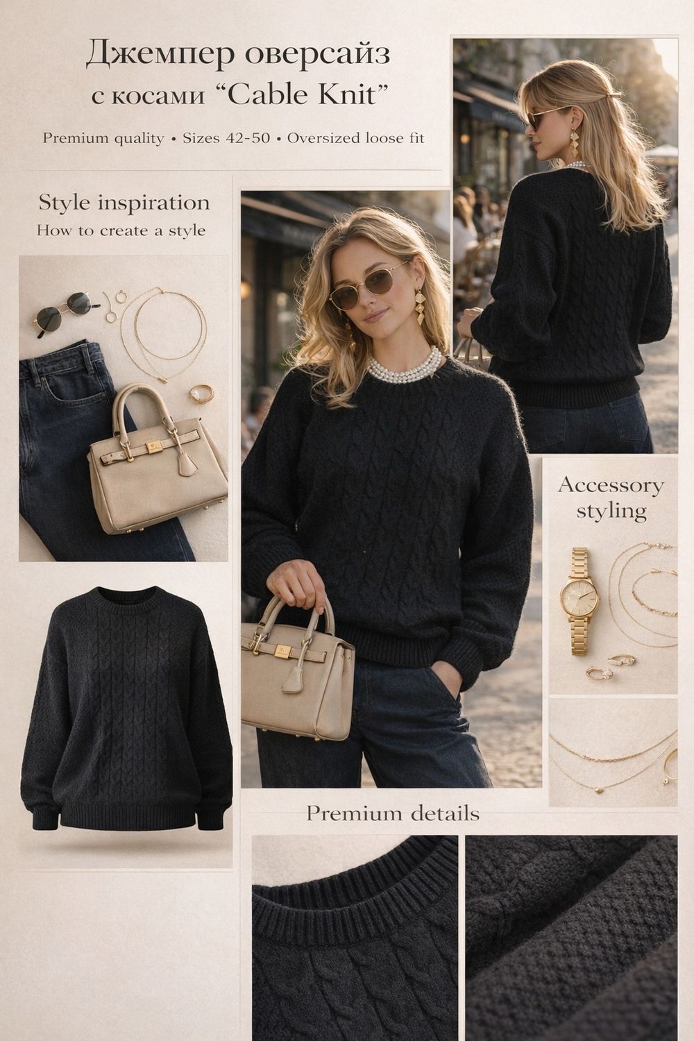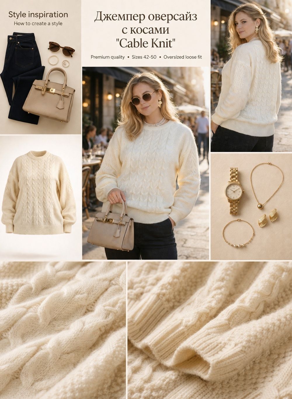 Джемпер оверсайз с косами "Cable Knit" арт. 2026 актуальный вязаный джемпер оверсайз с эффектным узором из кос — идеальное сочетание уюта, стиля и качества. Эта модель выполнена из современного акрила, который по своим характеристикам превосходит многие натуральные материалы — это инновационная пряжа, которая обладает мягкостью и приятной текстурой. Материал специально разработан для создания комфортной одежды: он не колется, не вызывает аллергии и раздражения даже на чувствительной коже. Волокно отлично сохраняет тепло, при этом позволяя коже дышать. Акрил не деформируется, не скатывается и сохраняет первозданный вид после многочисленных стирок.