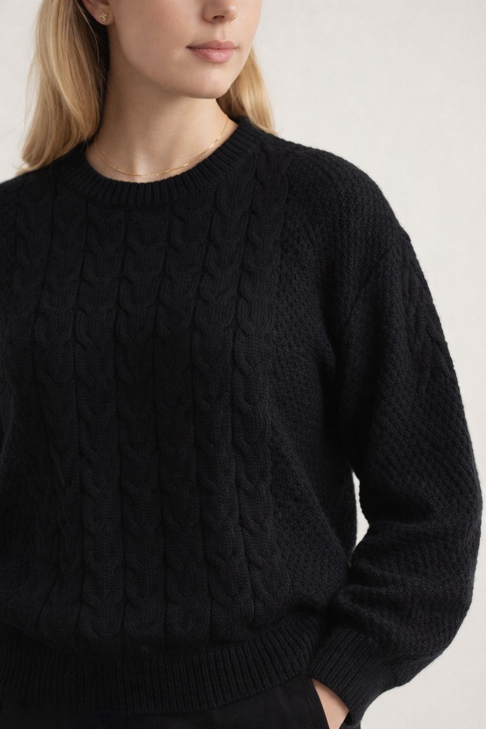 Дизайн: Джемпер украшен объемным узором из кос на передней части изделия — это классический элемент вязаной моды, который никогда не выходит из трендов. Косы создают фактурный рельеф, добавляя изделию элегантности и визуального объема. Рукава и спинка выполнены более легкой ажурной вязкой, что создает гармоничный баланс и не перегружает силуэт.