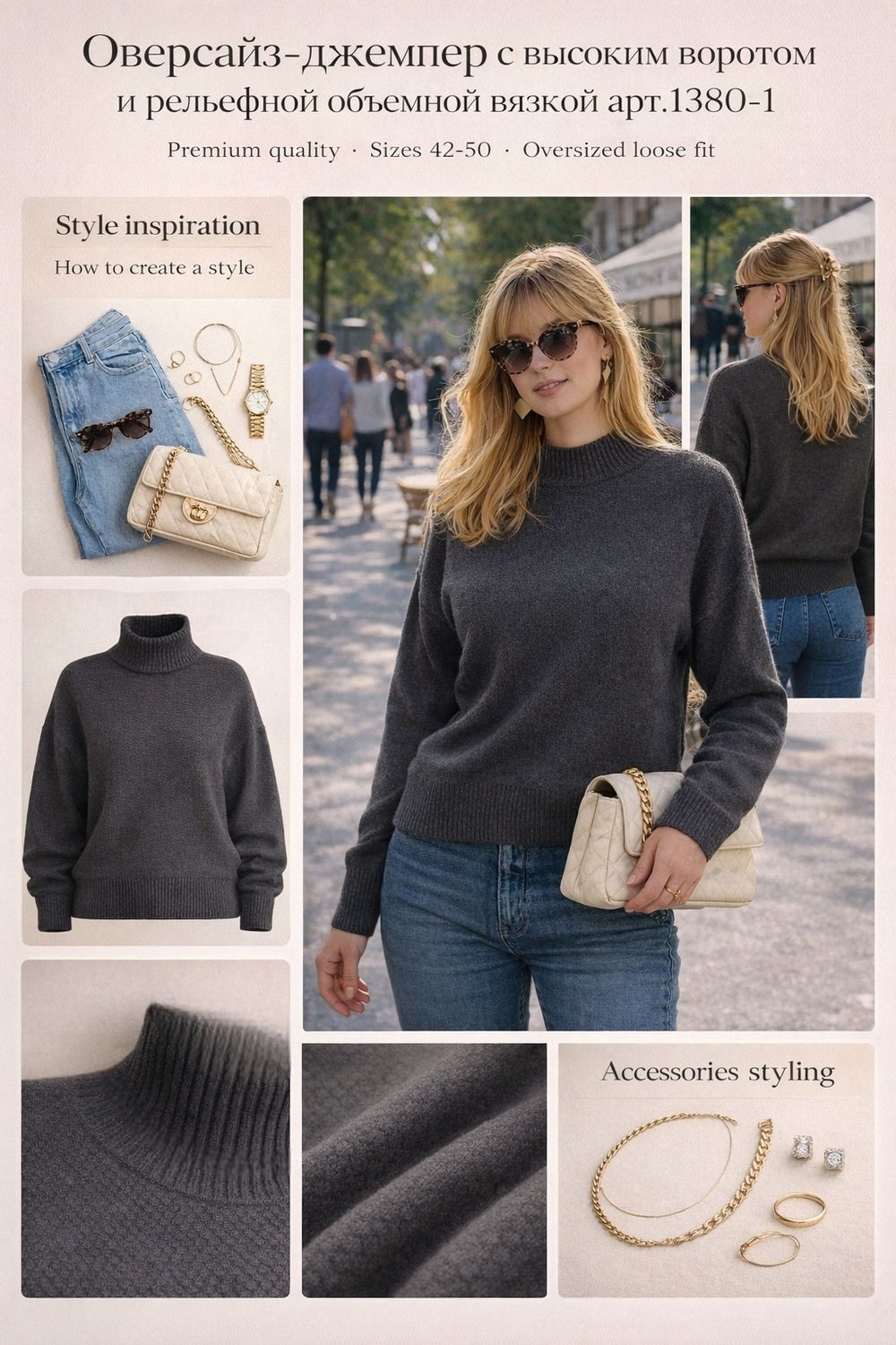Оверсайз-джемпер с высоким воротом и рельефной объемной вязкой арт.1380-1 — идеальный выбор для тех, кто ценит сочетание уюта и современного стиля. Этот лаконичный джемпер станет основой вашего капсульного гардероба, легко дополняя как повседневные, так и вечерние образы.