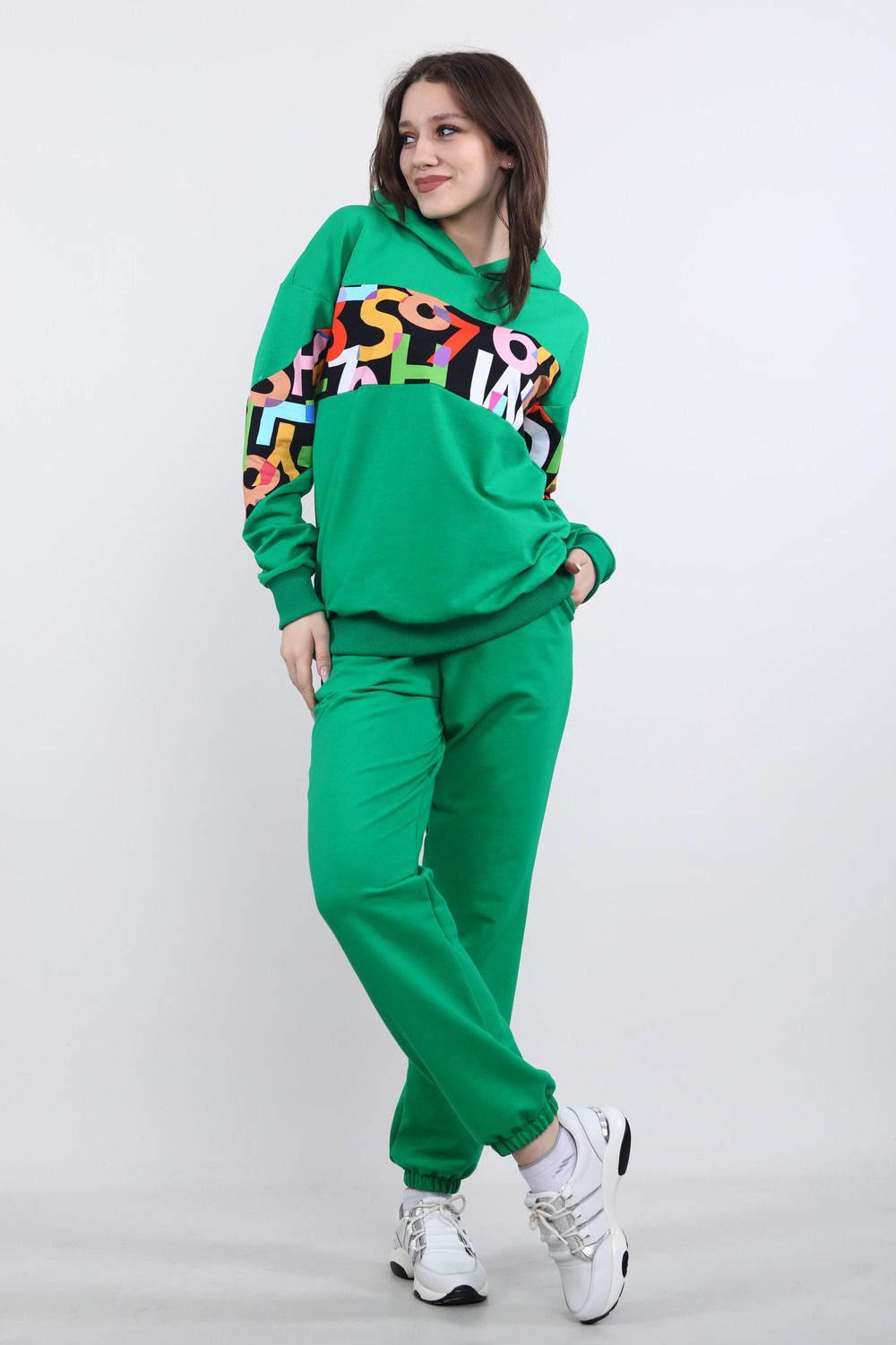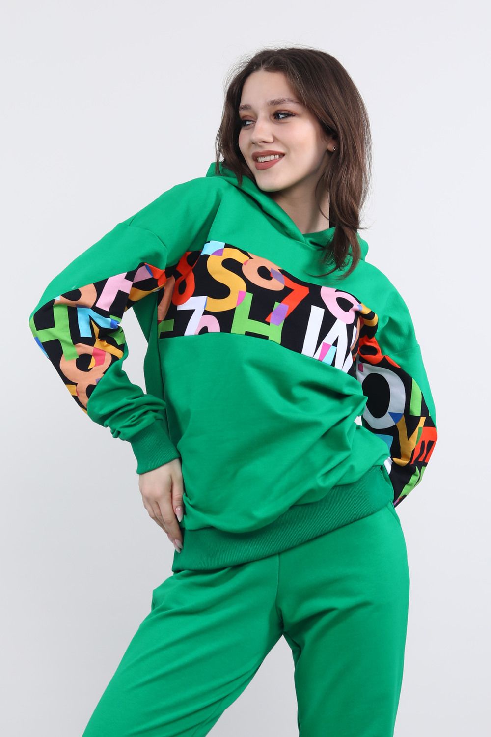 Толстовка с длинным рукавом в стиле оверсайз. Данная модель выполнена из трикотажного полотна футер с лайкрой. Горловина, манжеты по рукавам и низ отделаны трикотажным эластичным полотном кашкорсе. На изделии присутствуют вставки из цифровой печати. Отлична модель для приятного отдыха и прогулок.