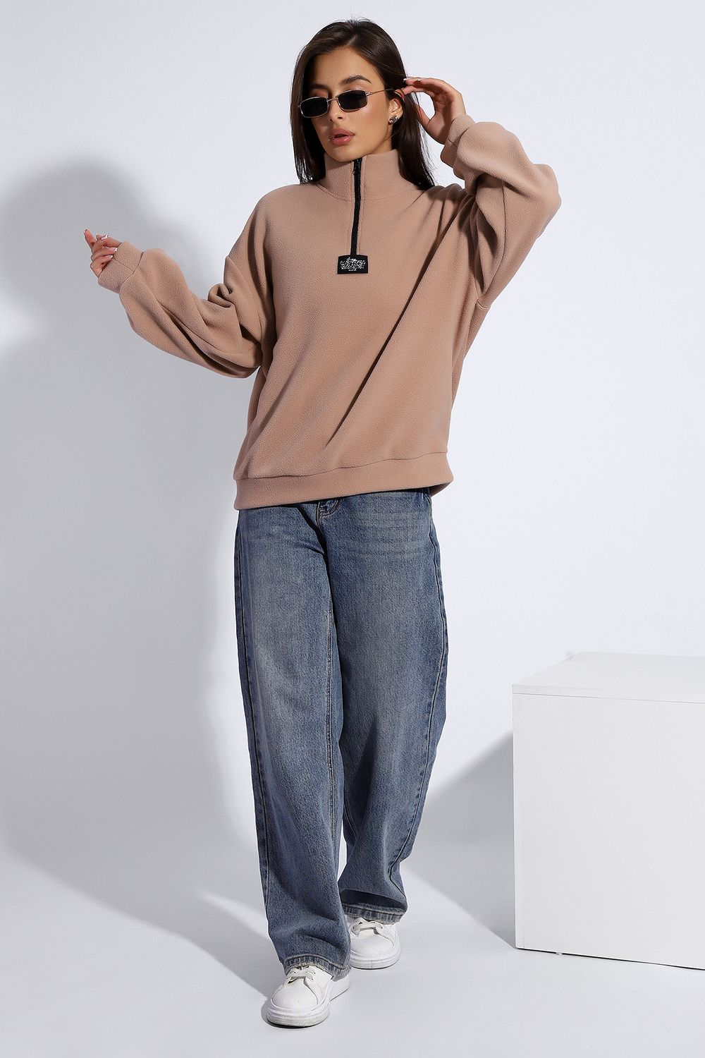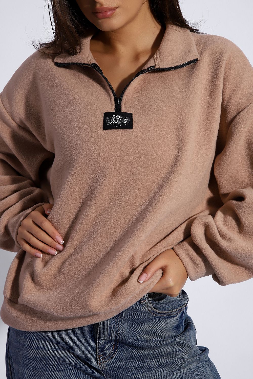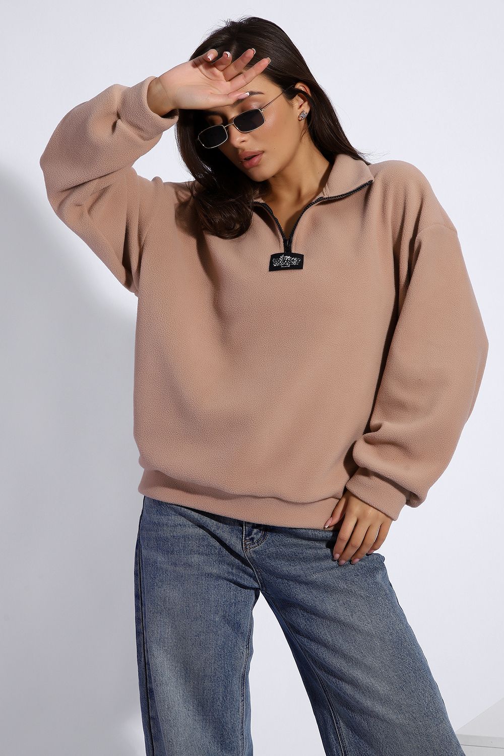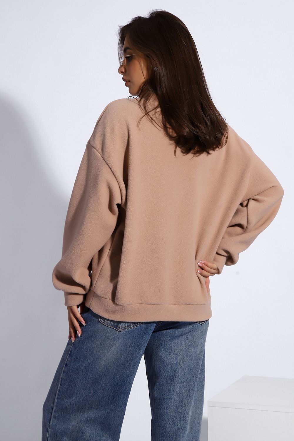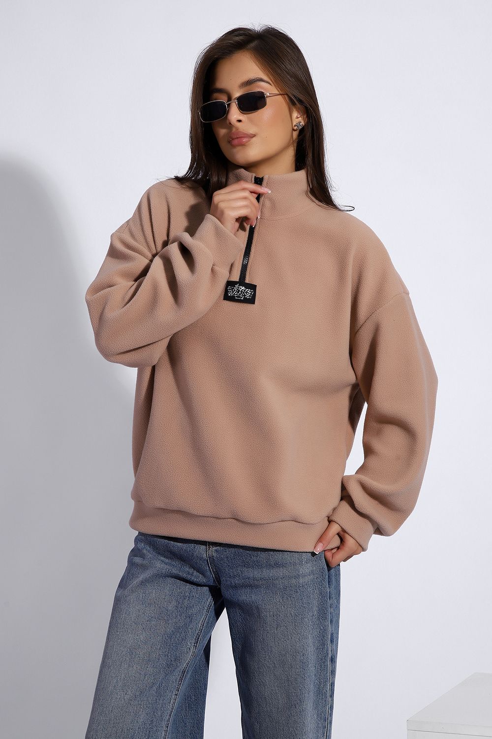 Уютная теплая толстовка из мягкого флиса. Воротник стойка, застежка молния-трактор, контрастная нашивка. Универсальный свободный крой оверсайз. Манжеты на рукавах и по низу изделия. На модели изделие 46-48 размера (параметры модели: рост 167 см., ОГ 85 см., ОТ 60 см., ОБ 89 см.)