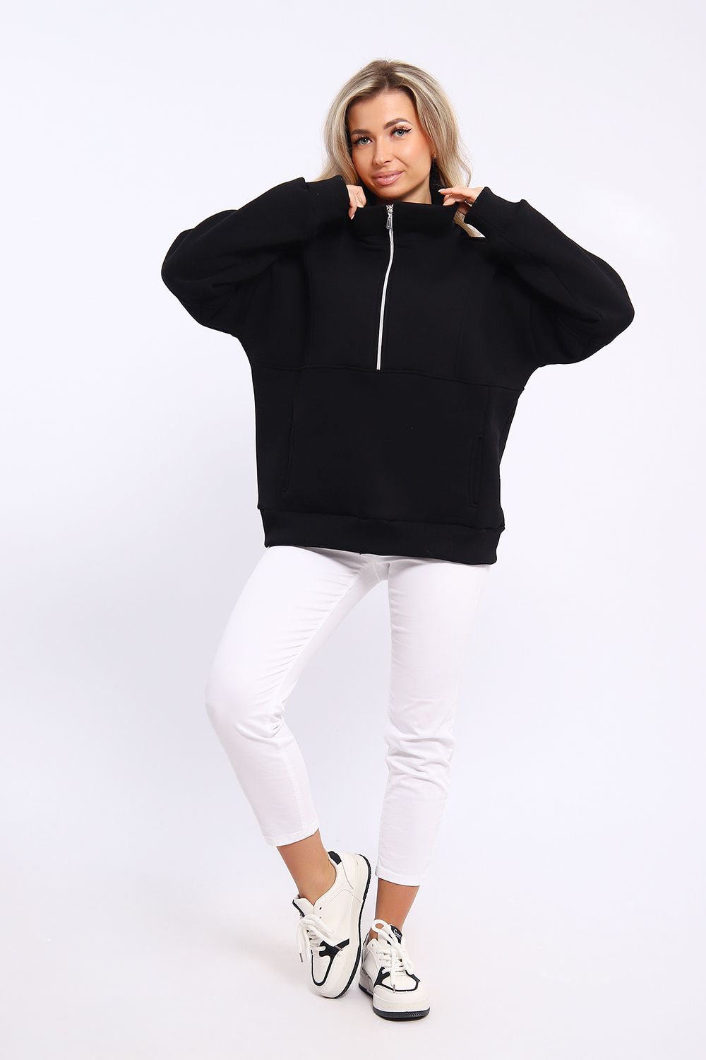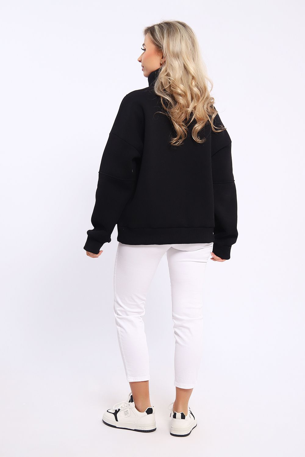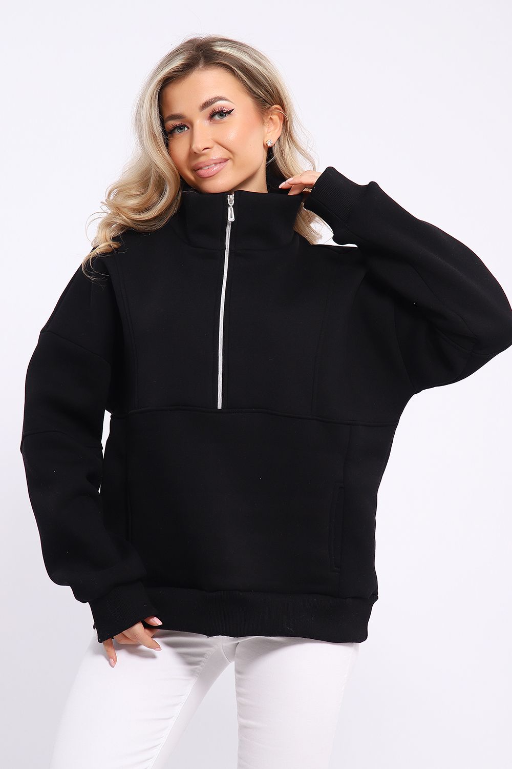 Толстовка свободного силуэта с длинными рукавами на спущенном плече. Рукава на манжетах. Воротник - стойка с застежкой на молнию.