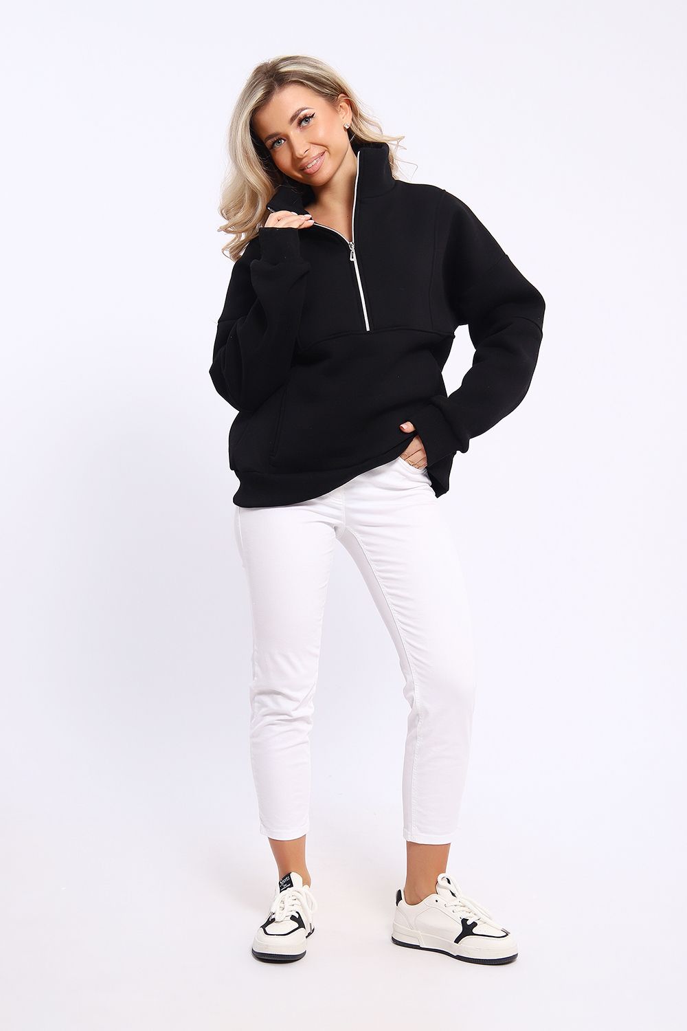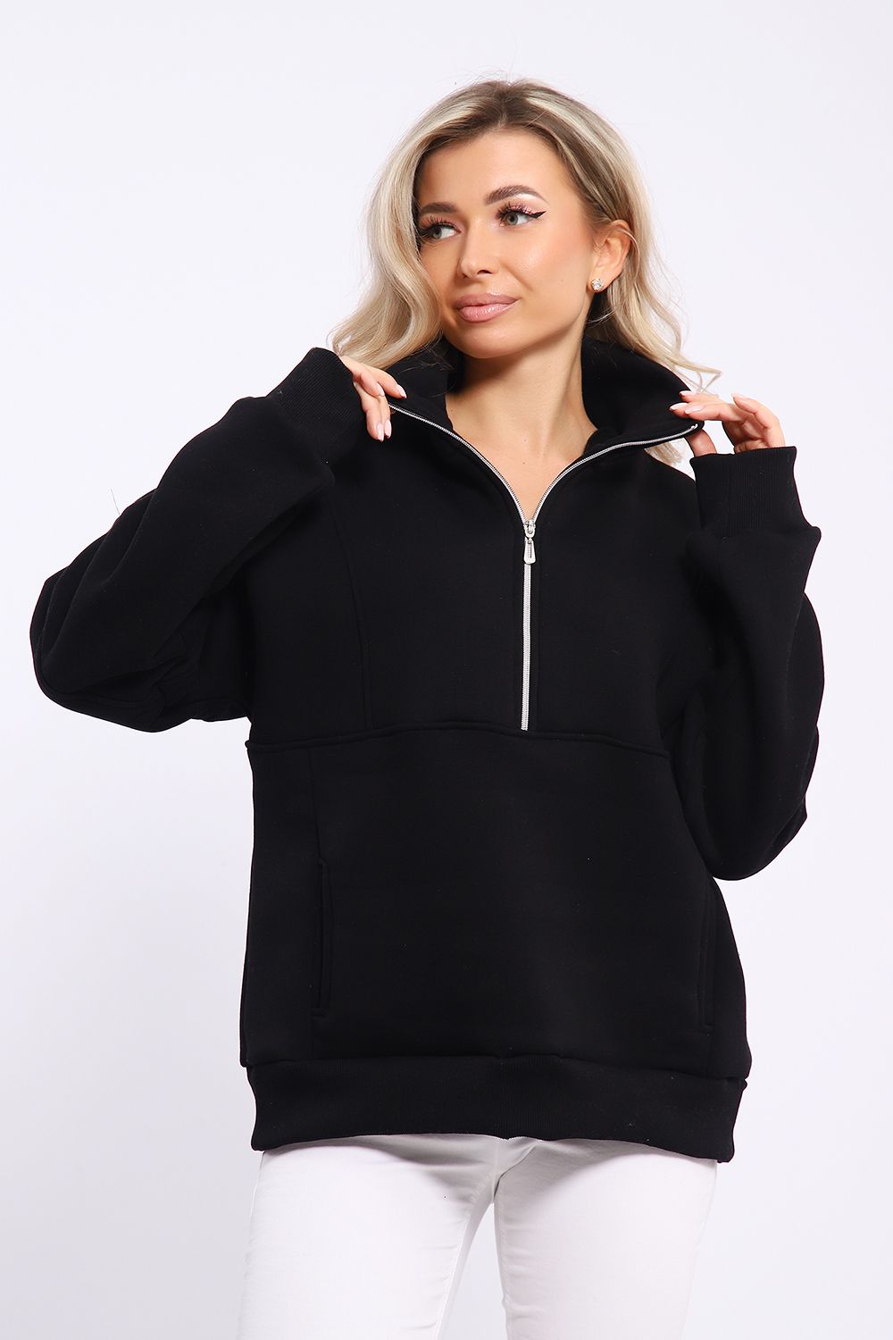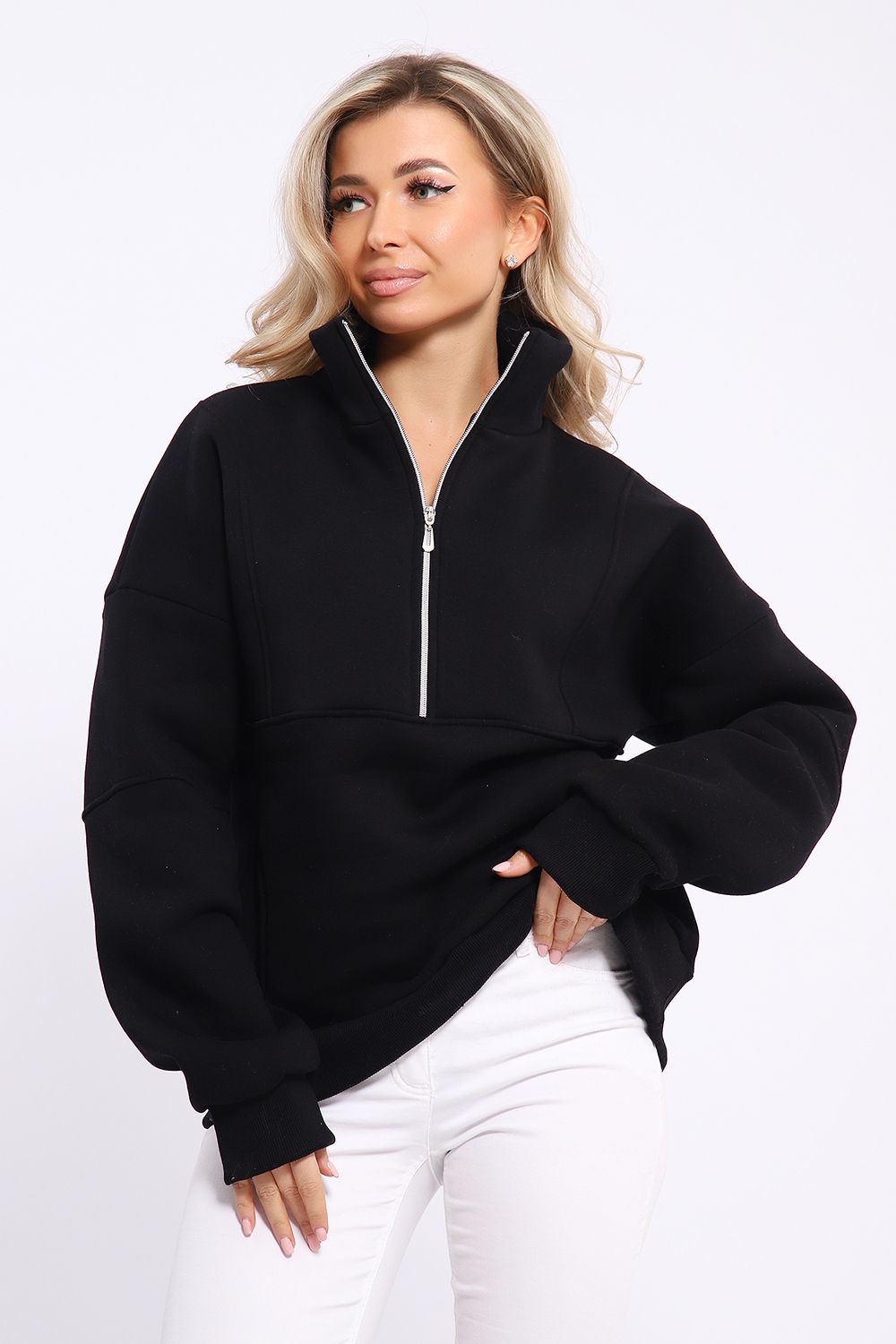 Толстовка свободного силуэта с длинными рукавами на спущенном плече. Рукава на манжетах. Воротник - стойка с застежкой на молнию.