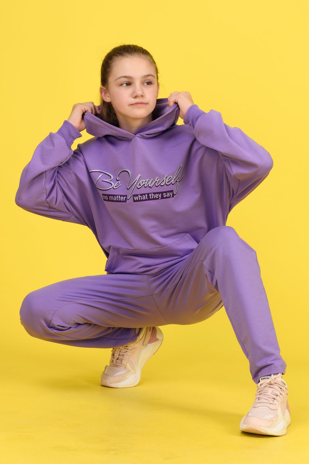Фиолетовая мода. Перевод текста: "Будь самим собой и не важно что о тебе говорят." Толстовка для подростков очень удобного и свободного кроя, линия плеча спущена, рукава удлинённые. Большой карман "кенгуру". В измерениях длина рукава указана от шва втачивания капюшона. Манжет и низ толстовки обработан плотной резинкой кашкорсе. Функциональность этой толстовки в том, что её можно комбинировать как с любимыми базовыми вещами Вашего гардероба, так и со свободными брюками - оверсайз №21513.