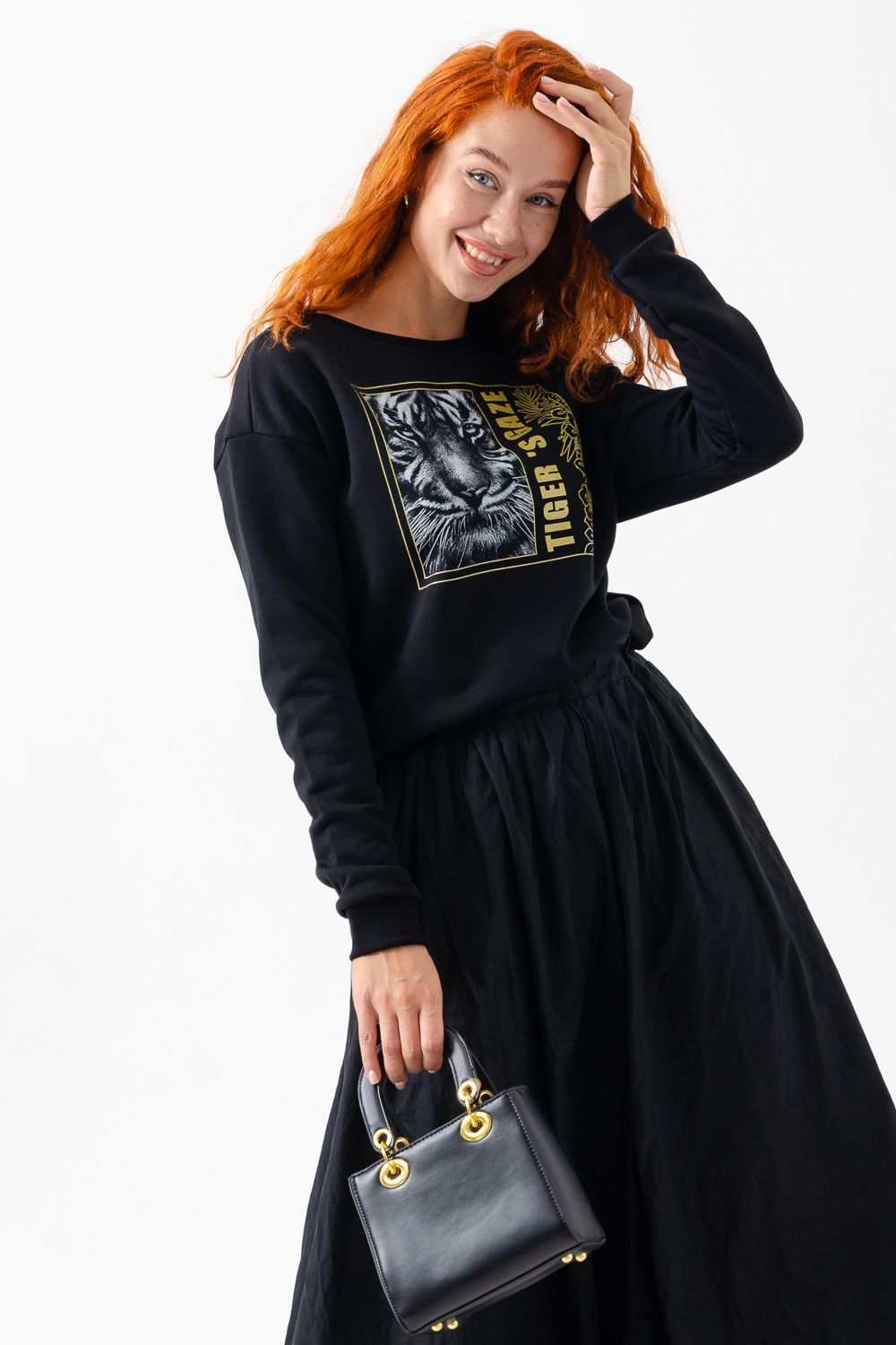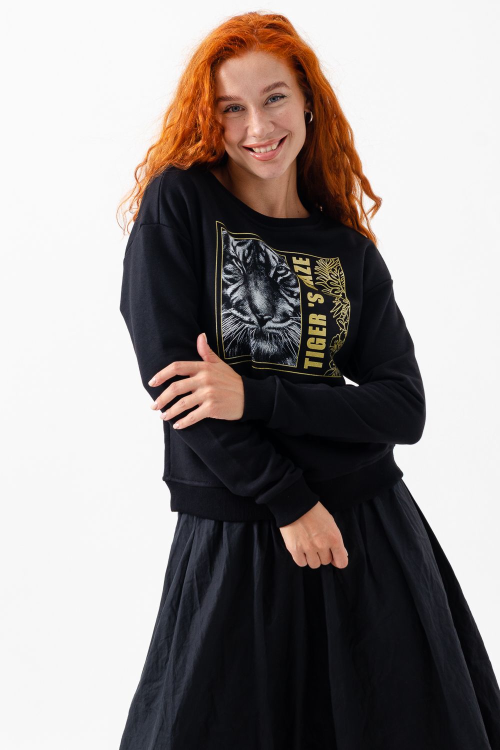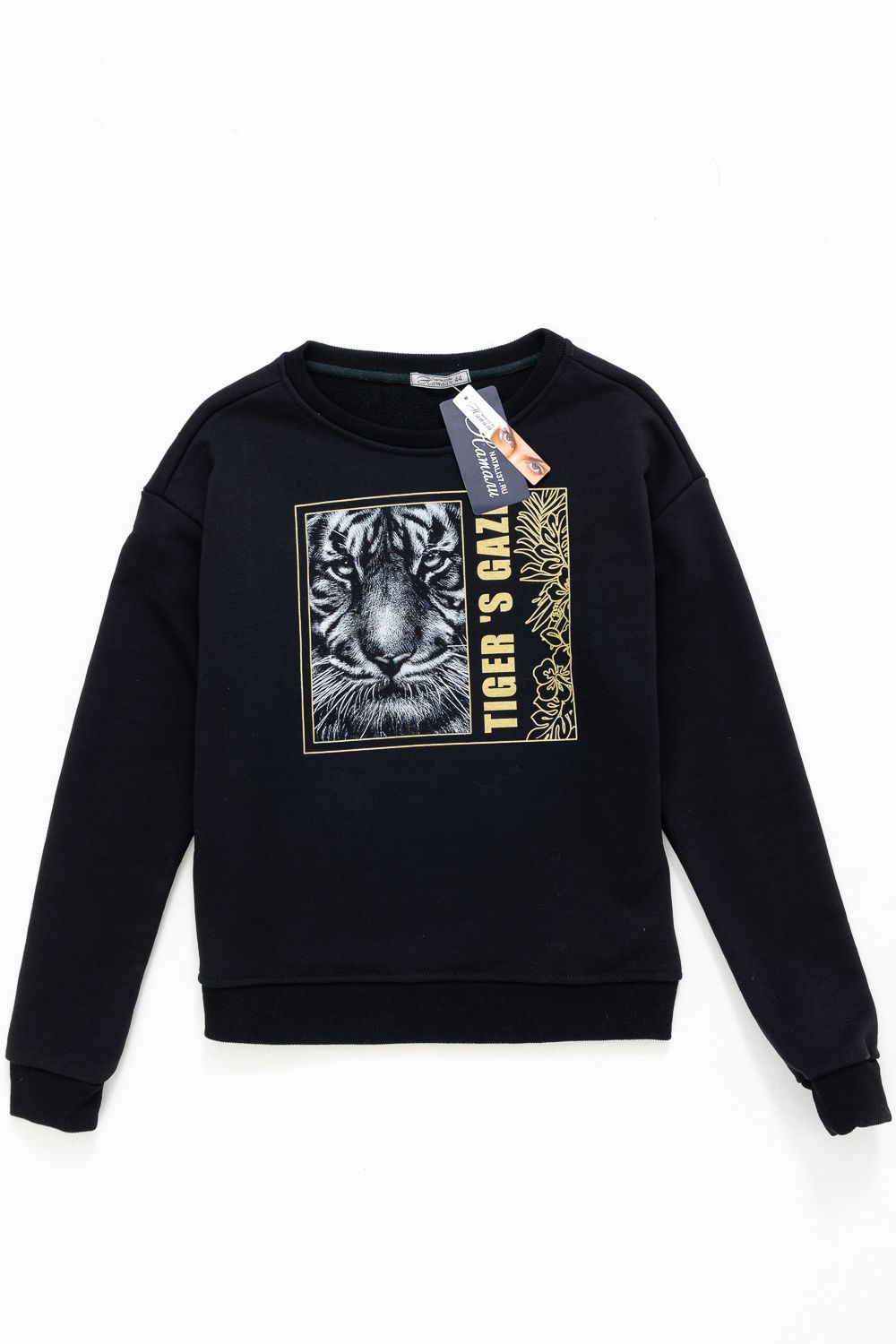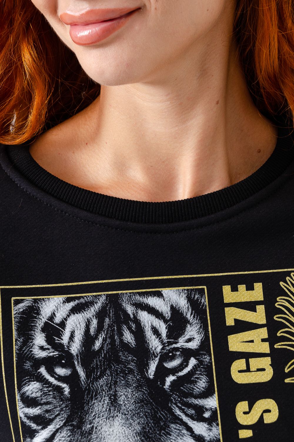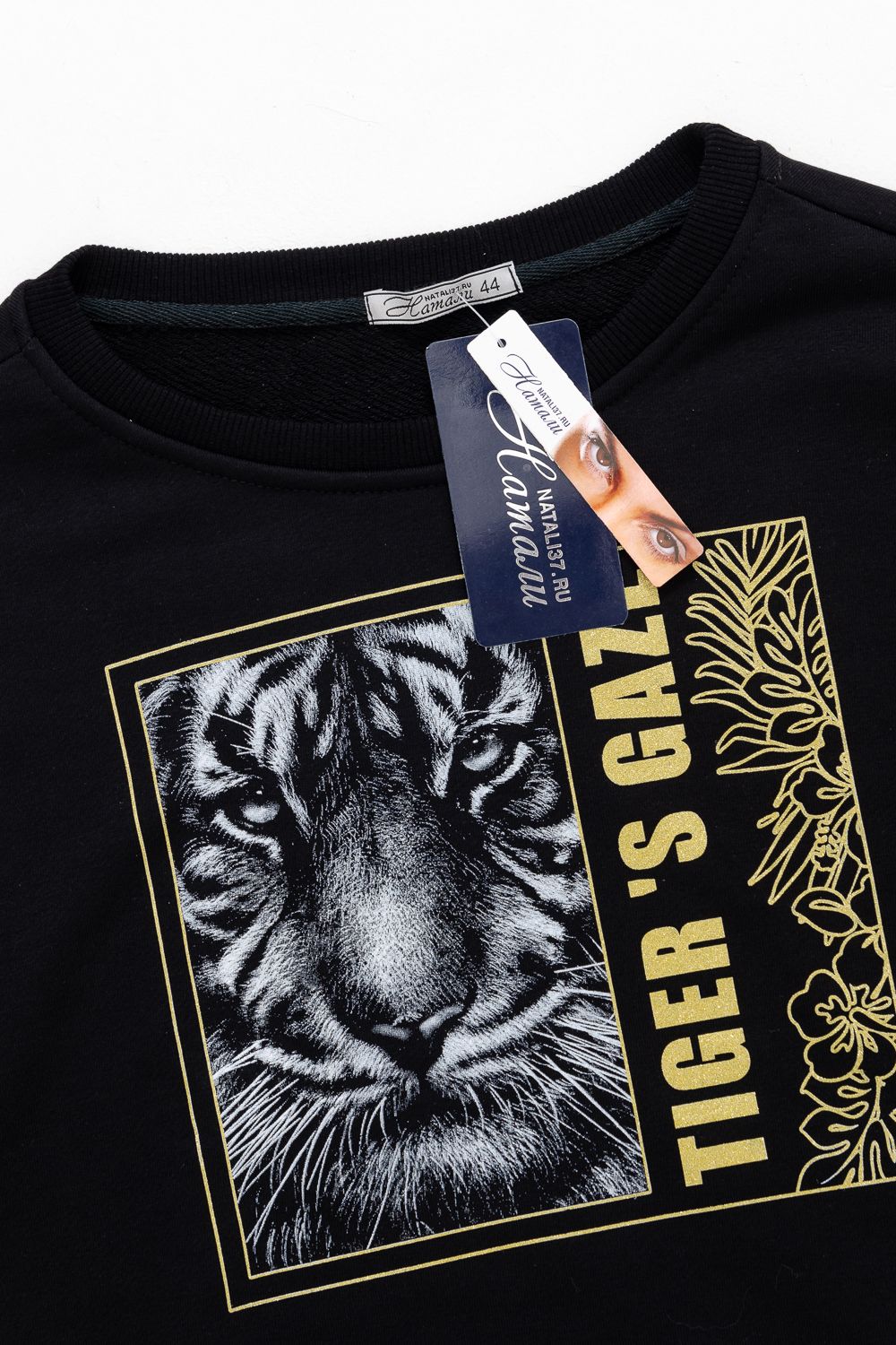Модная, стильная, удобная толстовка с красивым принтом - "Взгляд тигра". Шелкография с золотым глиттером. Благодаря наличию в составе 60% хлопка очень комфортна к телу. Горловина и низ обработаны декоративной строчкой. Шов на горловине спинки закрыт киперной лентой. Длина рукава в измерениях указана от основания шеи. Толстовка предназначена для активного отдыха и повседневной носки.
