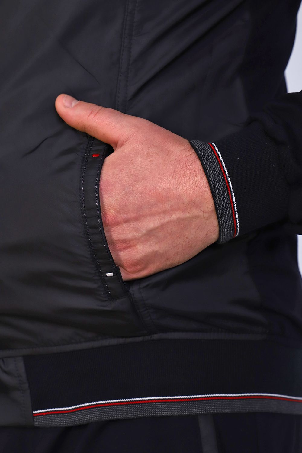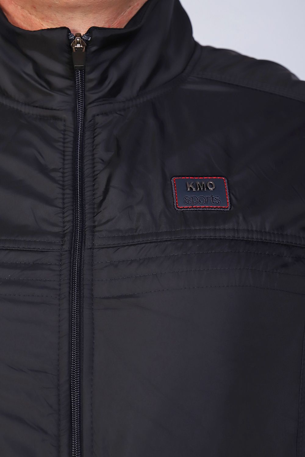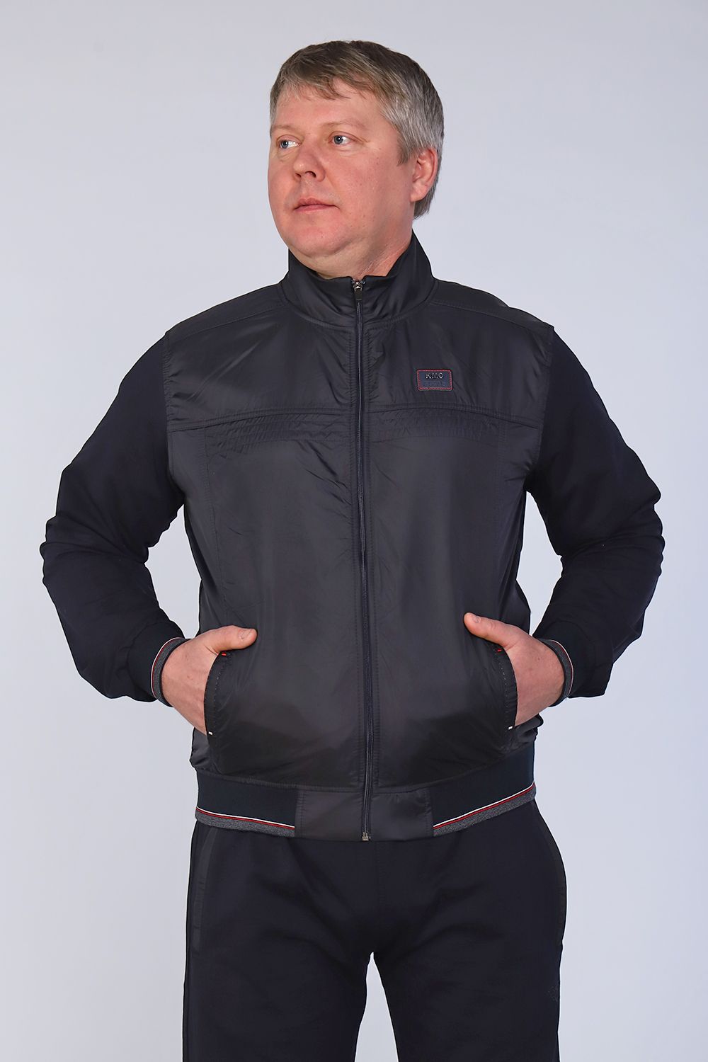 Стильная, спортивная мужская толстовка. Кофта на молнии, низ и рукава на манжетах, карманы декоративные на молнии. Передняя часть кофты с вставкой из плащевки, слева на груди декоративная эмблема, воротник - стойка.