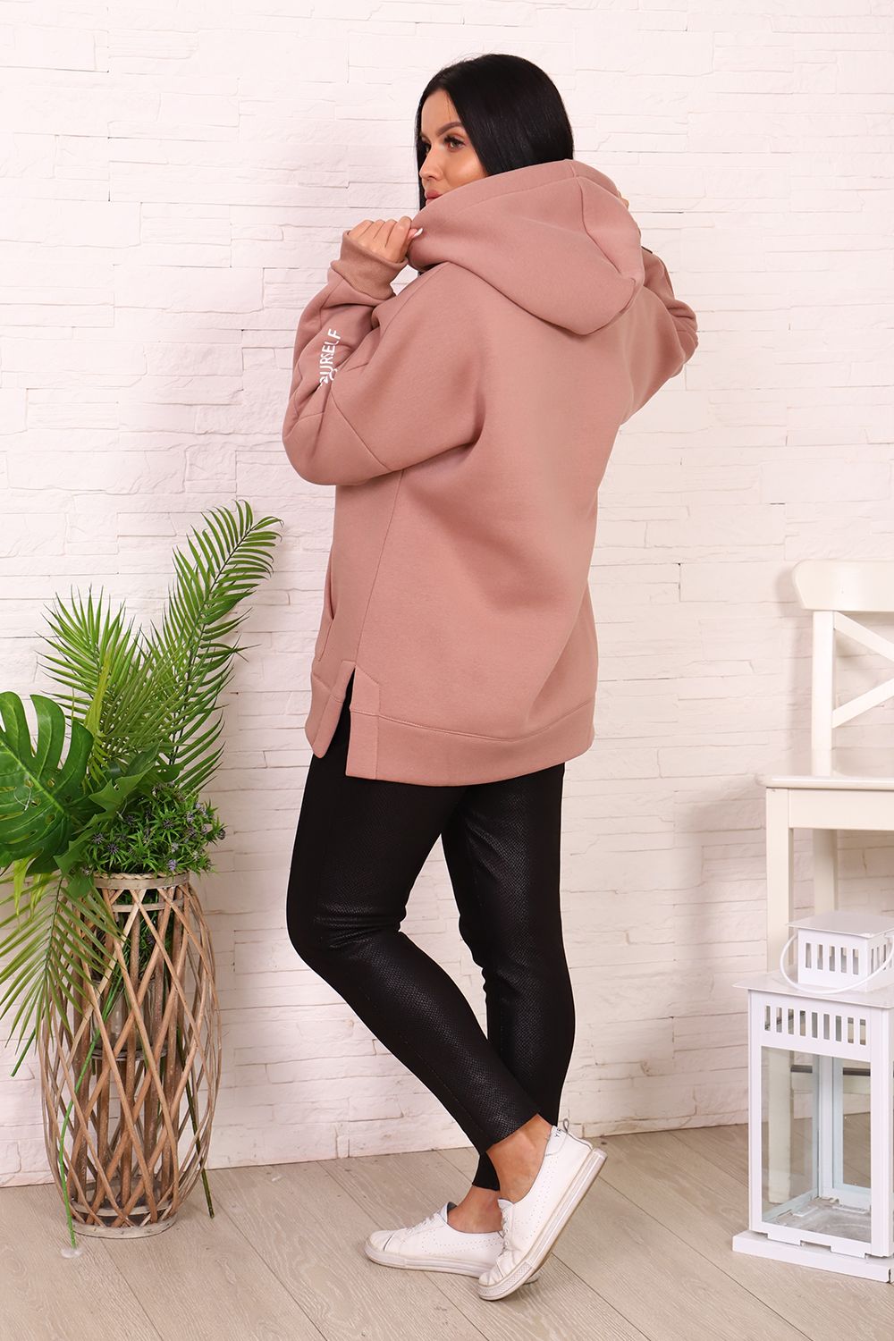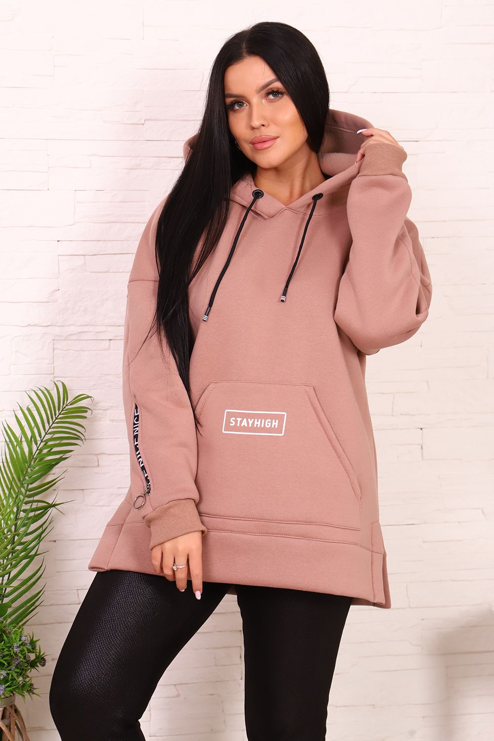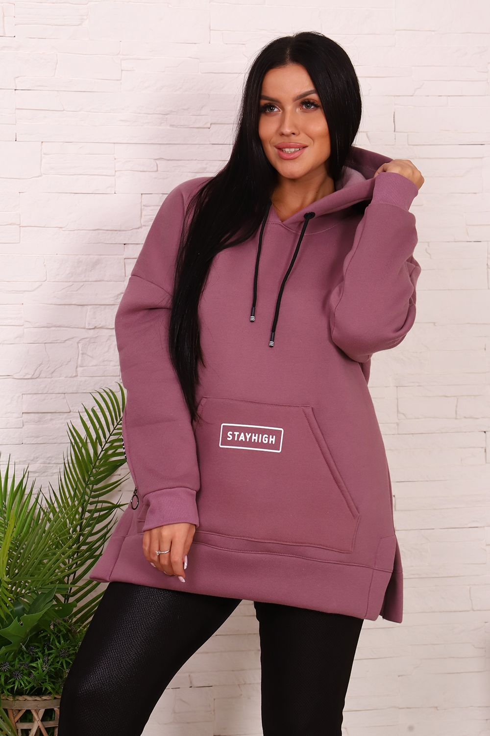 Толстовка женская со спущенным плечом, капюшоном, с декоративным шнурком. На полочке карман-кенгуру с печатью. На правом рукаве вшита декоративная молния, на левом - печать. По бокам толстовки небольшие разрезы. Низ толстовки оформлен широким поясом.