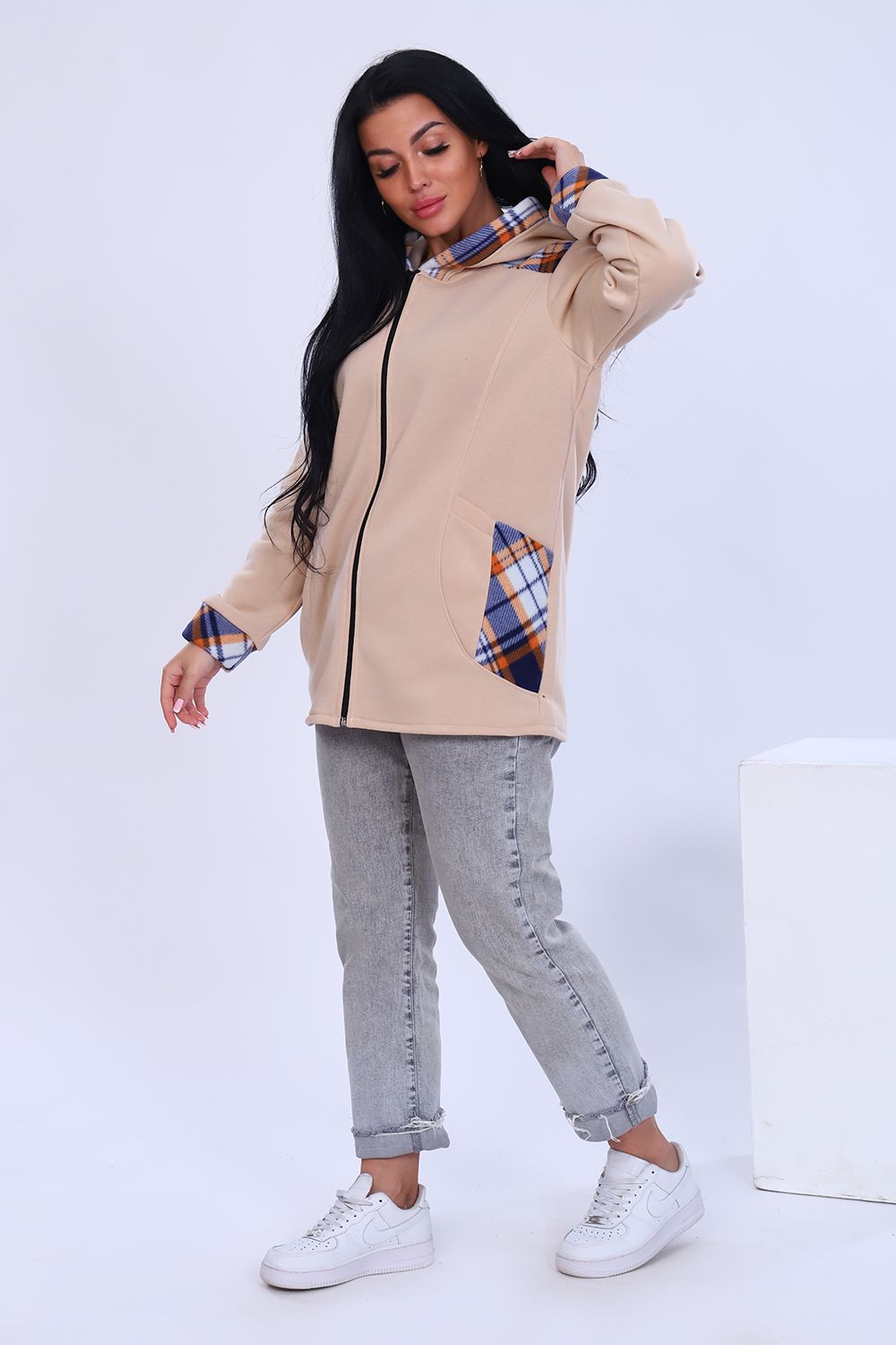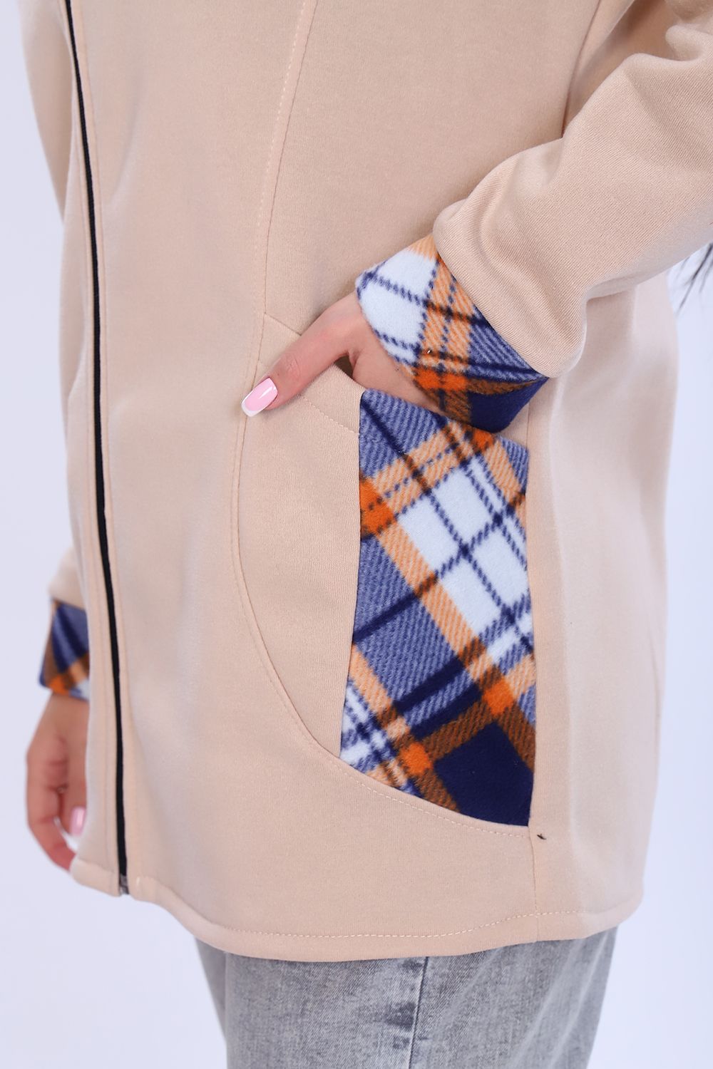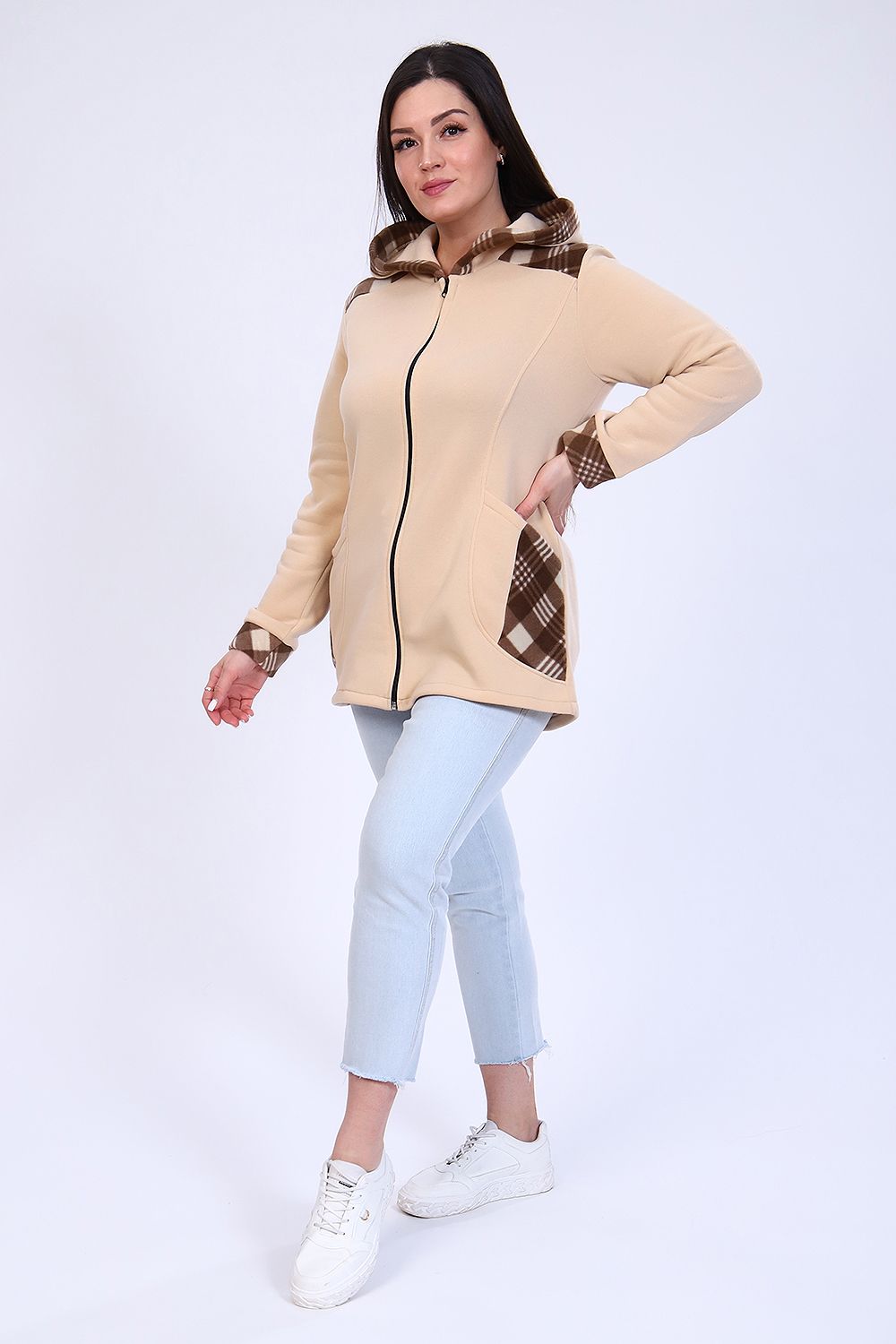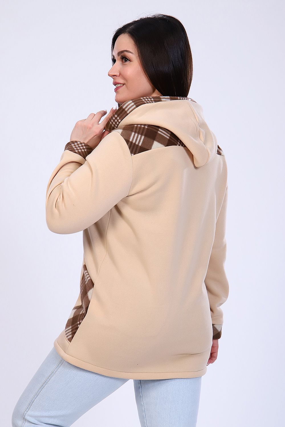 Толстовка женская утепленная на молнии с капюшоном. Длинный рукав на манжете, на передней полочке рельефы, в которых расположены карманы. Практично и удобно. В бежевой расцветке возможны вставки коричневого и рыжего цветов.