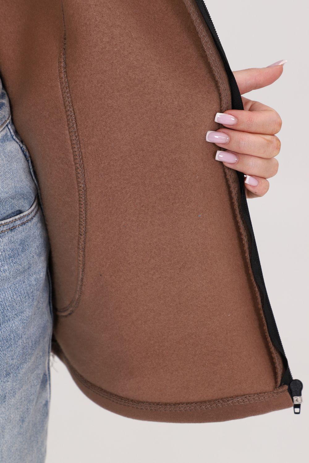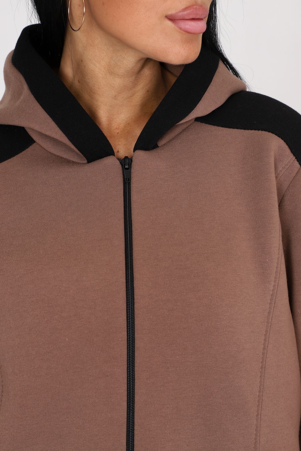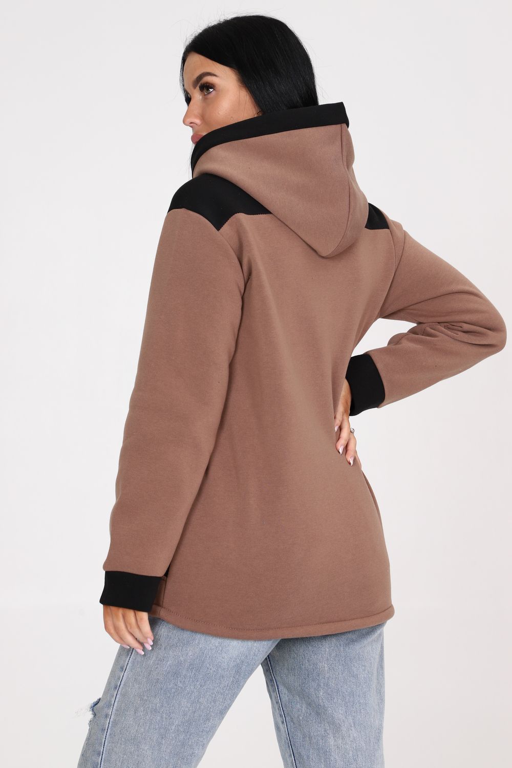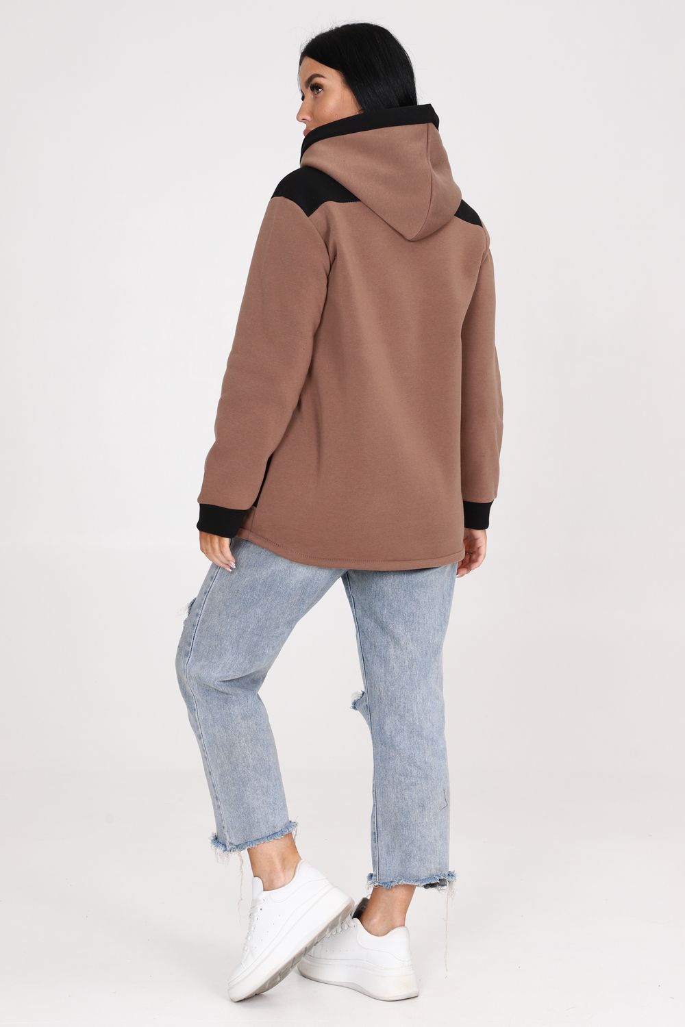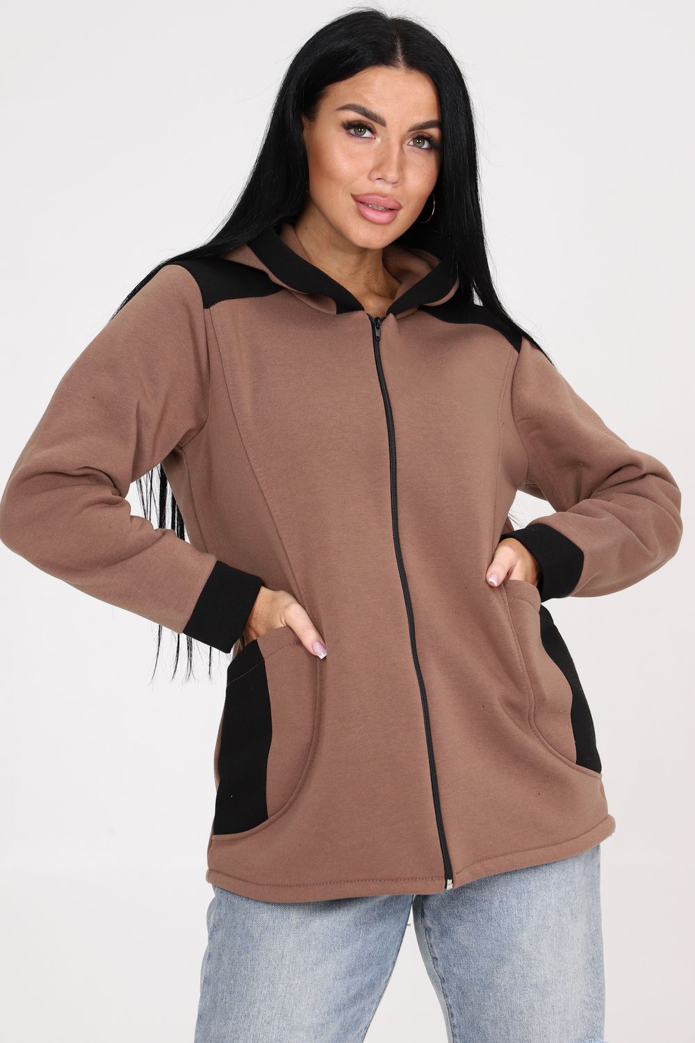 Толстовка женская утепленная на молнии с капюшоном. Длинный рукав на манжете, на передней полочке рельефы, в которых расположены карманы. Практично и удобно. В бежевой расцветке возможны вставки коричневого и рыжего цветов.
