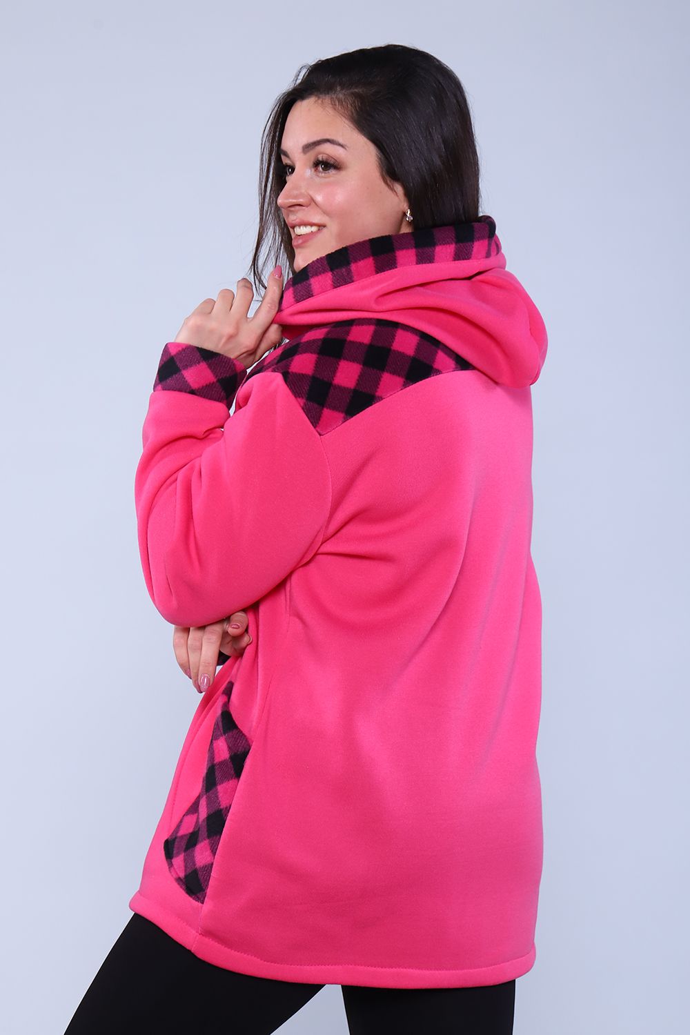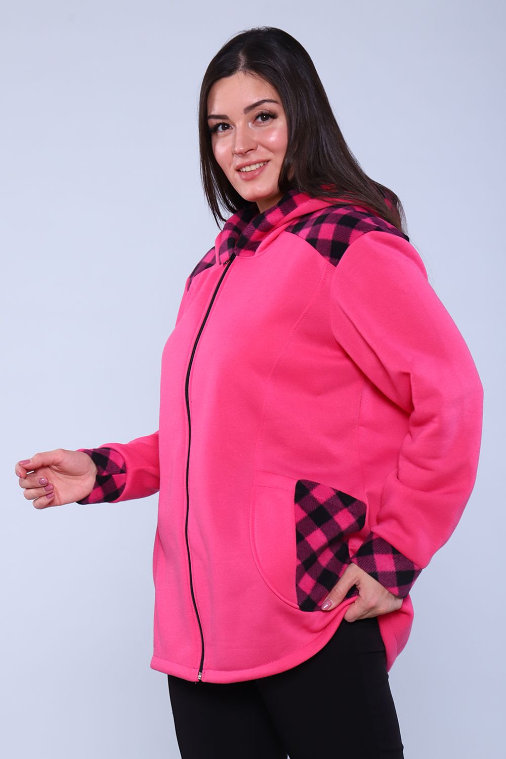 Толстовка женская утепленная на молнии с капюшоном. Длинный рукав на манжете, на передней полочке рельефы, в которых расположены карманы. Практично и удобно. В бежевой расцветке возможны вставки коричневого и рыжего цветов.