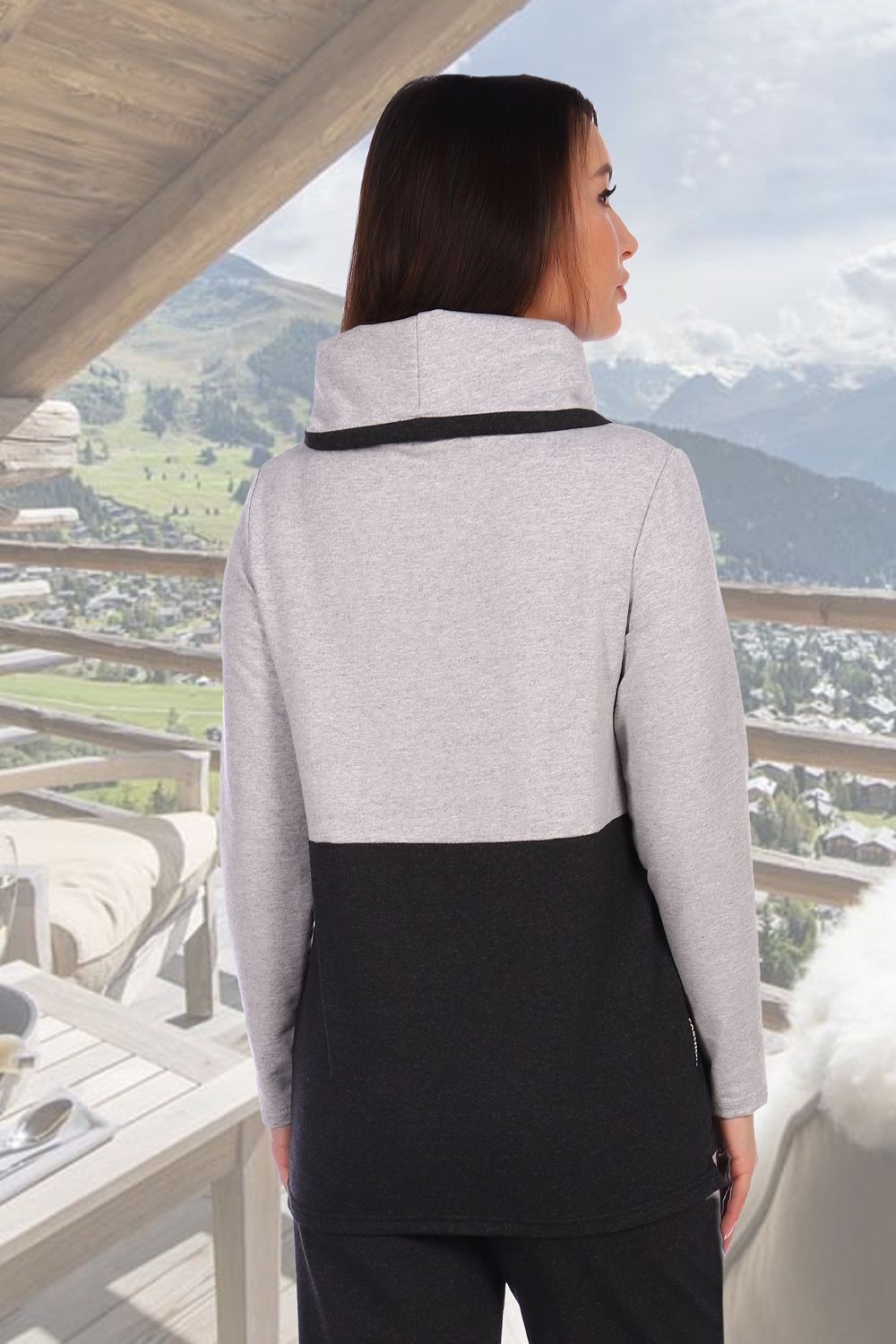 Женская толстовка прямого силуэта с воротником-хомут выполнена из трикотажного полотна футер 2-х нитка. В воротник вставлена декоративная лента с надписью. Спинка изделия длиннее полочки, по бокам имеются разрезы.