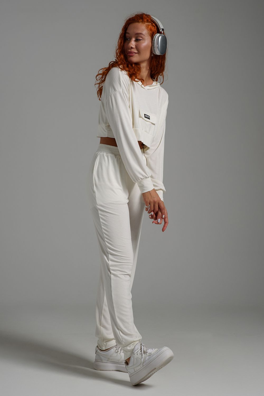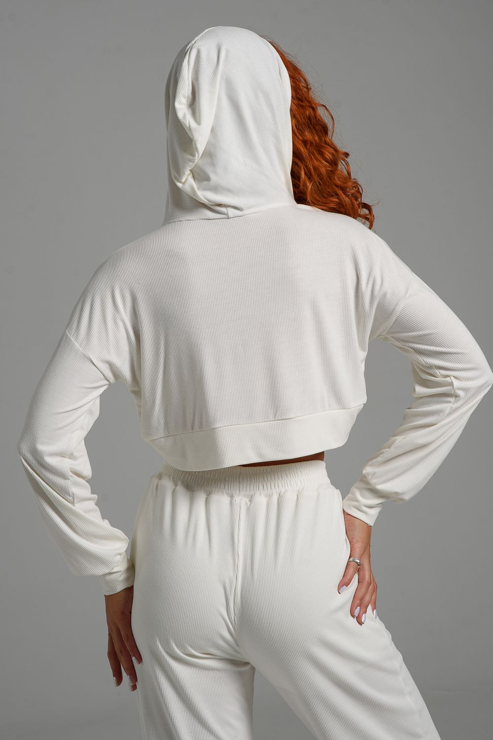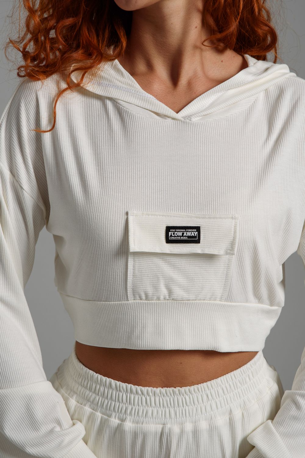 Стильное укороченное худи с капюшоном и длинными рукавами выполнено из очень мягкой приятной к телу ткани в мелкий рубчик. Худи свободного кроя с маленьким кармашком с клапаном на груди. Отлично сочетается с майками, топами, спортивными брюками, шортами, юбками.