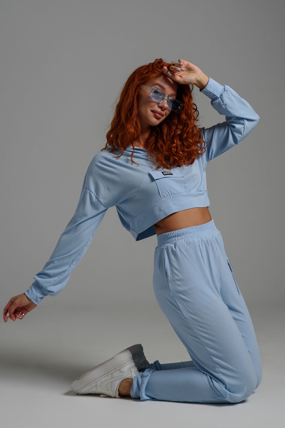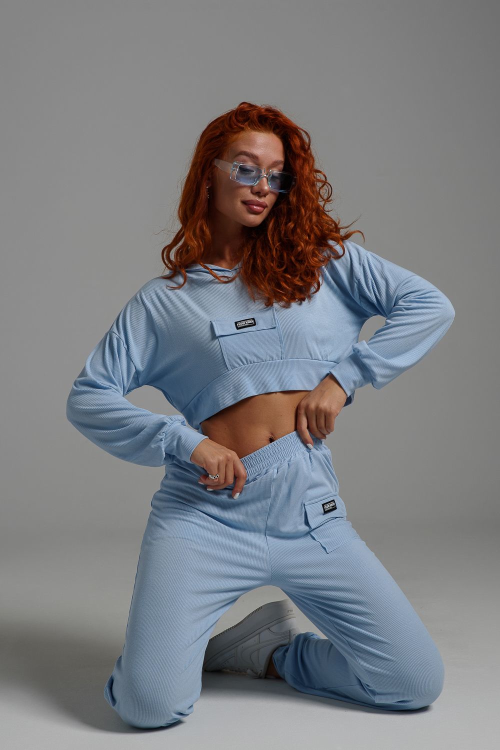 Стильное укороченное худи с капюшоном и длинными рукавами выполнено из очень мягкой приятной к телу ткани в мелкий рубчик. Худи свободного кроя с маленьким кармашком с клапаном на груди. Отлично сочетается с майками, топами, спортивными брюками, шортами, юбками.