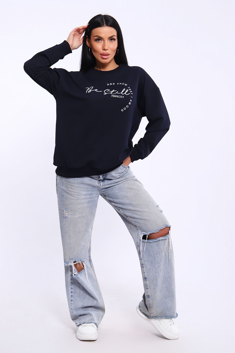 Толстовка из мягкого футера свободного кроя со спущенной линией плеча. Данная модель прекрасно скрывает все лишнее, что хочется скрыть. Горловина, манжеты и пояс из эластичного кашкорсе, на полочке небольшой принт.