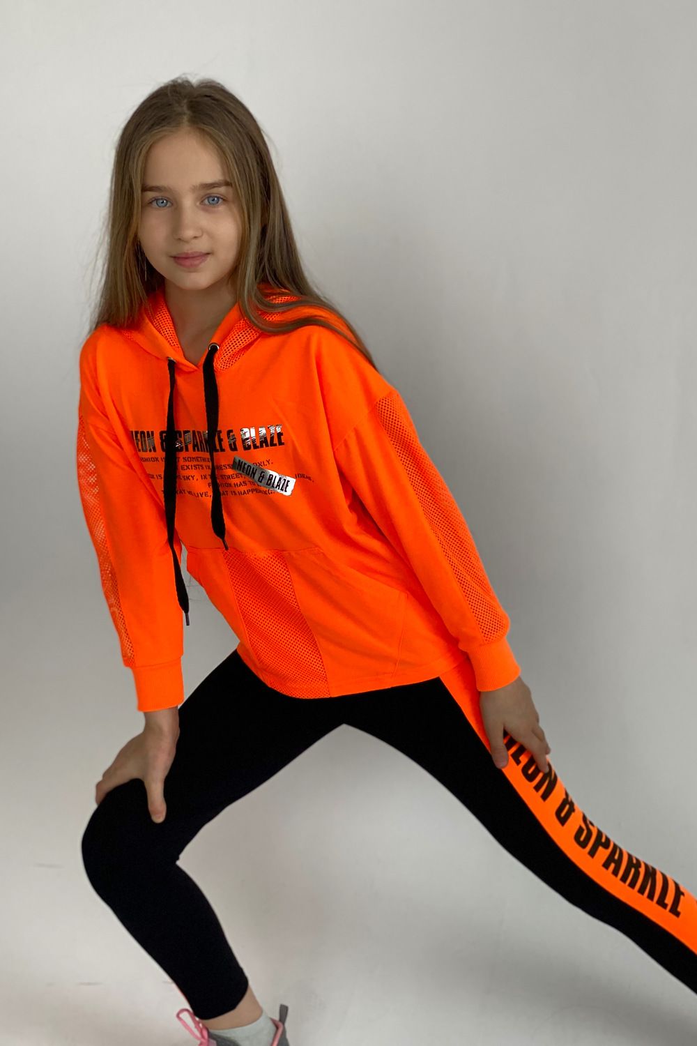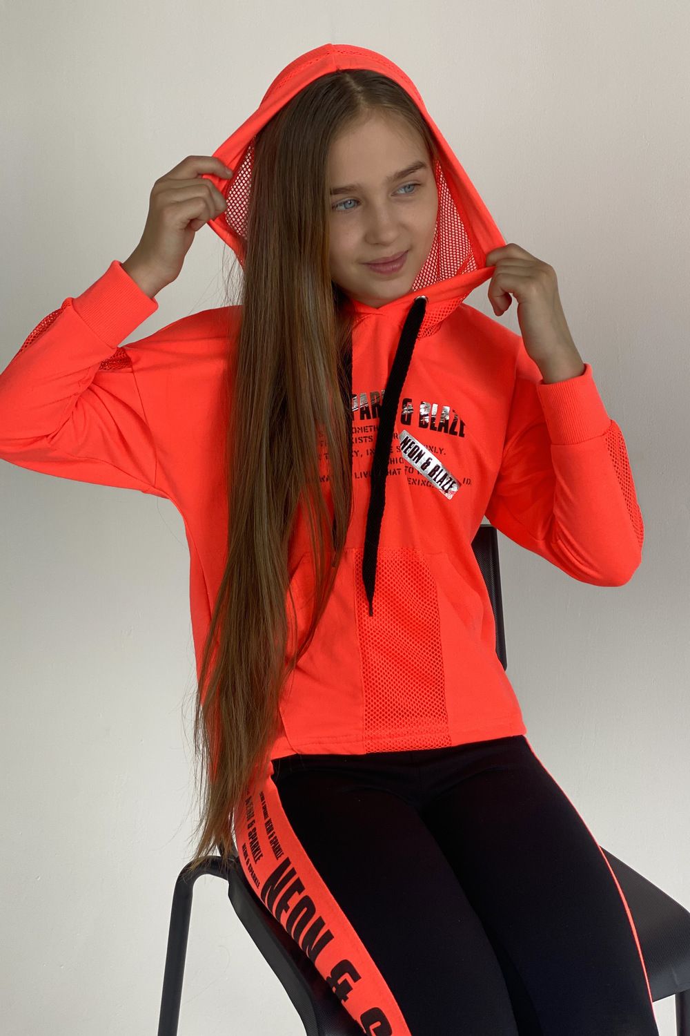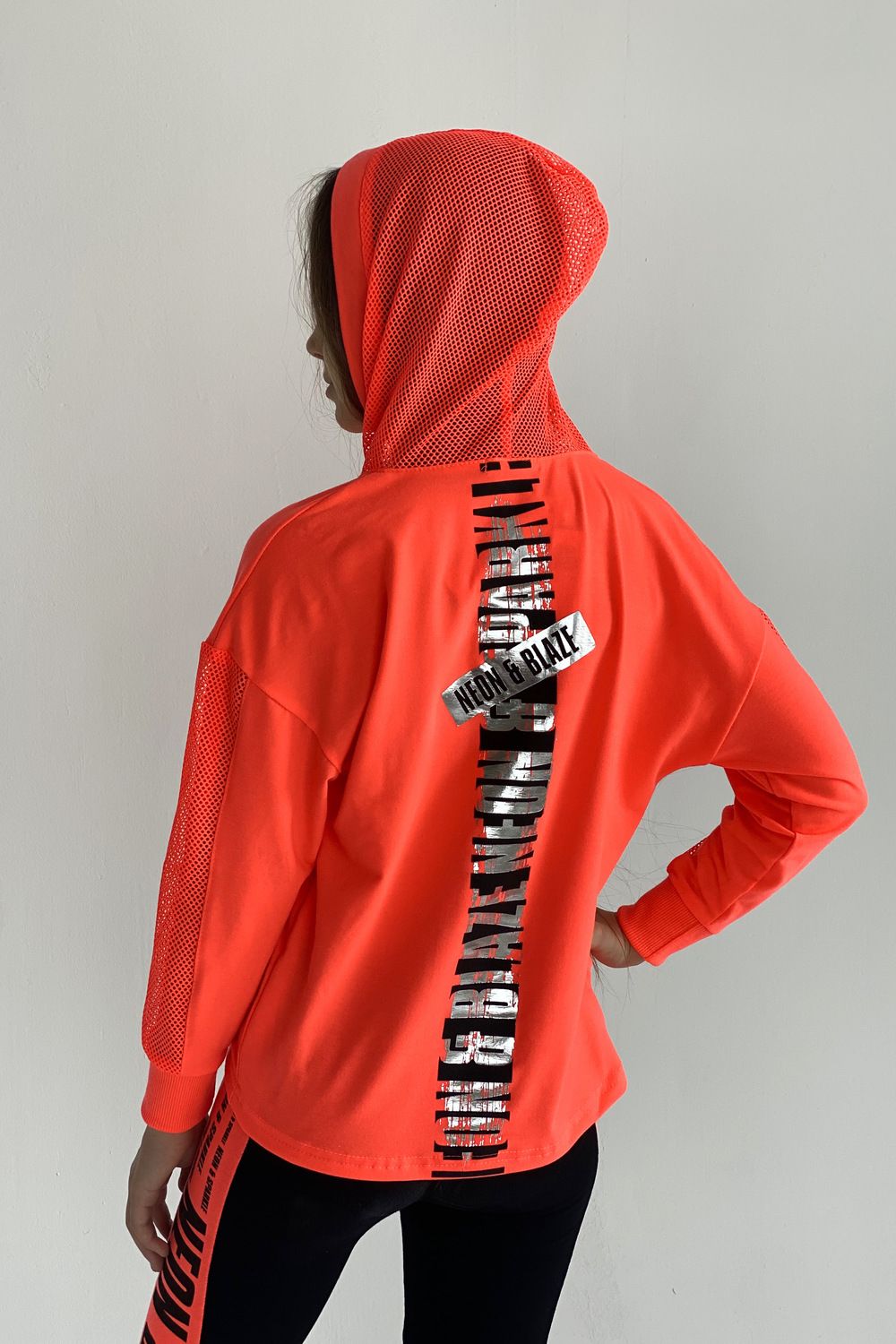 Толстовка прямая, свободная, с капюшоном из сетки, с удлиненной спинкой. Рукав длинный, со вставкой из сетки вдоль рукава, на эластичном манжете. На полочке расположен карман "кенгуру".
