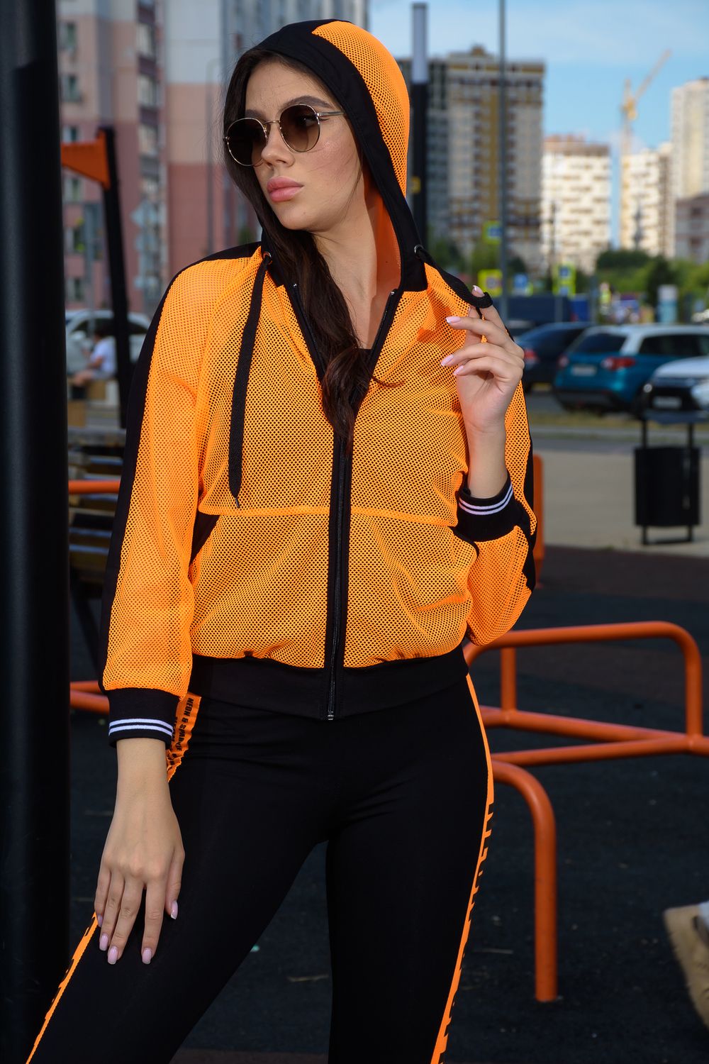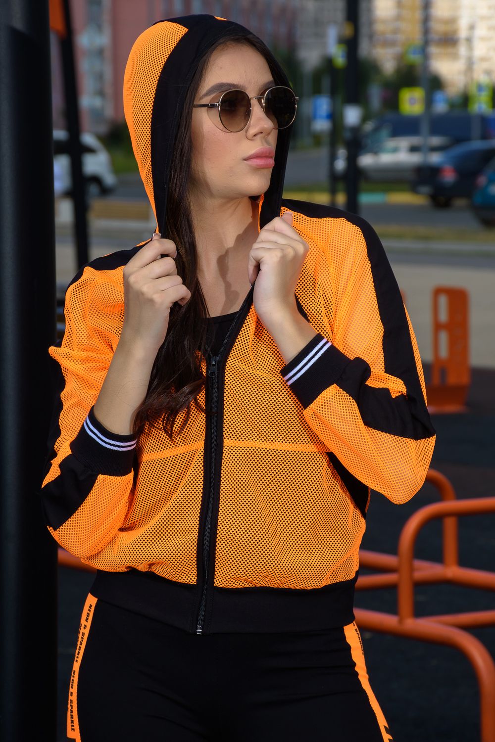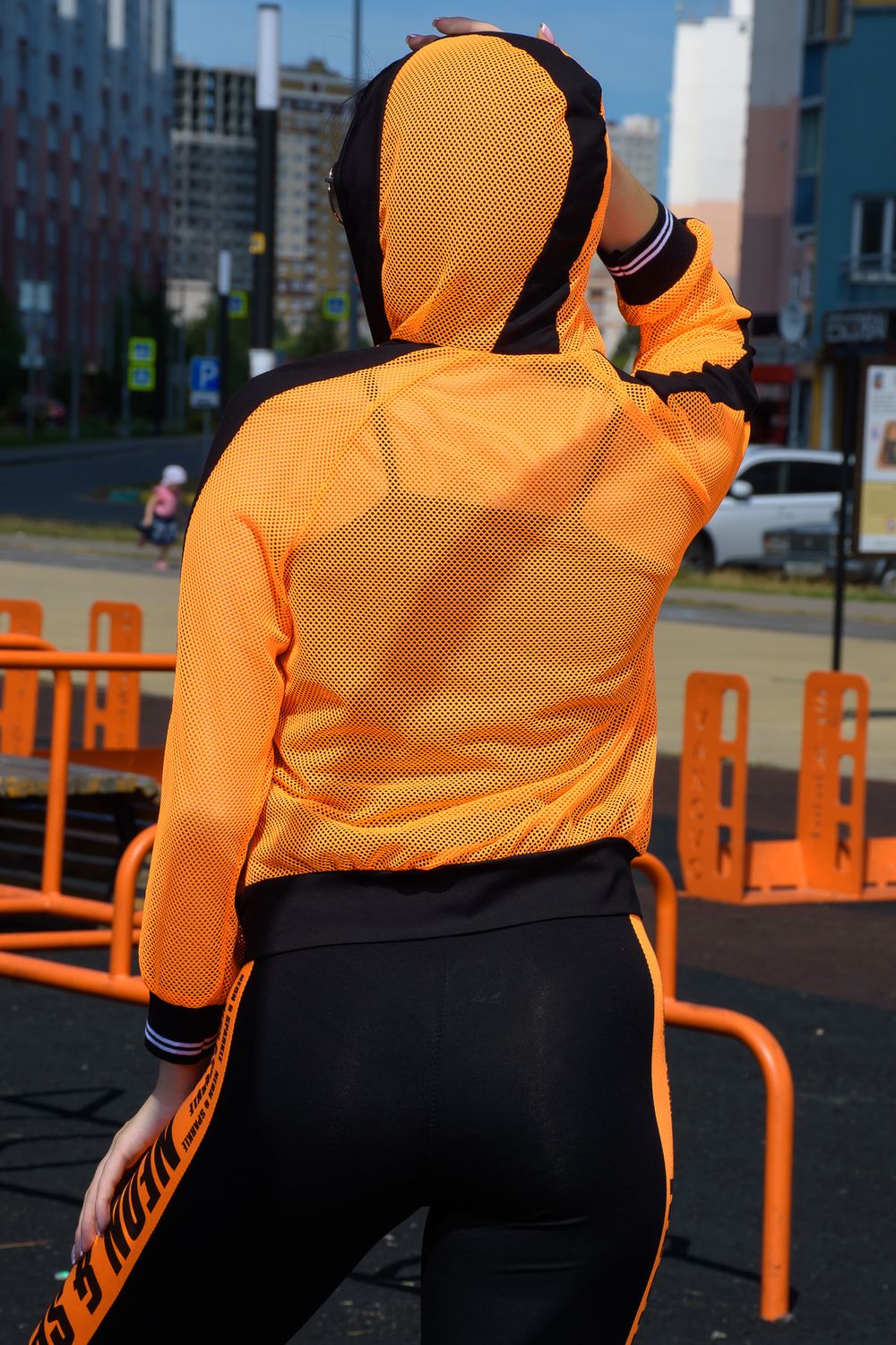 Толстовка с капюшоном из сетки, длиной до середины бедра. Рукав реглан длинный, из сетки, с контрастным лампасом вдоль рукава, на эластичном манжете. На полочке расположены фигурные карманы из сетки.