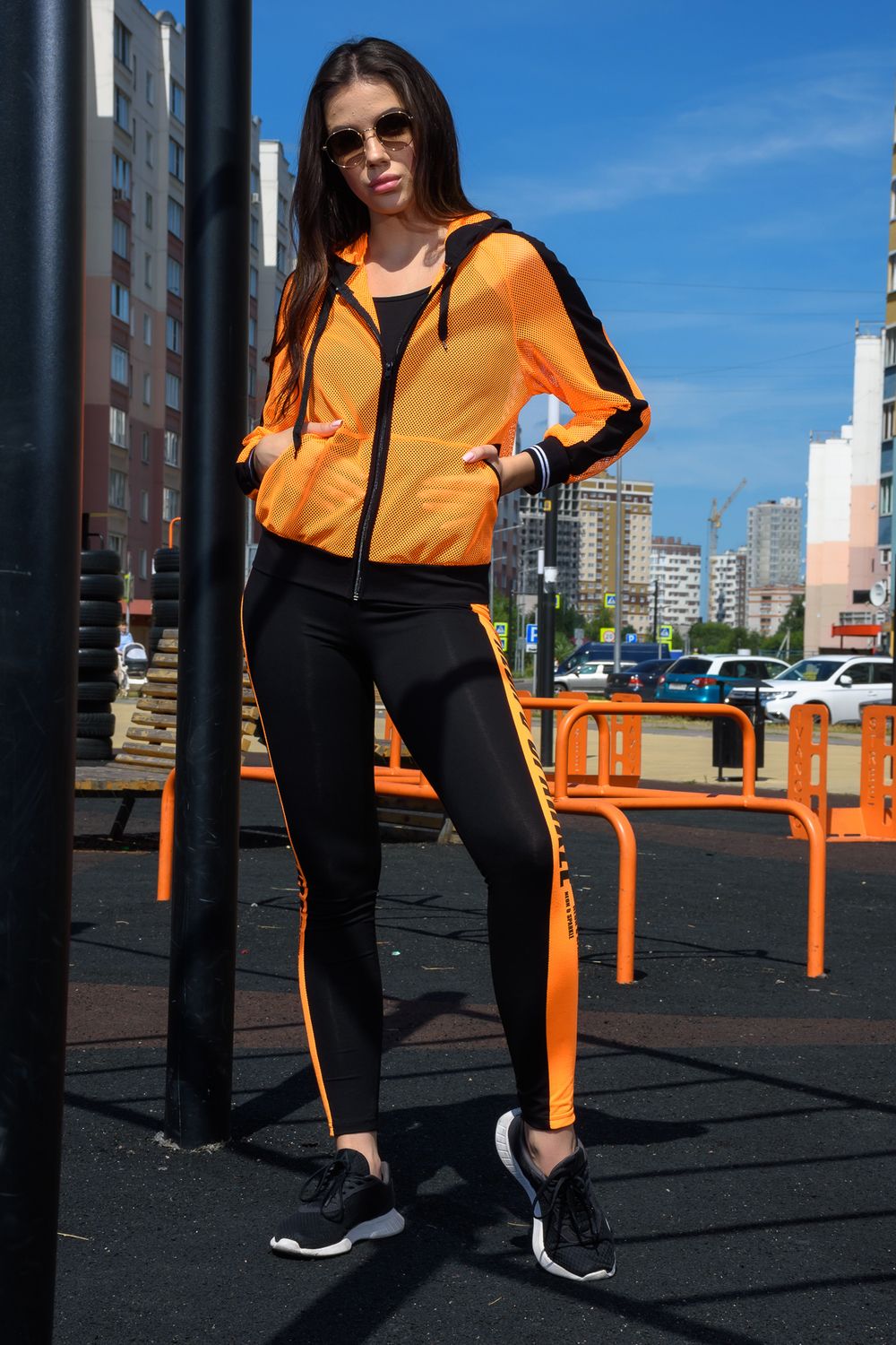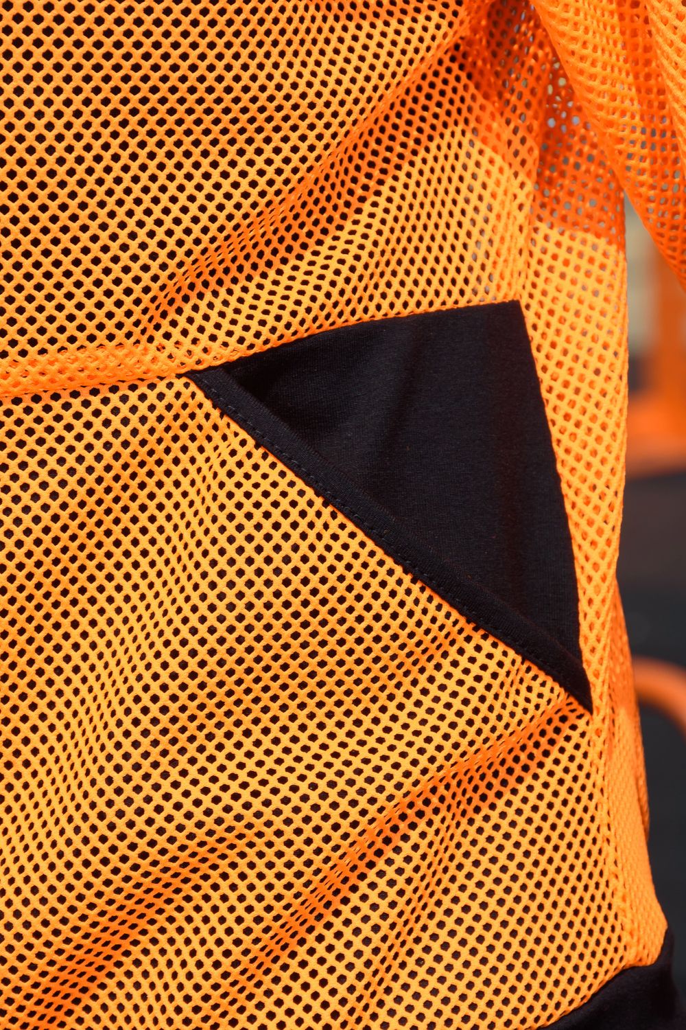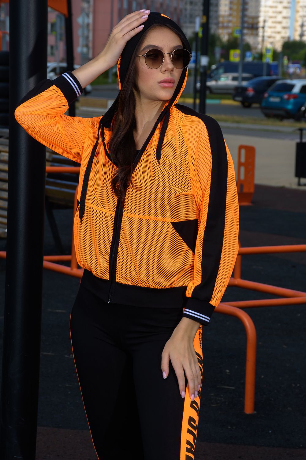 Толстовка с капюшоном из сетки, длиной до середины бедра. Рукав реглан длинный, из сетки, с контрастным лампасом вдоль рукава, на эластичном манжете. На полочке расположены фигурные карманы из сетки.