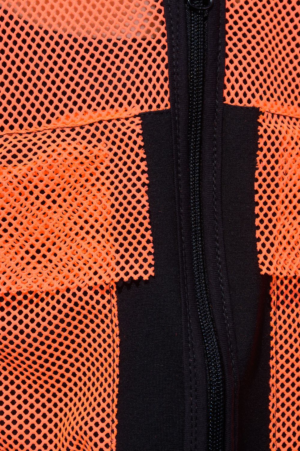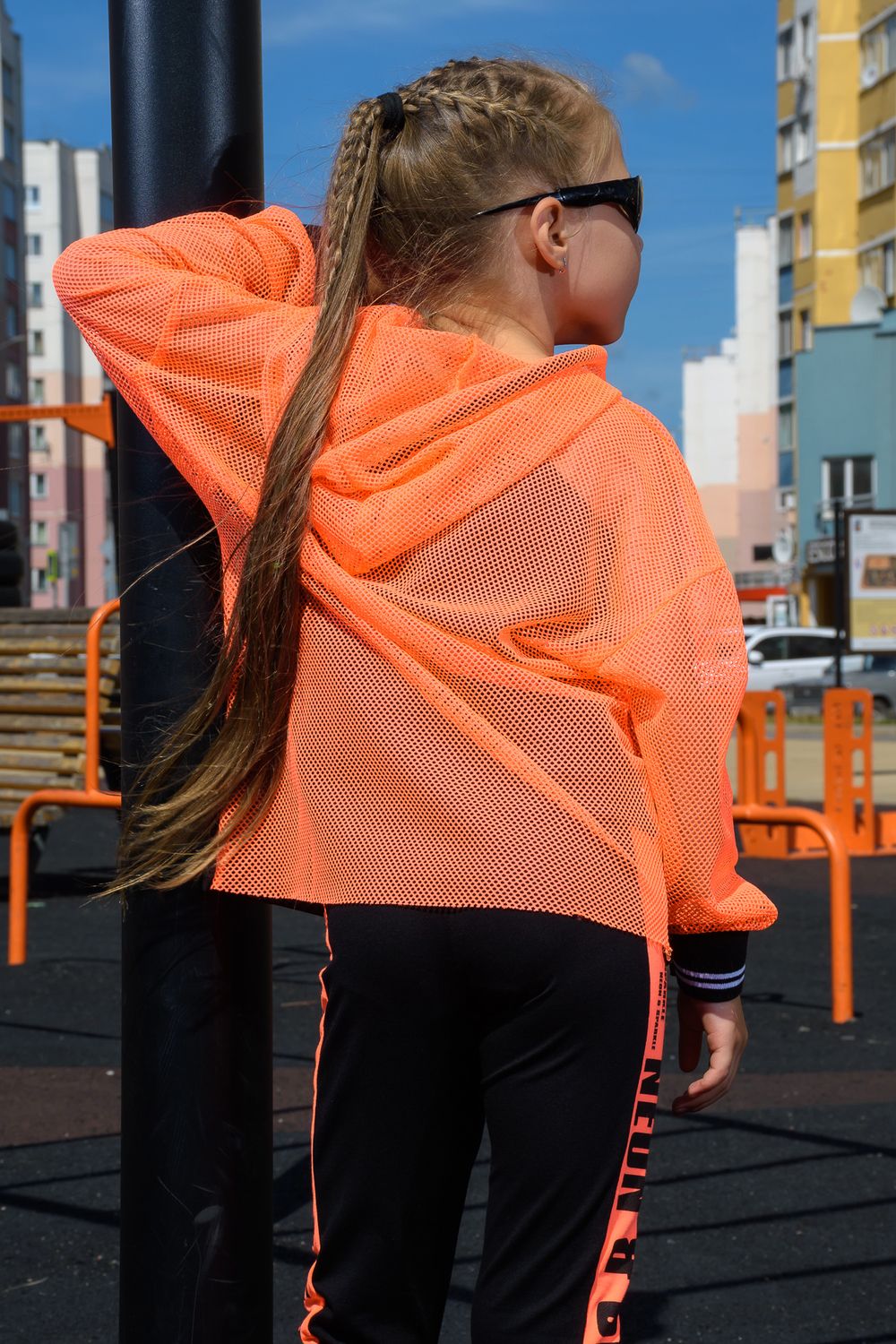 Толстовка прямая, свободная, с капюшоном из сетки, на молнии. Рукав длинный, из сетки, на эластичном манжете. Спинка удлиненная, из сетки. В верхней части полочки расположены кокетки из сетки. На полочку настрочены накладные карманы с клапанами из сетки.
