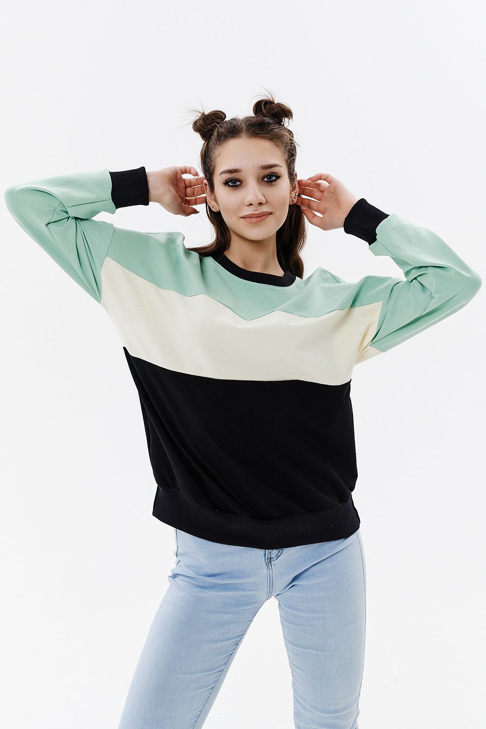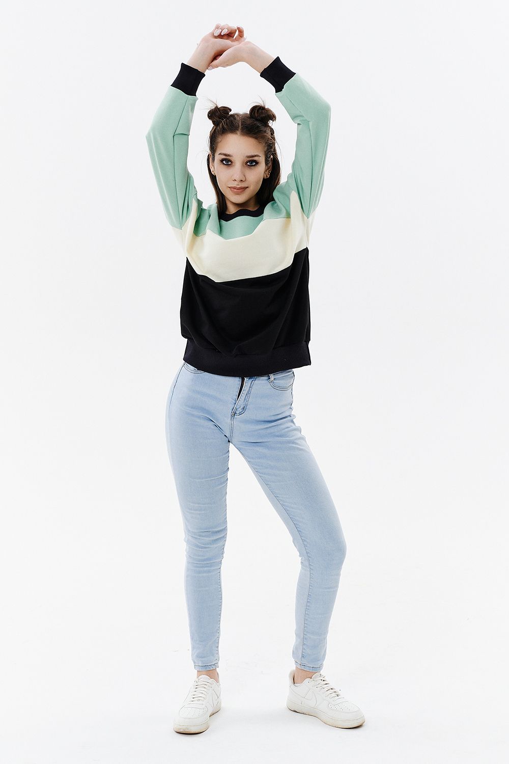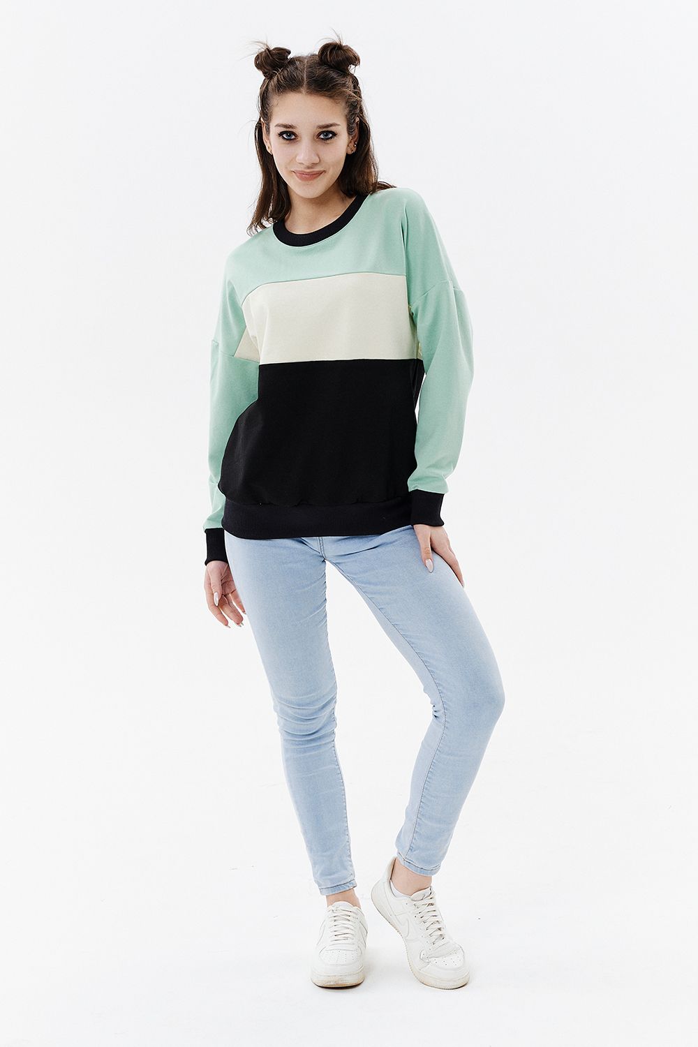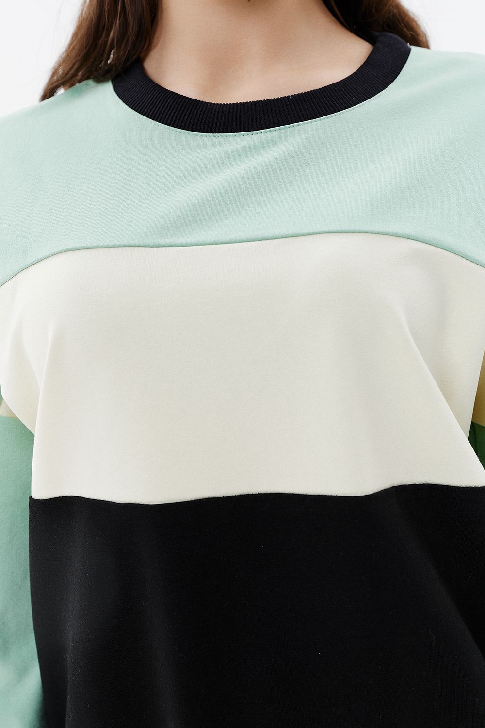 Толстовка свободная, на эластичном поясе, с длинным рукавом на эластичном манжете. Полочка и спинка состоят из горизонтальных частей из отделочных полотен. Горловины обработана обтачкой из эластичного полотна.