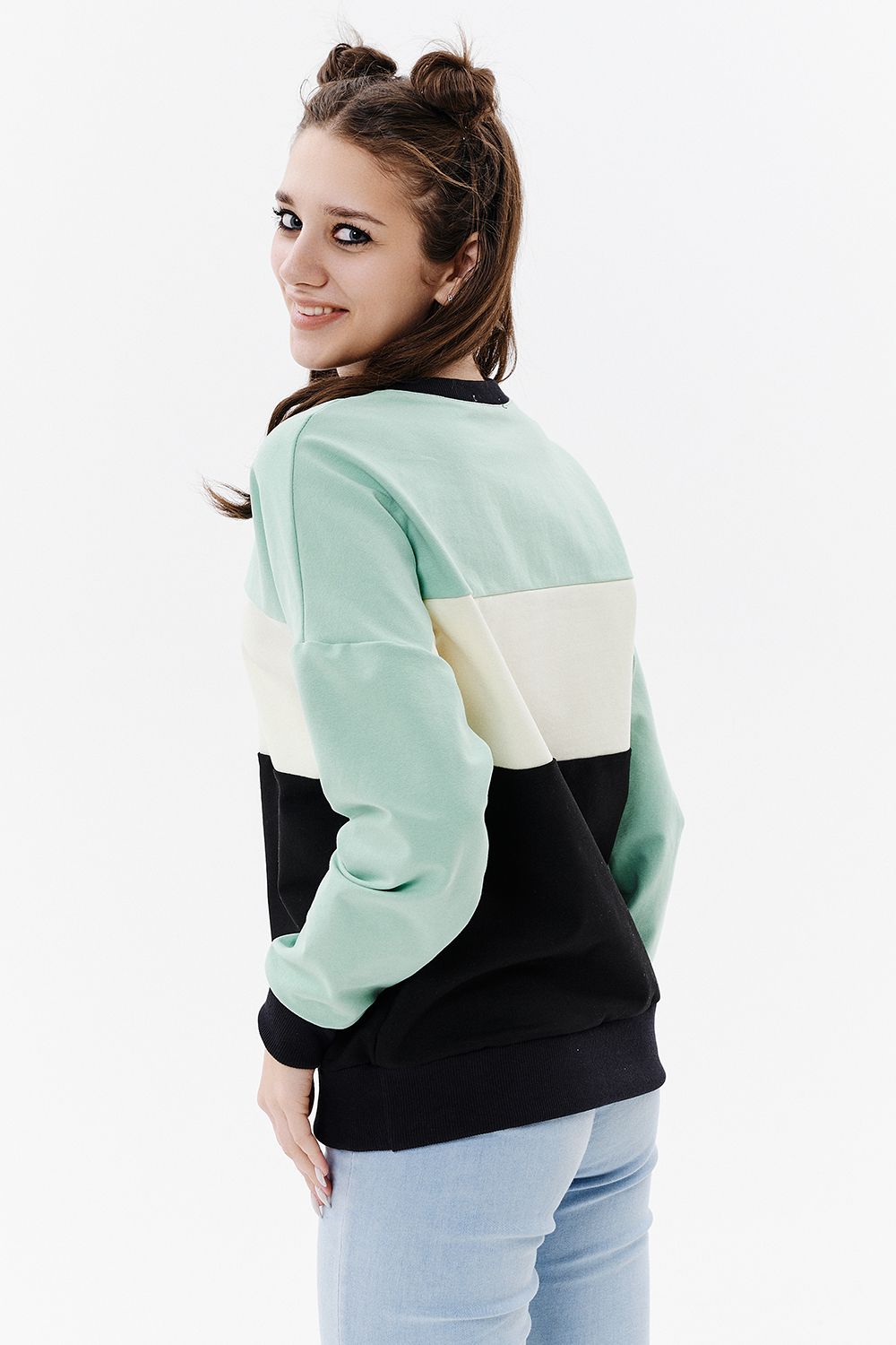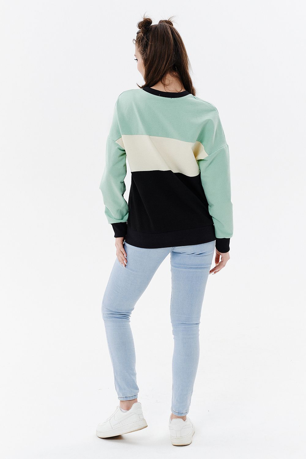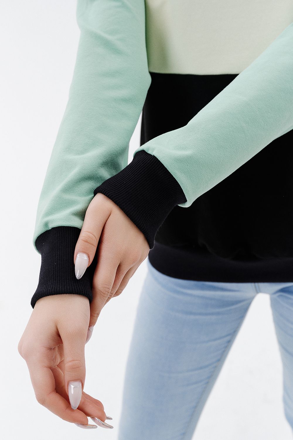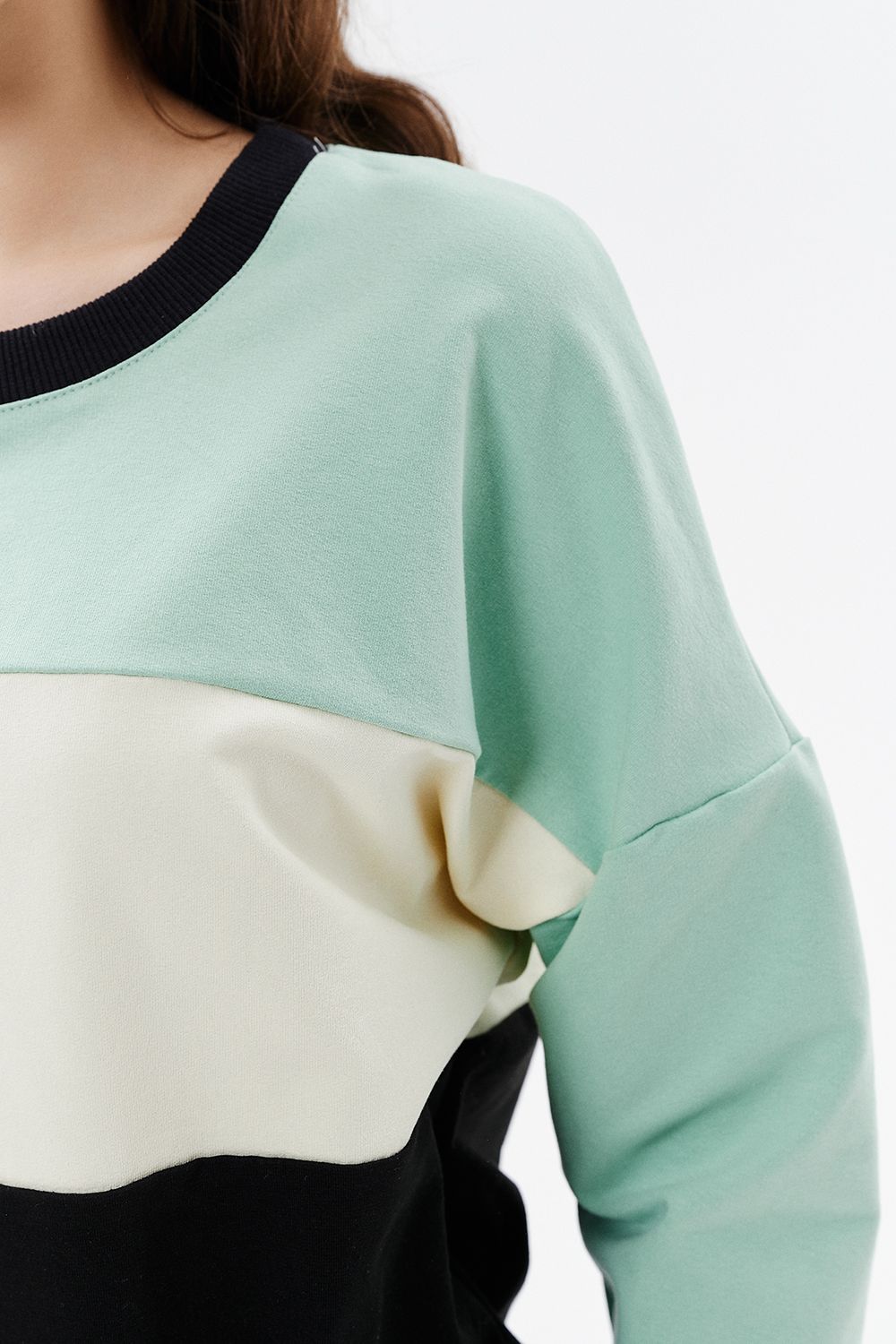 Толстовка свободная, на эластичном поясе, с длинным рукавом на эластичном манжете. Полочка и спинка состоят из горизонтальных частей из отделочных полотен. Горловины обработана обтачкой из эластичного полотна.
