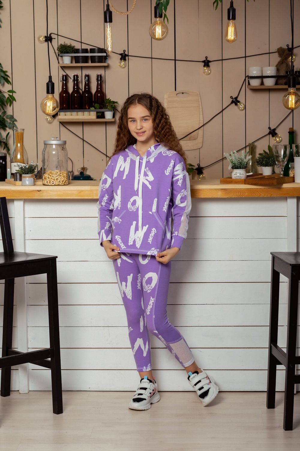 Толстовка прямая, свободная, с капюшоном, с удлиненной спинкой. Рукав длинный, с лампасом из сетки вдоль рукава, на манжете. На полочке расположен карман "кенгуру". Можно составить комплект с леггинсами 8231