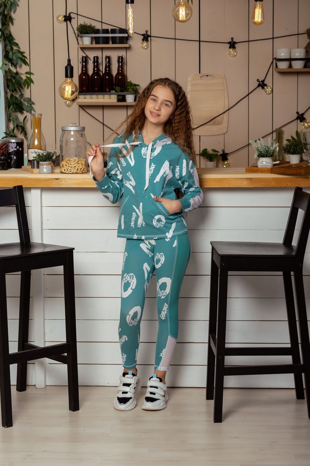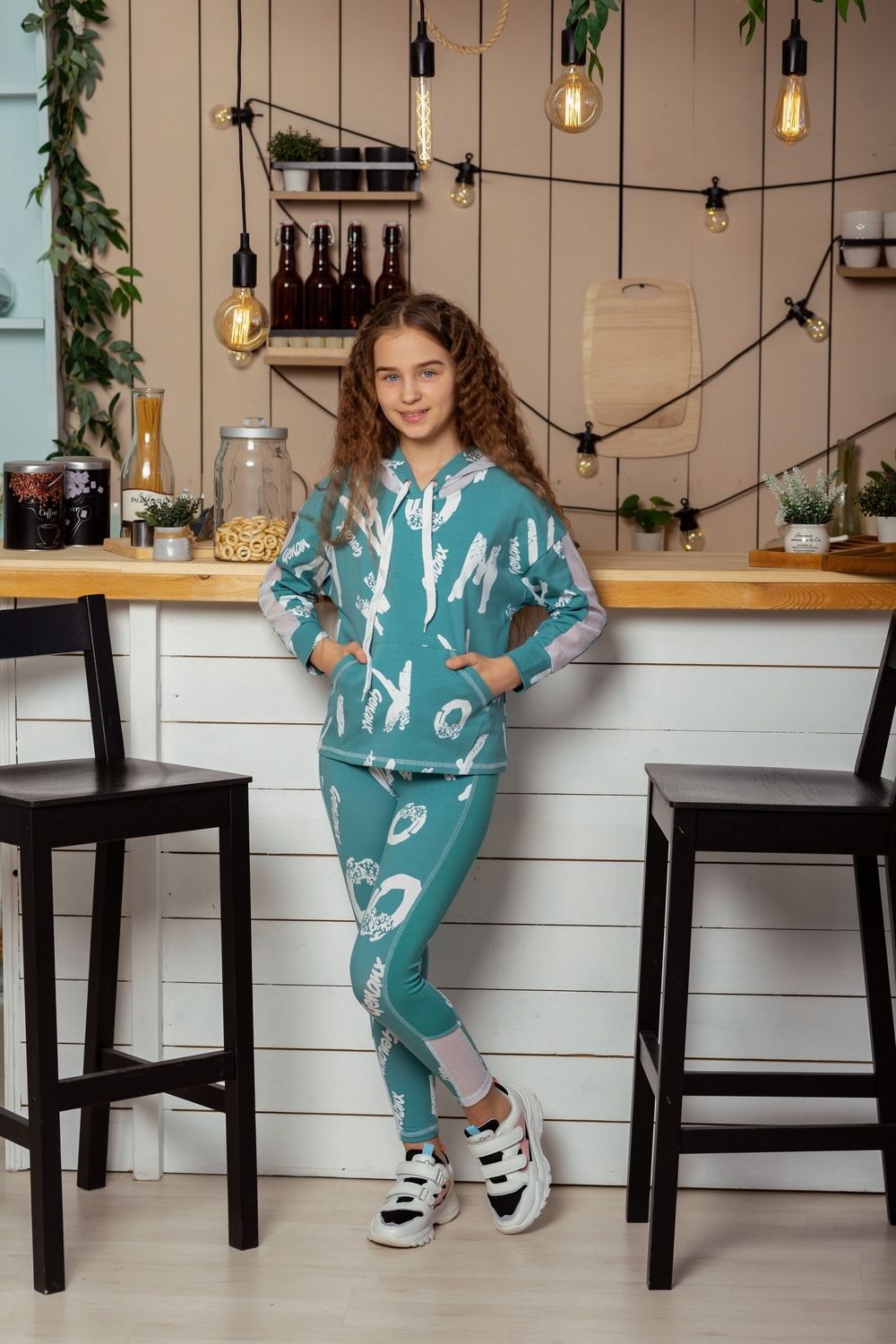 Толстовка прямая, свободная, с капюшоном, с удлиненной спинкой. Рукав длинный, с лампасом из сетки вдоль рукава, на манжете. На полочке расположен карман "кенгуру". Можно составить комплект с леггинсами 8231