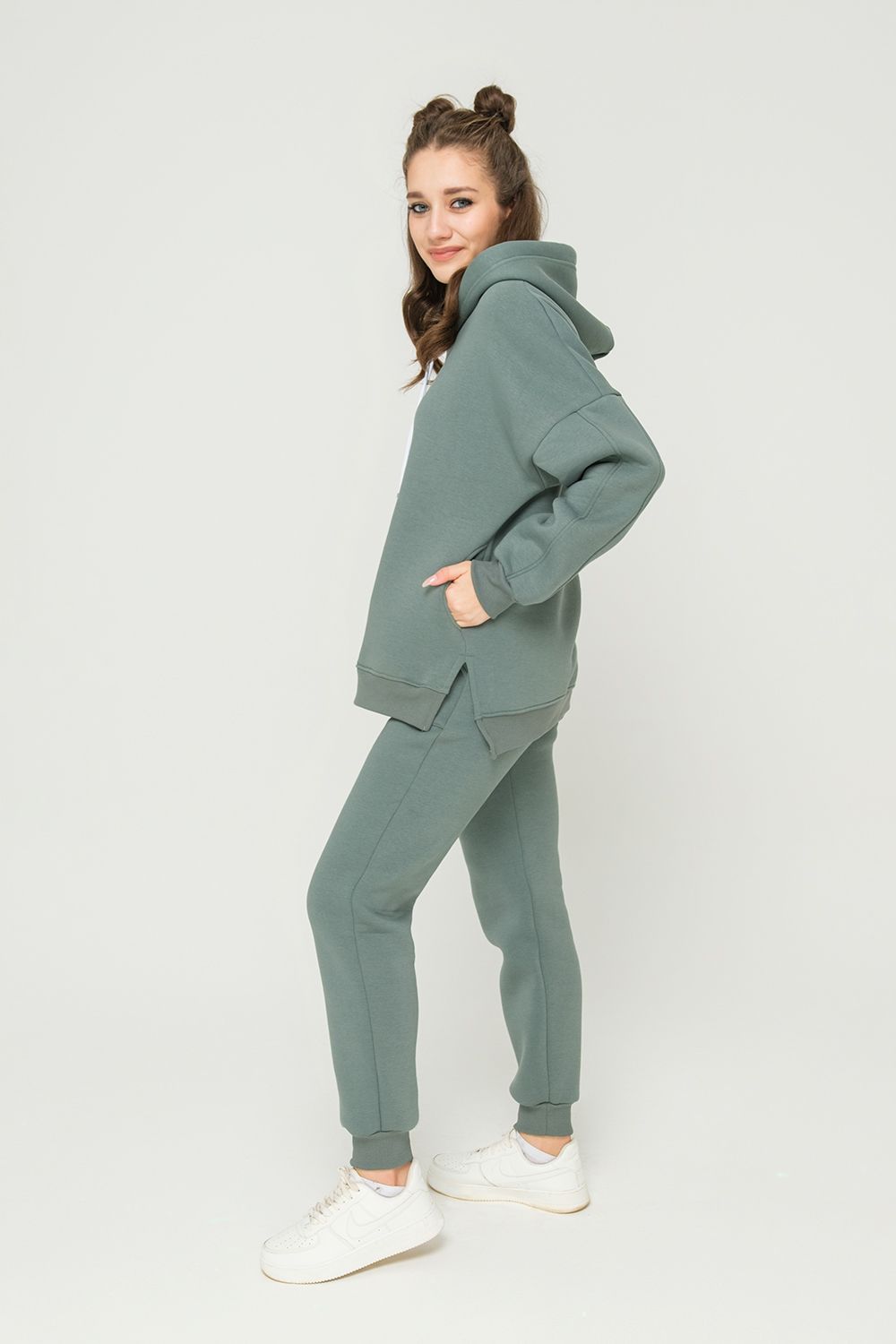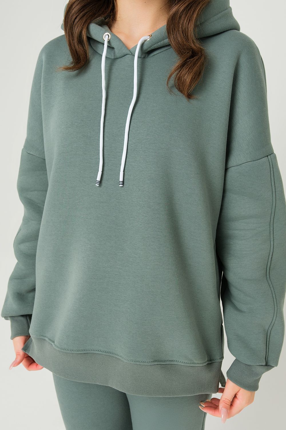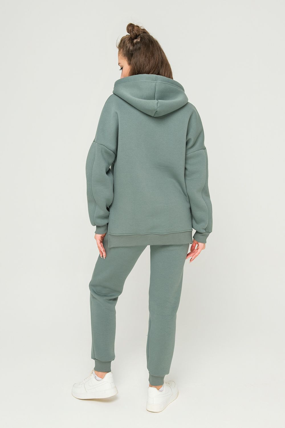 Толстовка утепленная, прямая, свободная, с удлиненной спинкой, с капюшоном. Рукав длинный, с продольным лампасом, на эластичном манжете. На полочке обработаны боковые карманы. В нижней части боковых швов обработаны разрезы. Низ полочки и спинки завершен эластичным поясом.