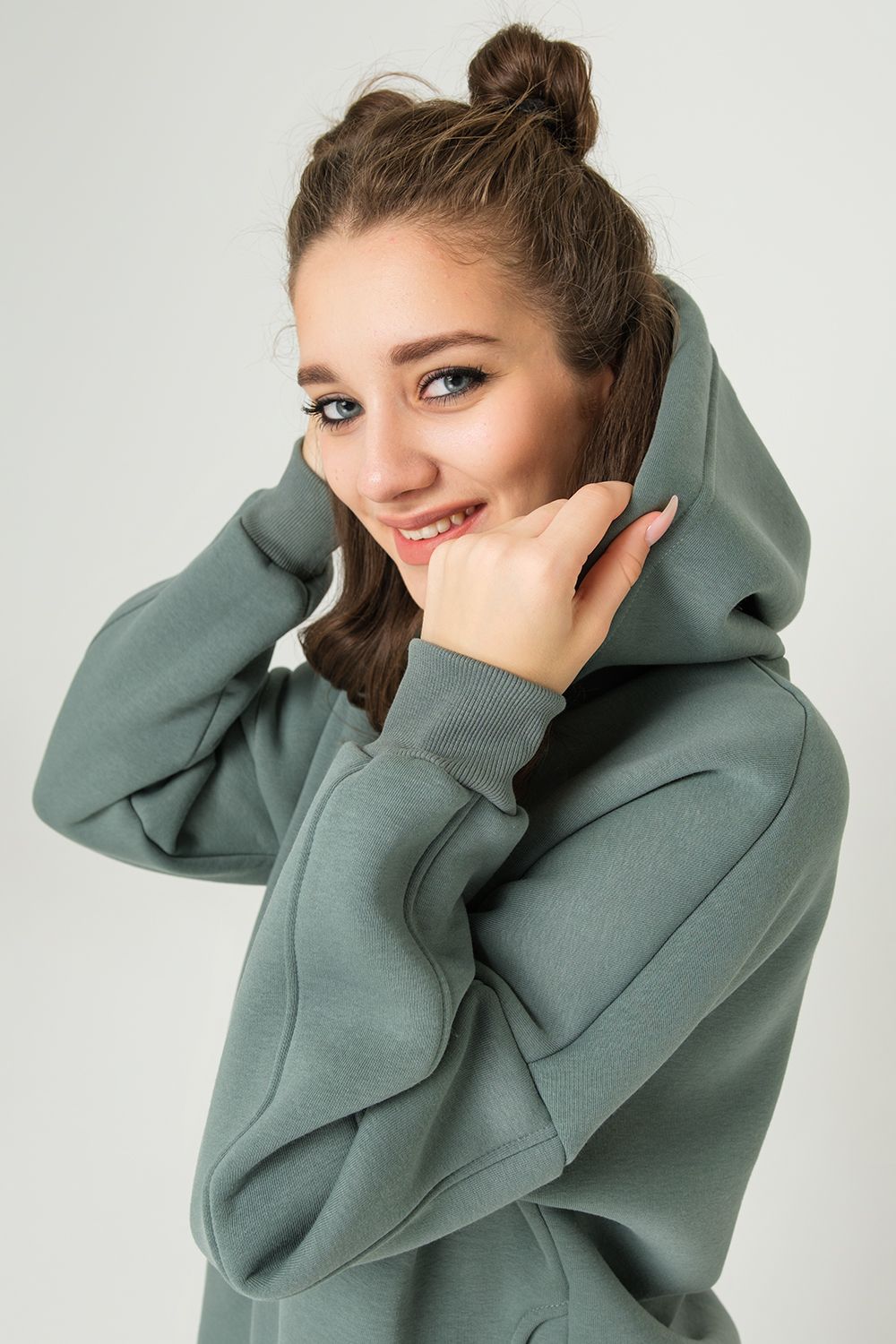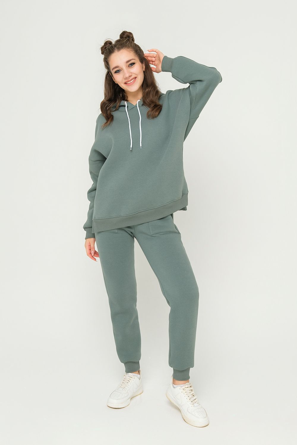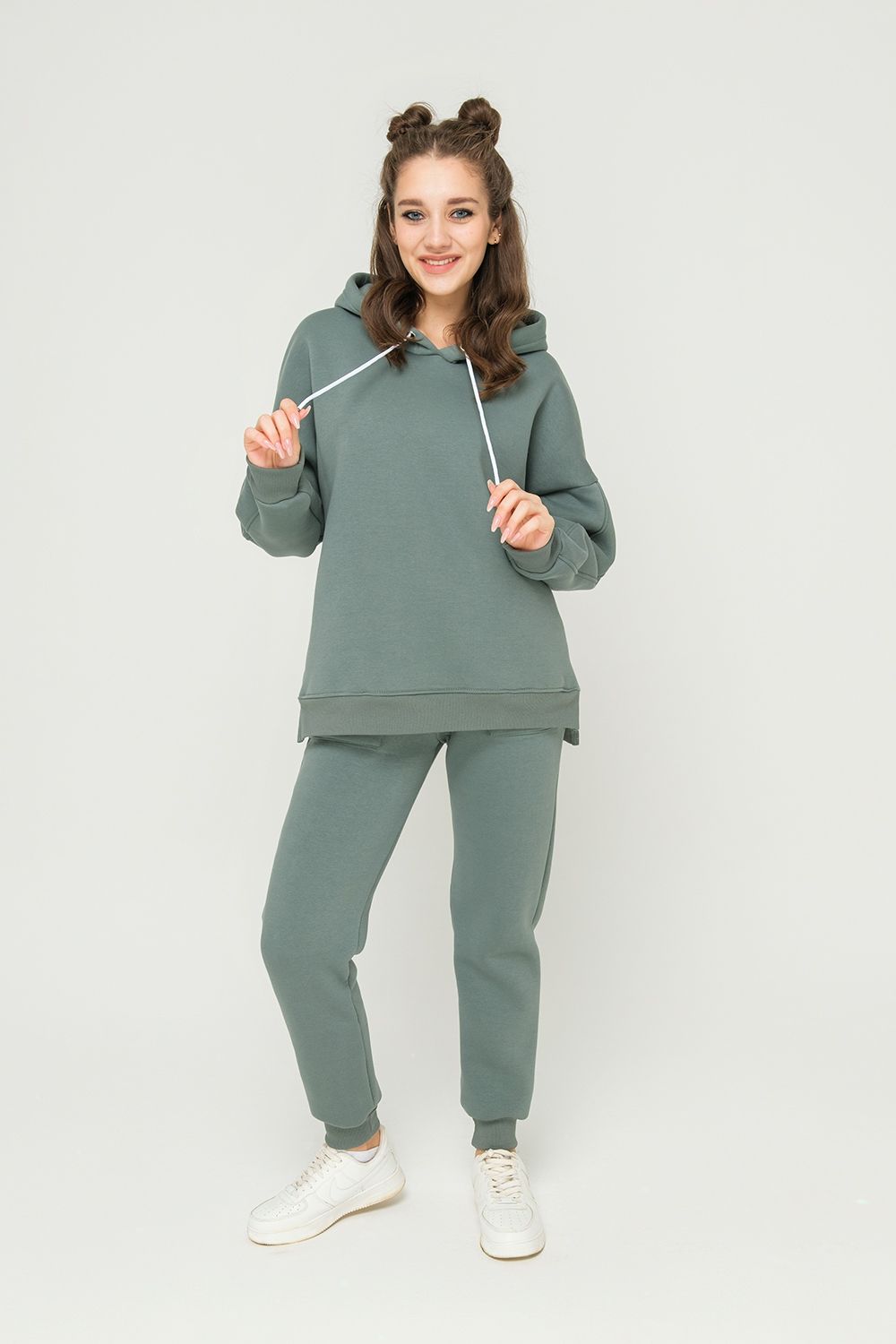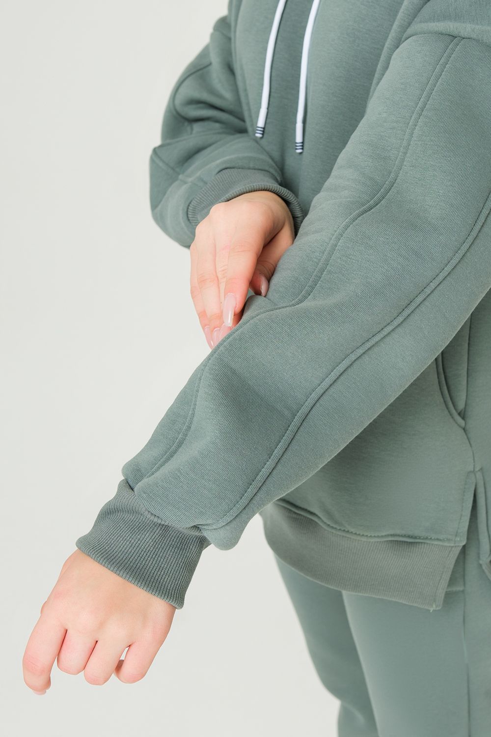 Толстовка утепленная, прямая, свободная, с удлиненной спинкой, с капюшоном. Рукав длинный, с продольным лампасом, на эластичном манжете. На полочке обработаны боковые карманы. В нижней части боковых швов обработаны разрезы. Низ полочки и спинки завершен эластичным поясом.