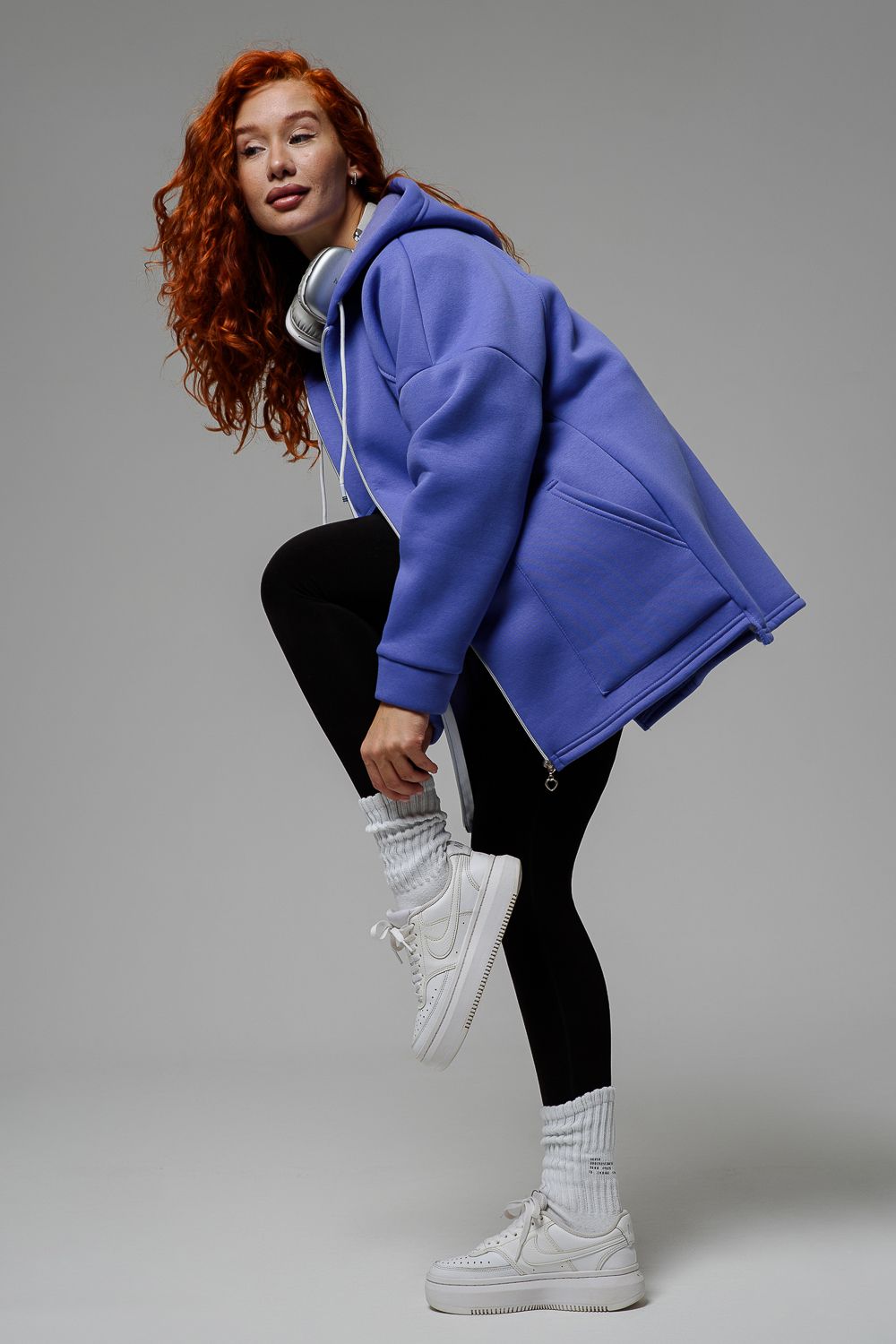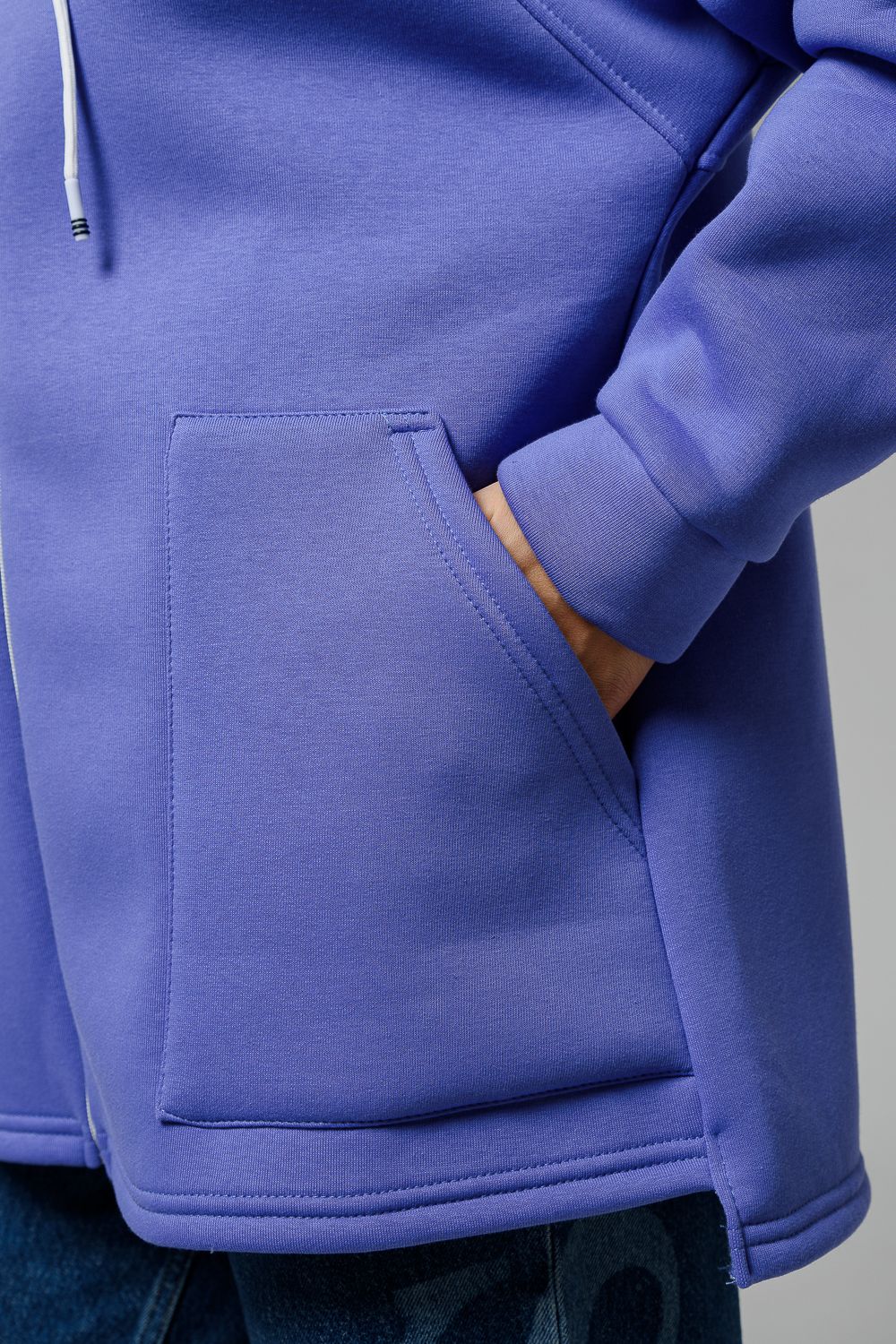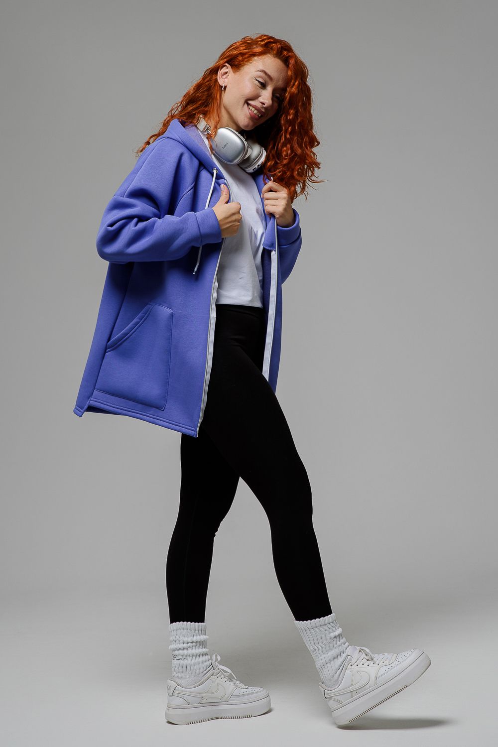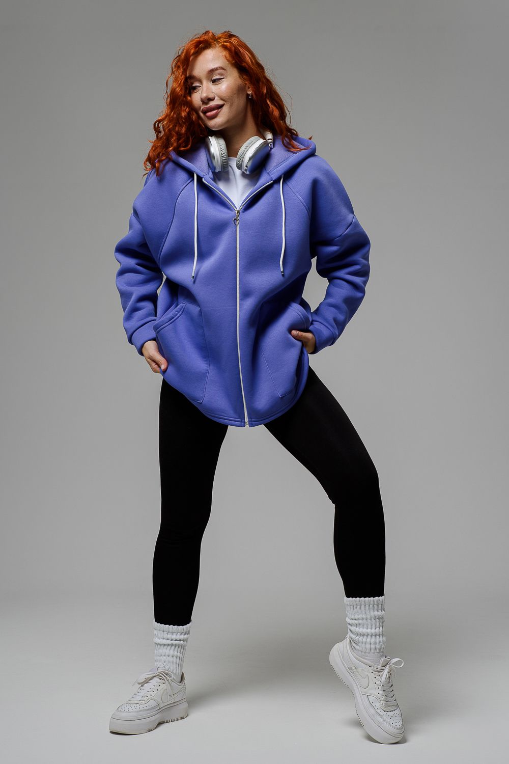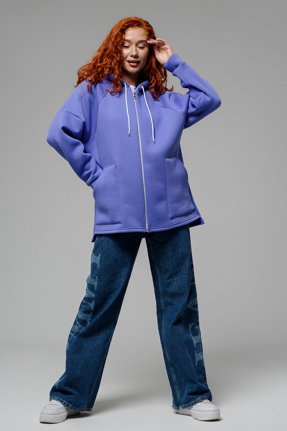 Толстовка утепленная, прямая, свободная, на молнии, с удлиненной спинкой, с капюшоном. Рукав длинный, на эластичном манжете. Полочка и спинка с фигурными кокетками. В нижней части полочки расположены удобные накладные карманы.