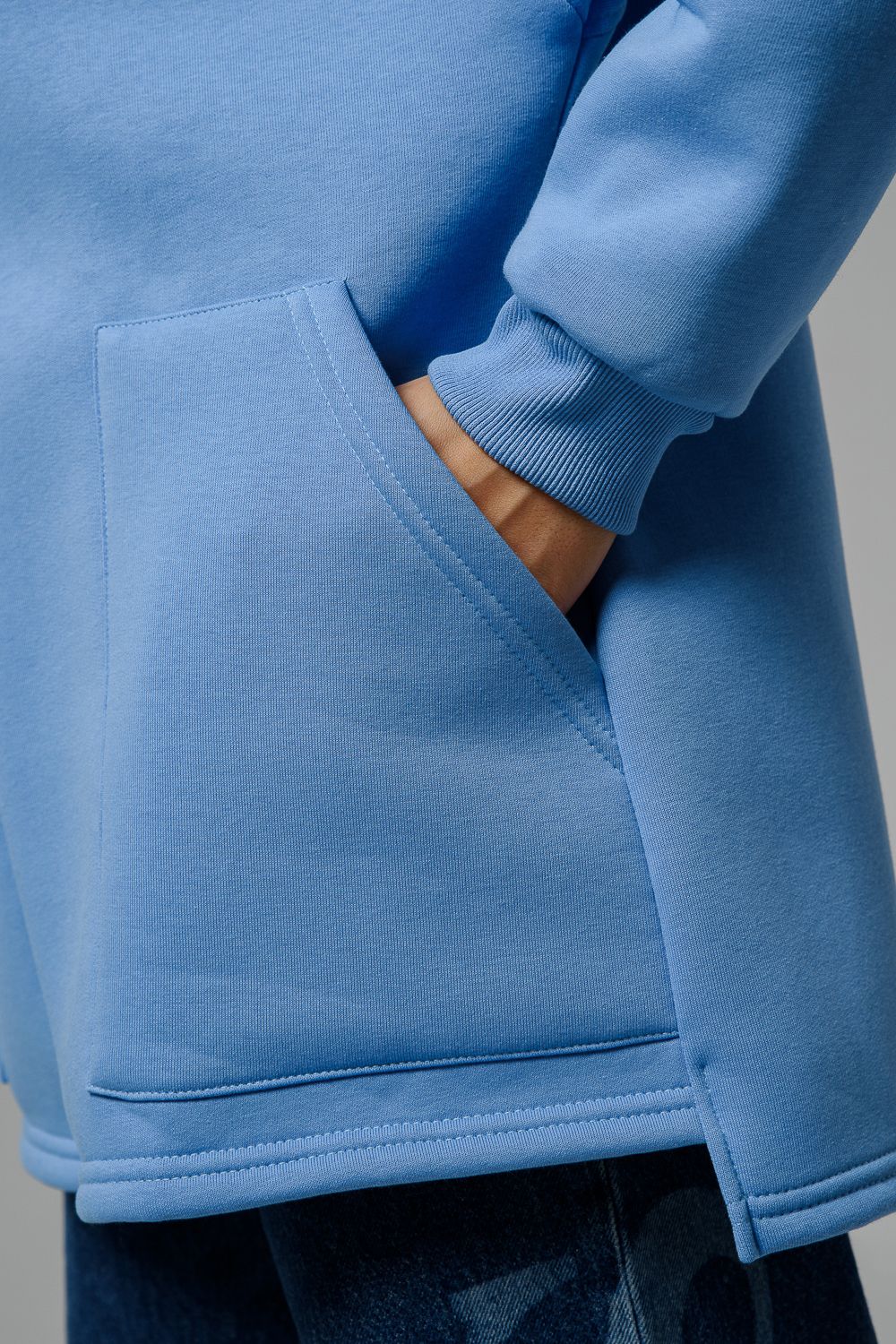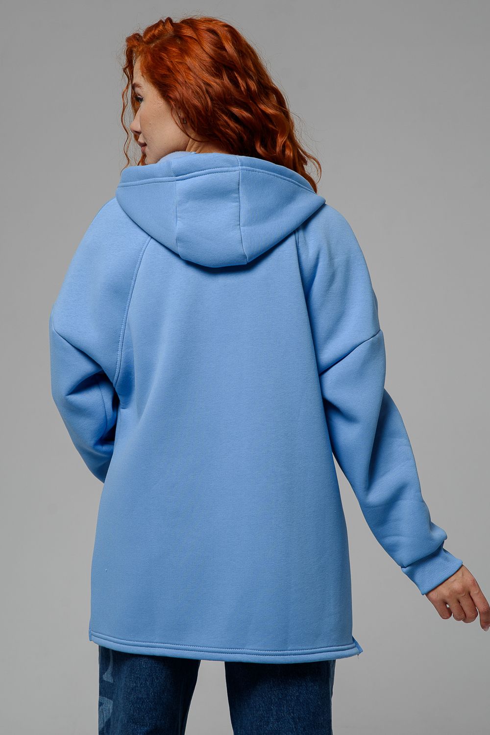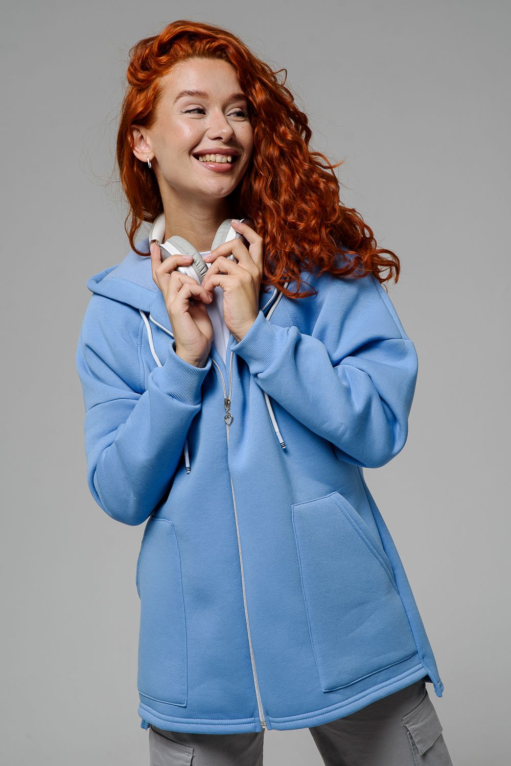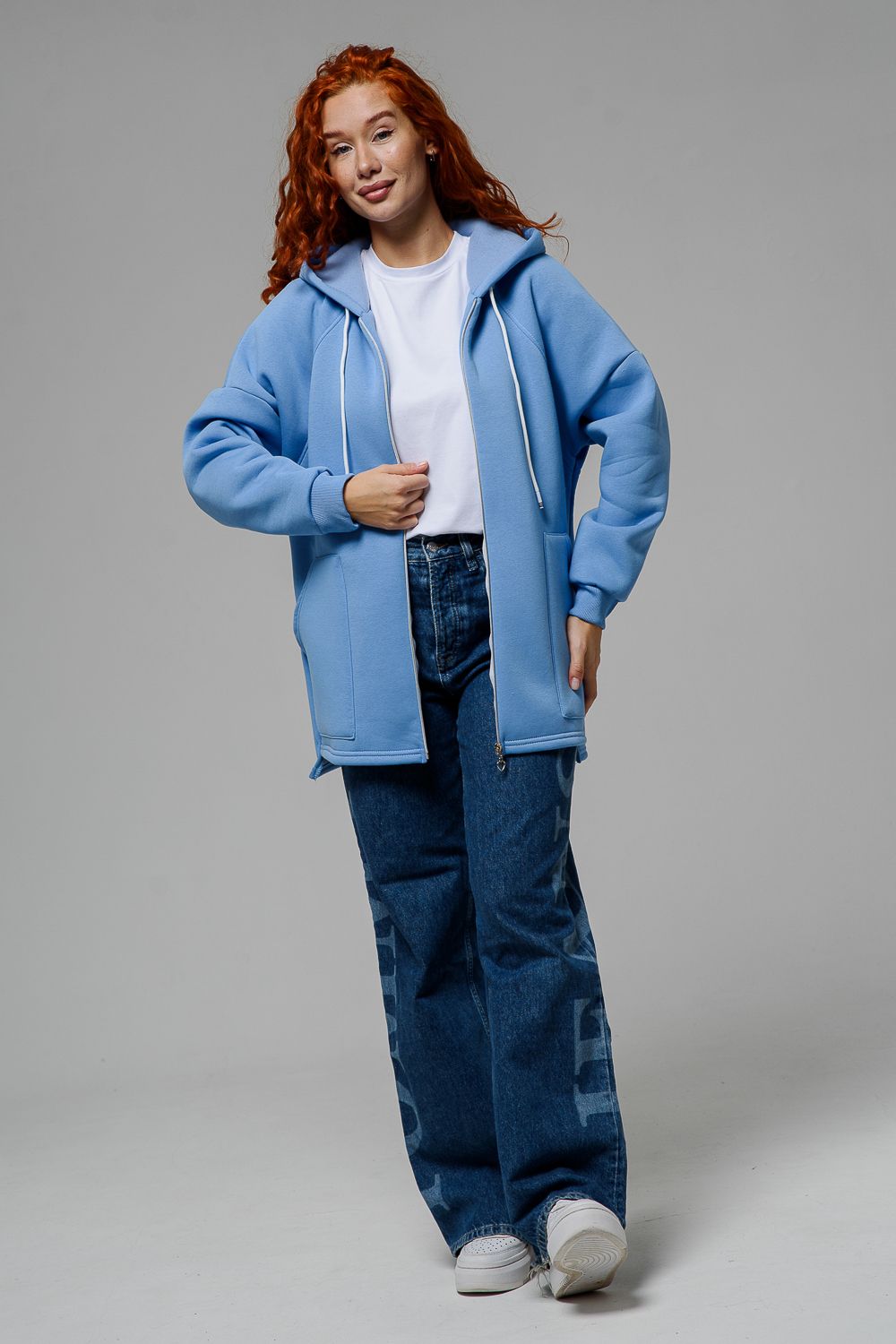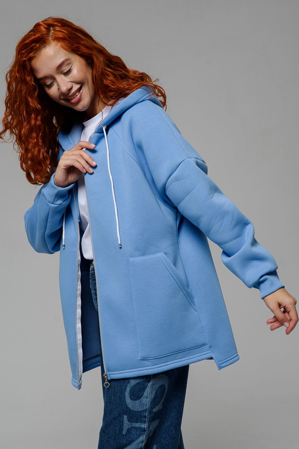 Толстовка утепленная, прямая, свободная, на молнии, с удлиненной спинкой, с капюшоном. Рукав длинный, на эластичном манжете. Полочка и спинка с фигурными кокетками. В нижней части полочки расположены удобные накладные карманы.