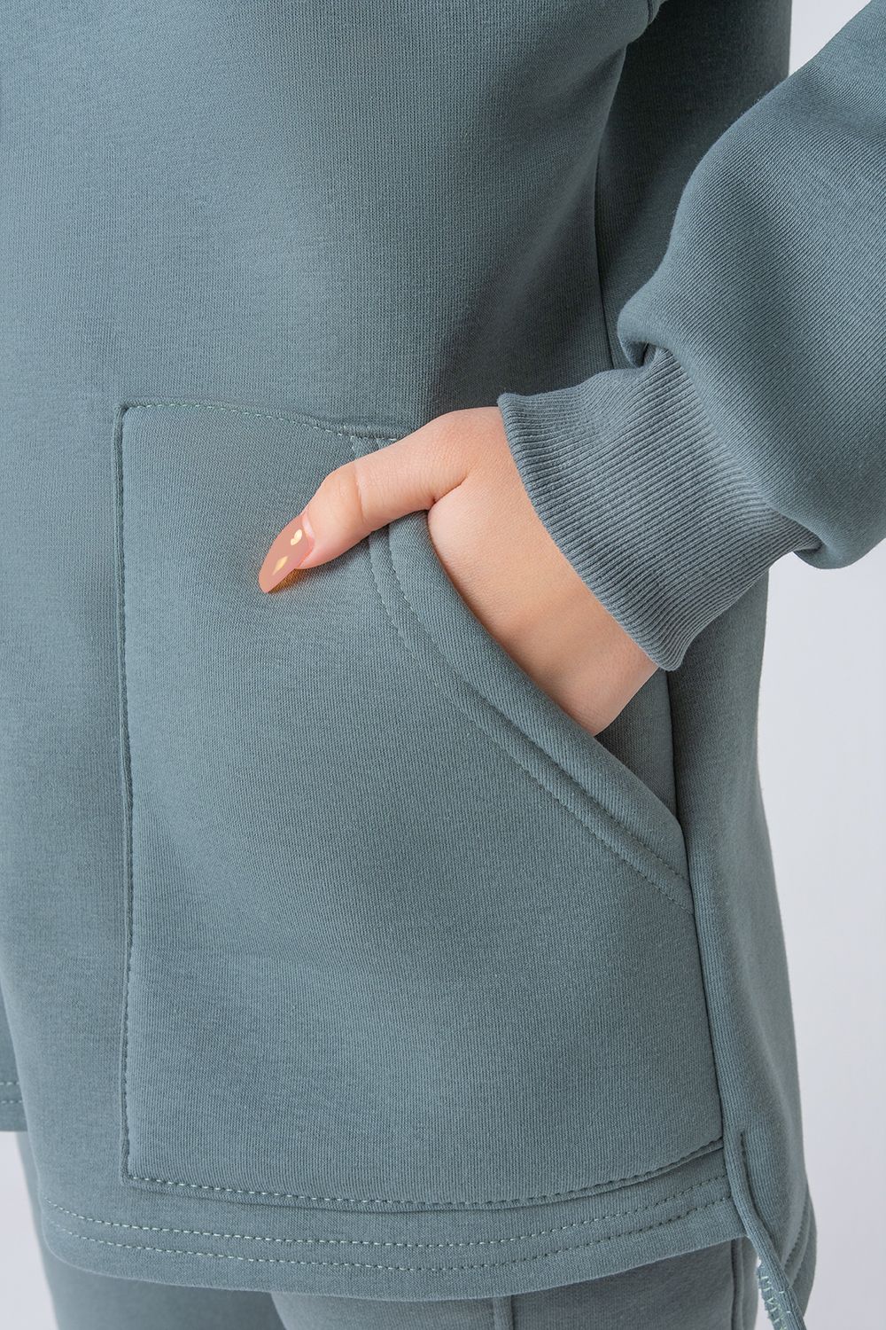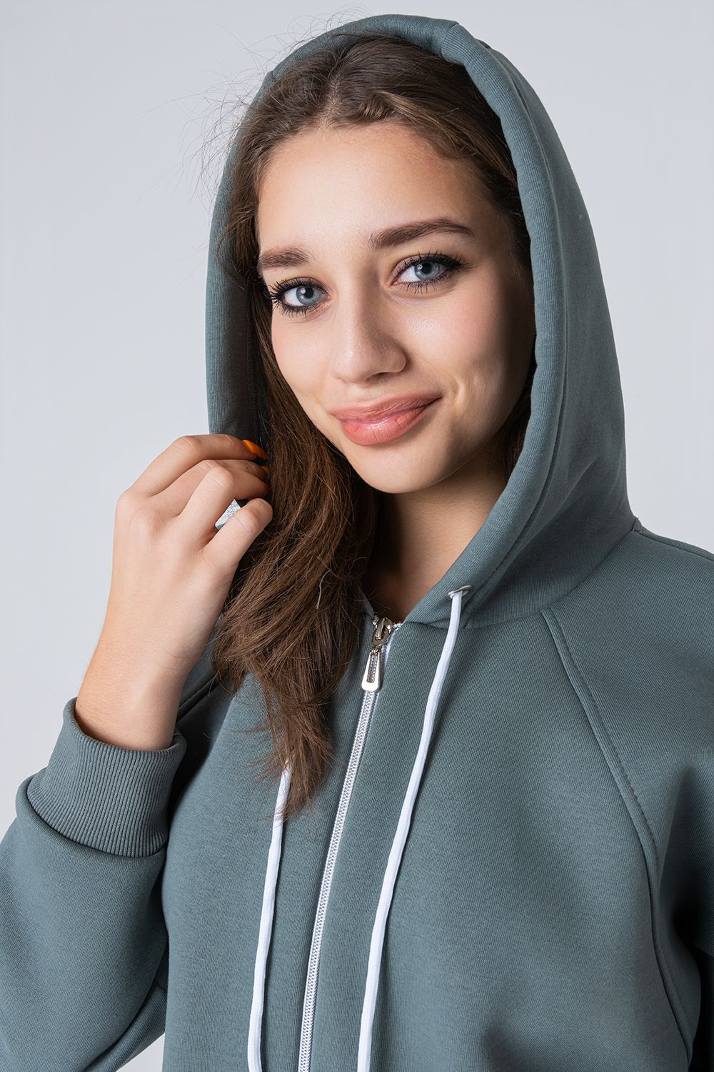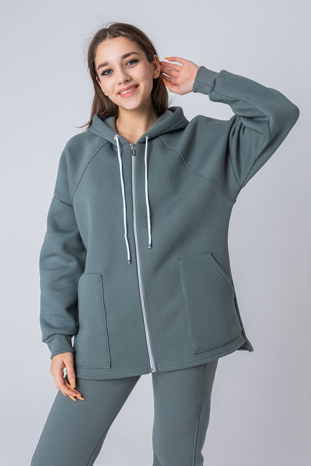 Толстовка утепленная, прямая, свободная, на молнии, с удлиненной спинкой, с капюшоном. Рукав длинный, на эластичном манжете. Полочка и спинка с фигурными кокетками. В нижней части полочки расположены удобные накладные карманы.
