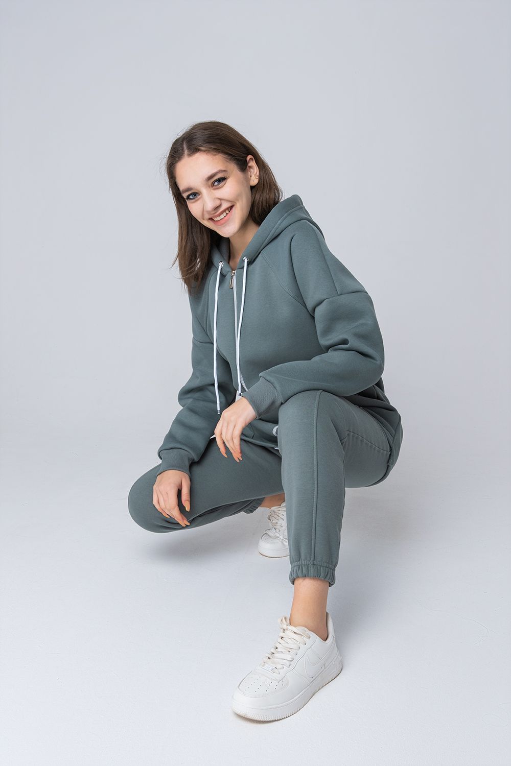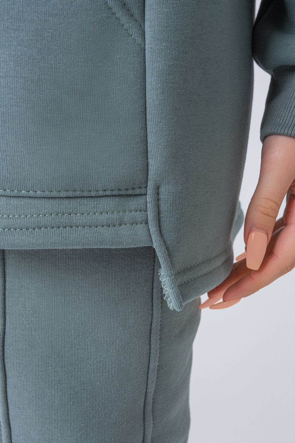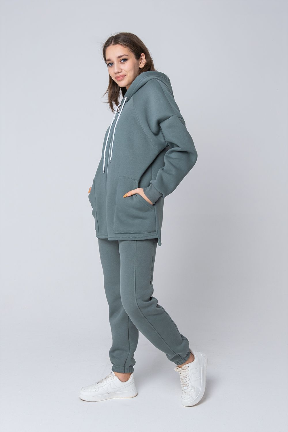 Толстовка утепленная, прямая, свободная, на молнии, с удлиненной спинкой, с капюшоном. Рукав длинный, на эластичном манжете. Полочка и спинка с фигурными кокетками. В нижней части полочки расположены удобные накладные карманы.