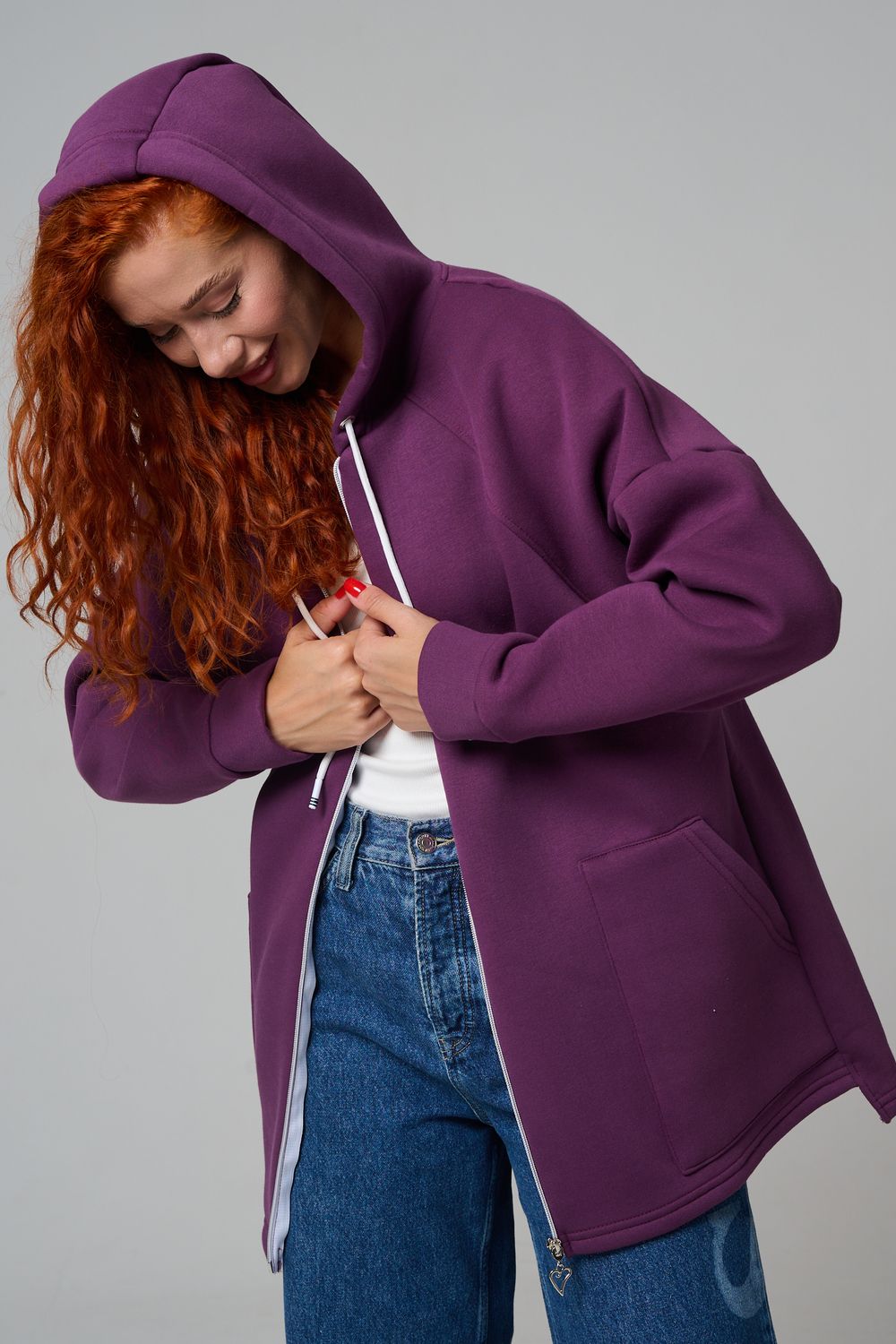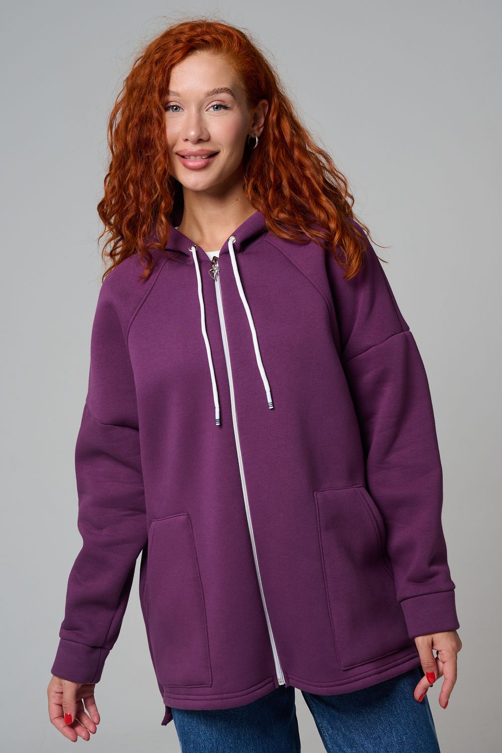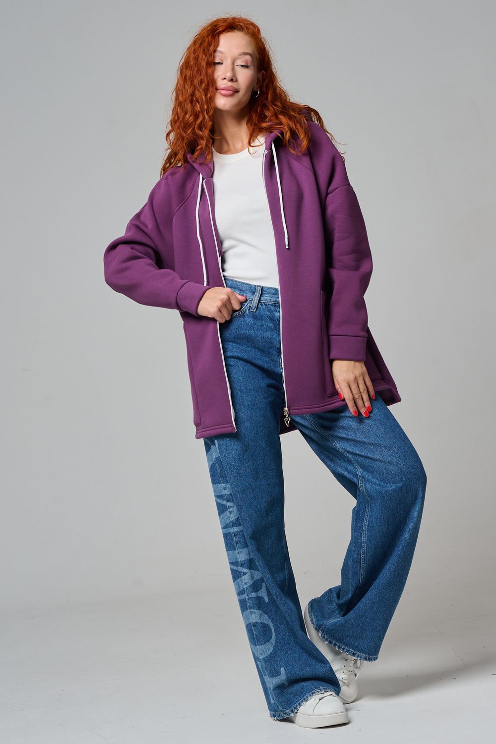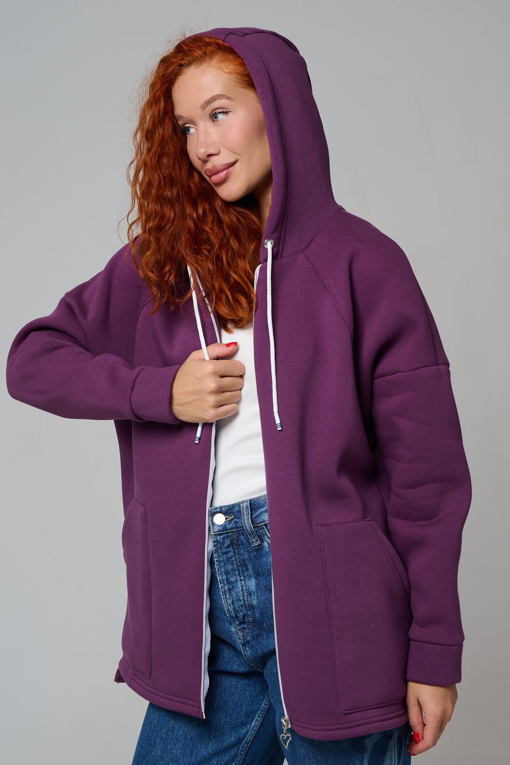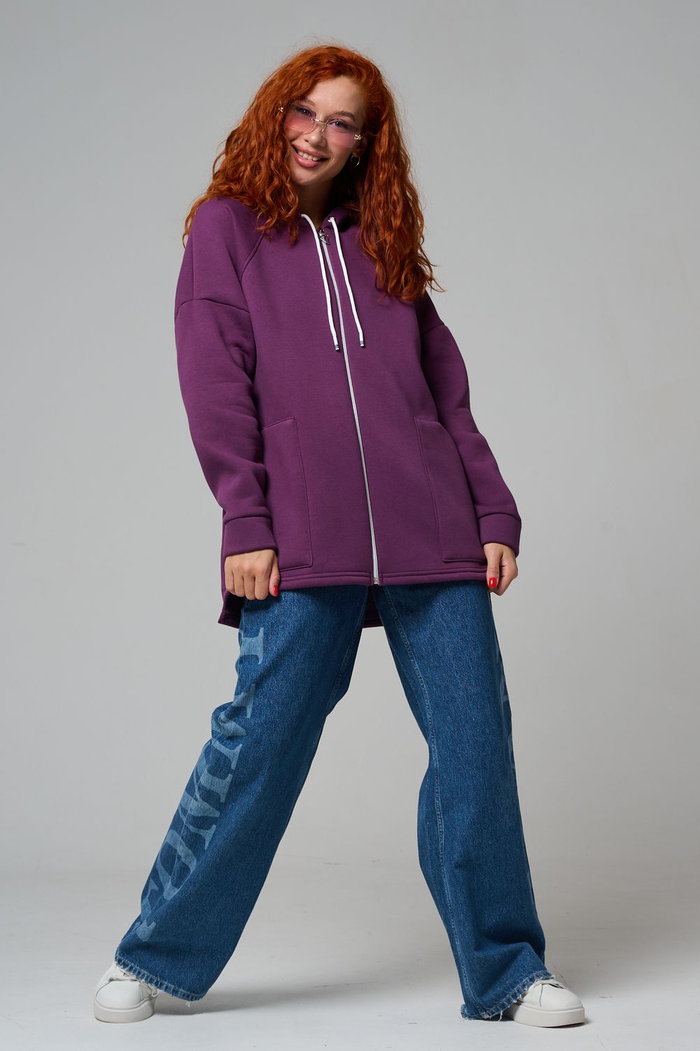 Толстовка утепленная, прямая, свободная, на молнии, с удлиненной спинкой, с капюшоном. Рукав длинный, на эластичном манжете. Полочка и спинка с фигурными кокетками. В нижней части полочки расположены удобные накладные карманы.