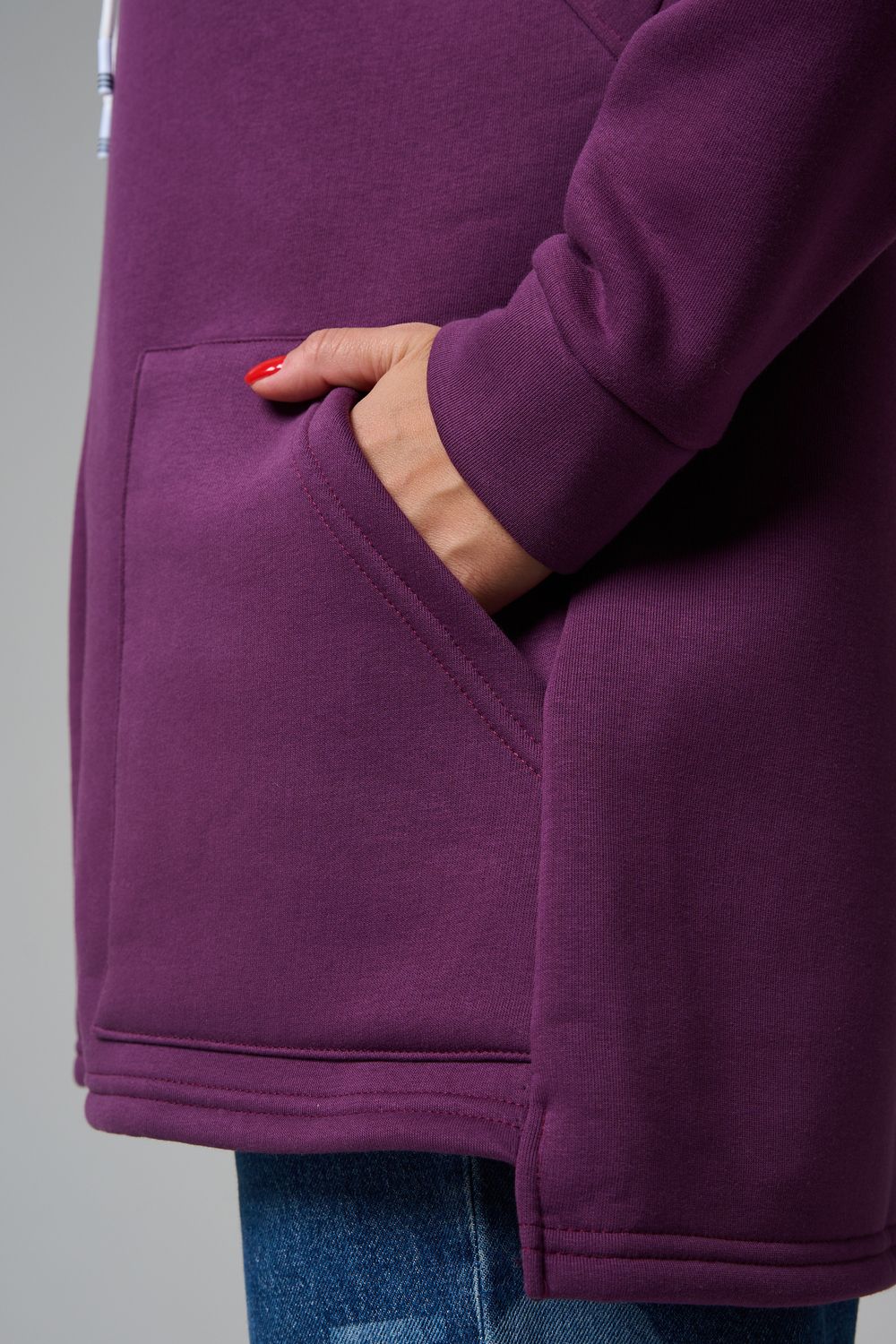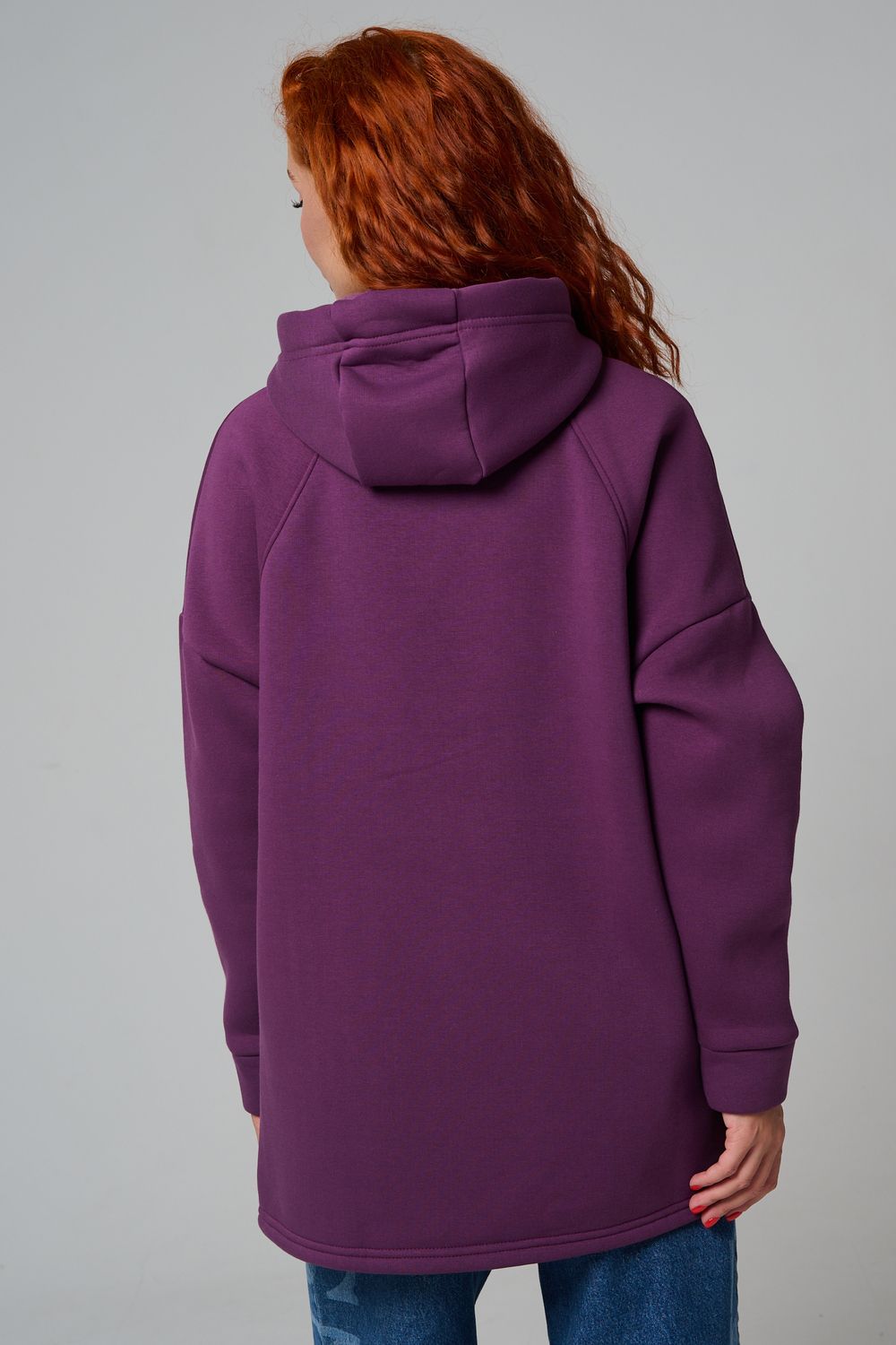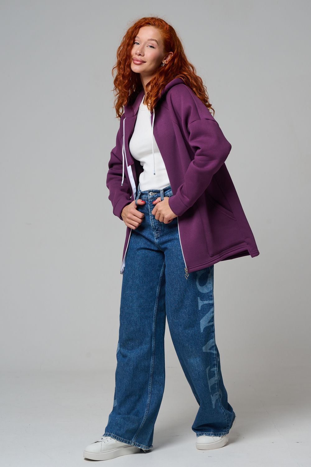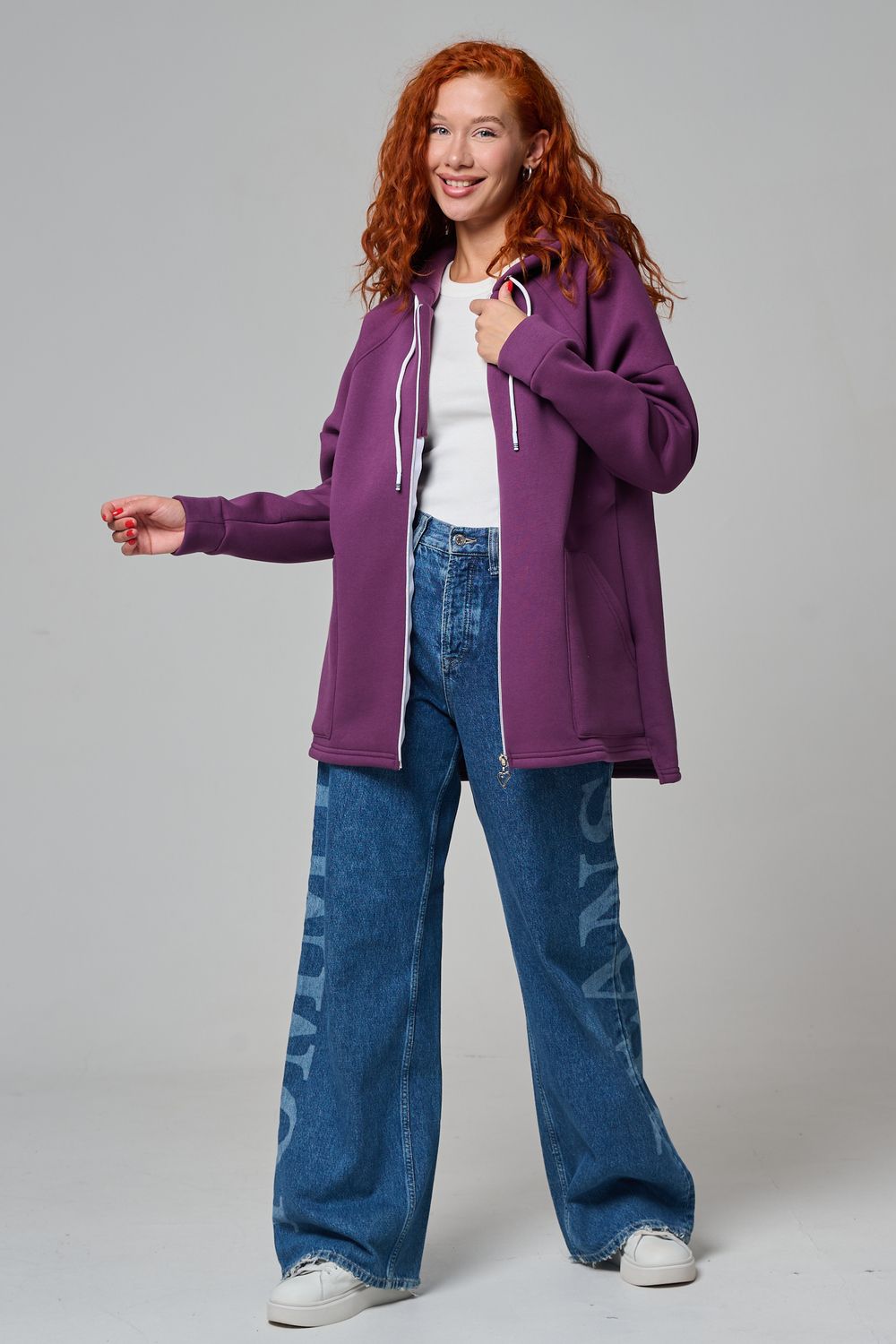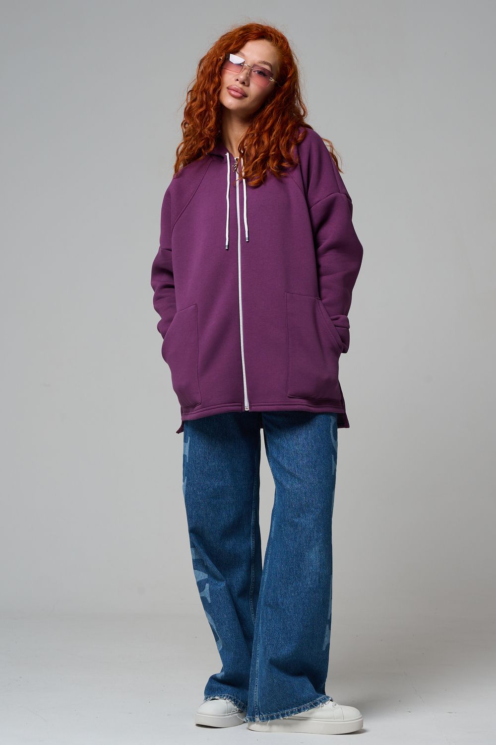 Толстовка утепленная, прямая, свободная, на молнии, с удлиненной спинкой, с капюшоном. Рукав длинный, на эластичном манжете. Полочка и спинка с фигурными кокетками. В нижней части полочки расположены удобные накладные карманы.