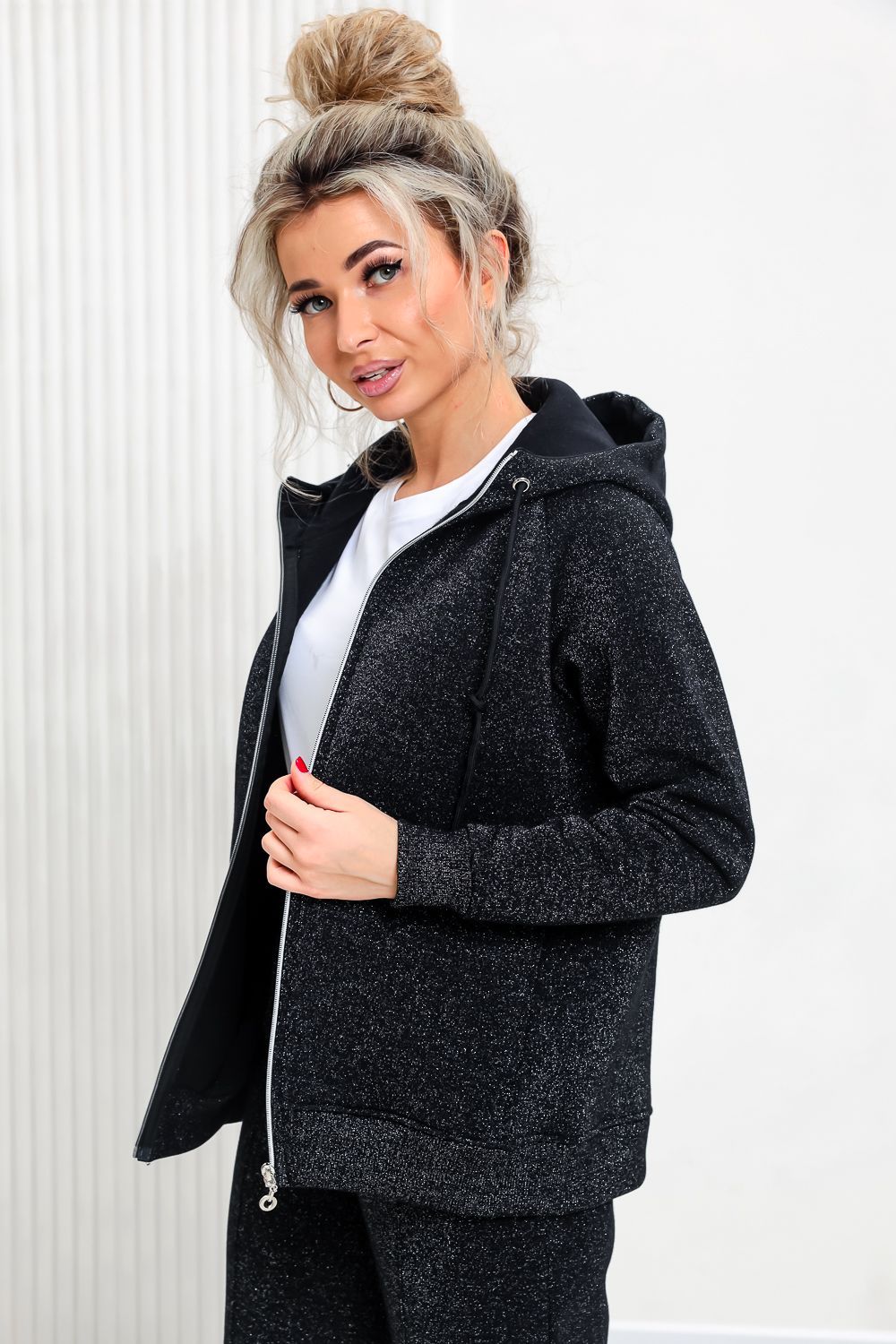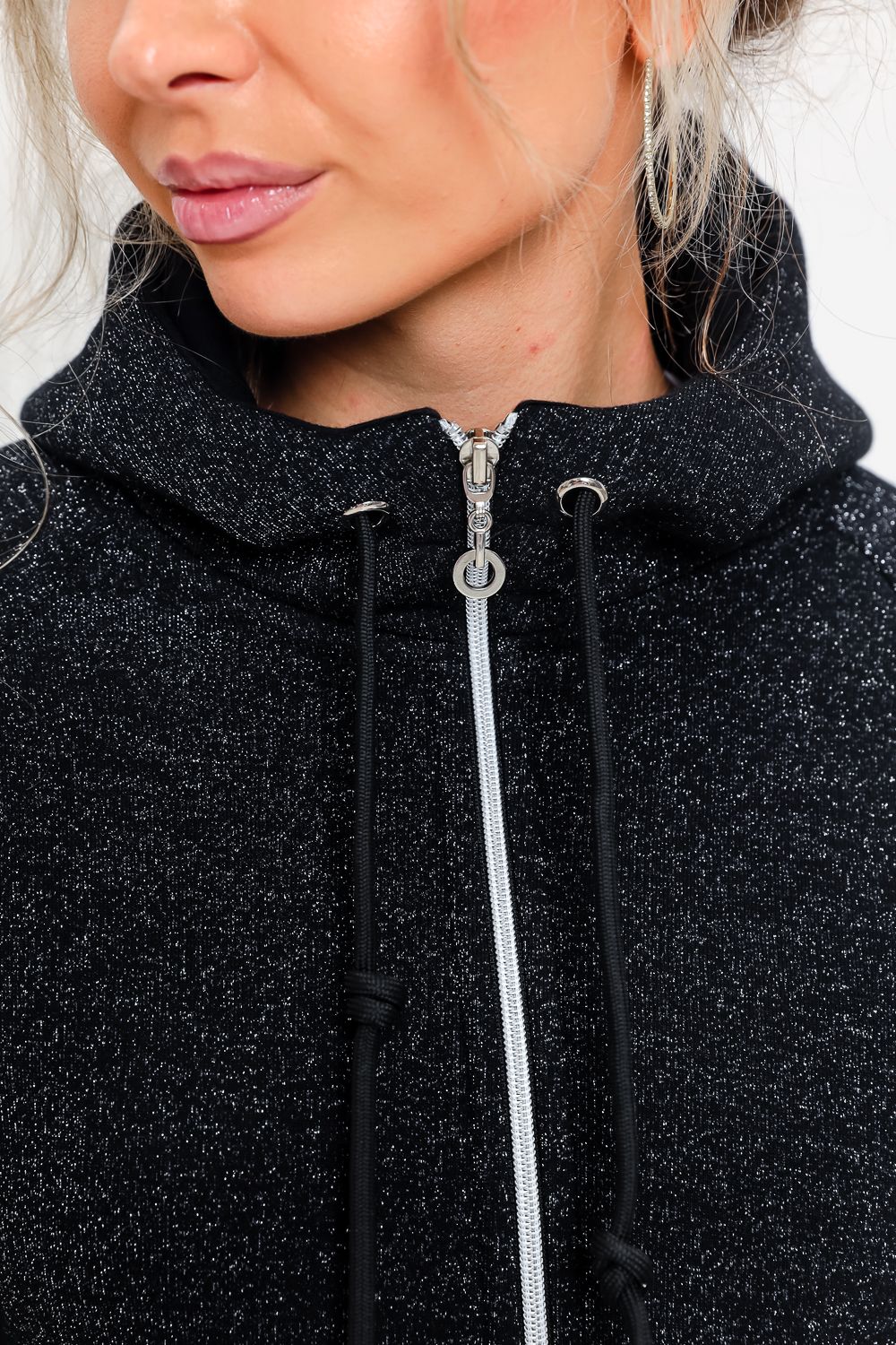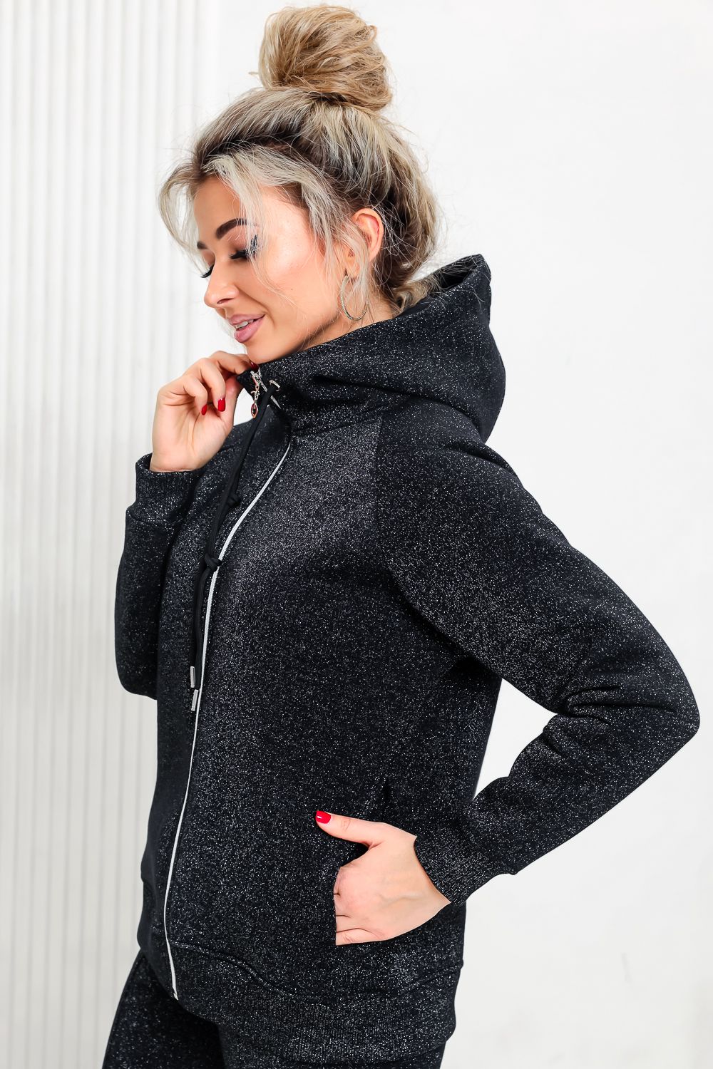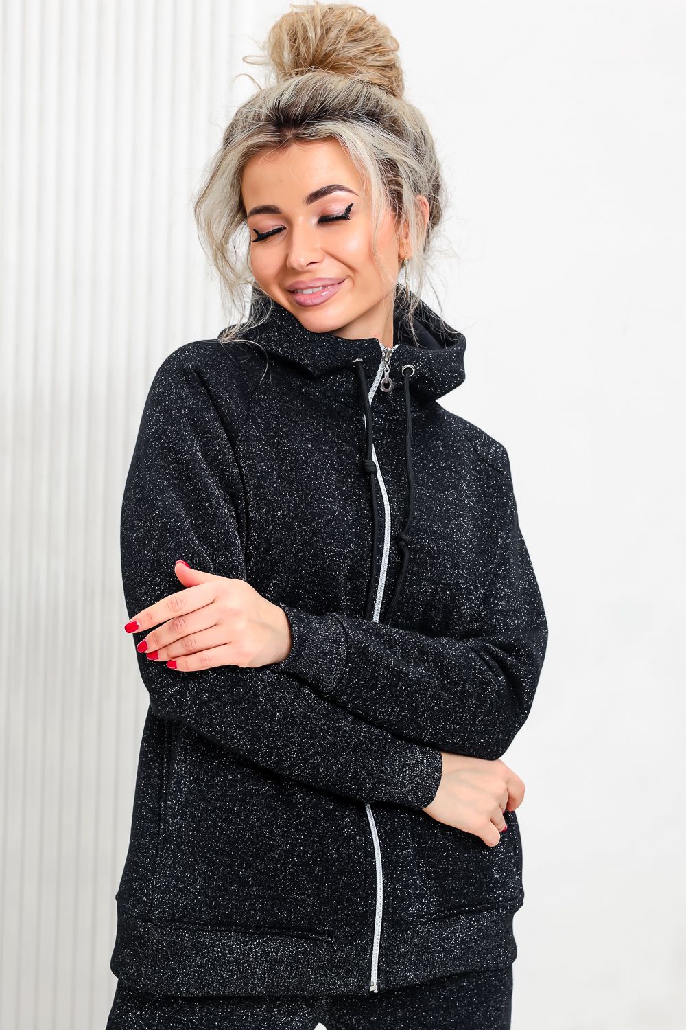 Толстовка прямая, с капюшоном, на молнии. Рукав реглан, длинный. На полочке в рельефном шве обработаны карманы. Низ толстовки и манжеты рукавов выполнены из эластичного полотна.