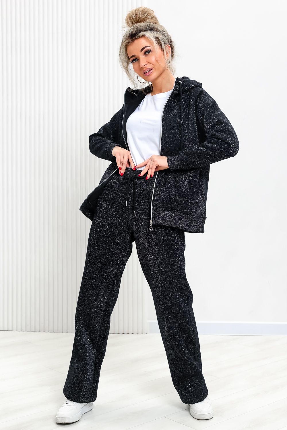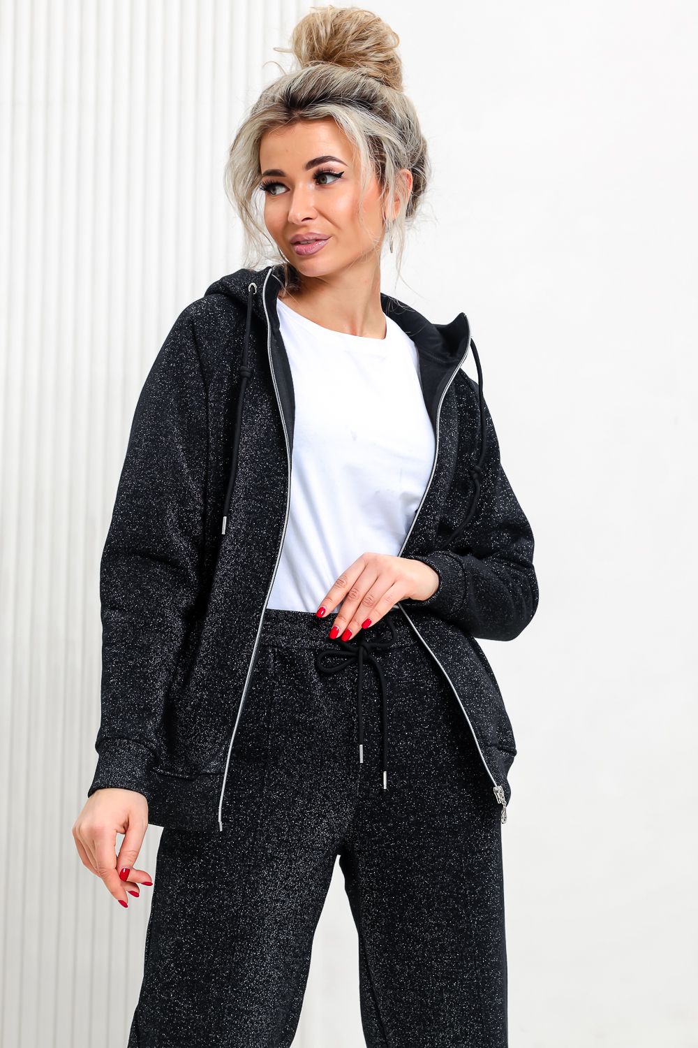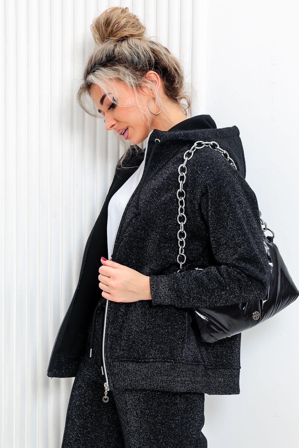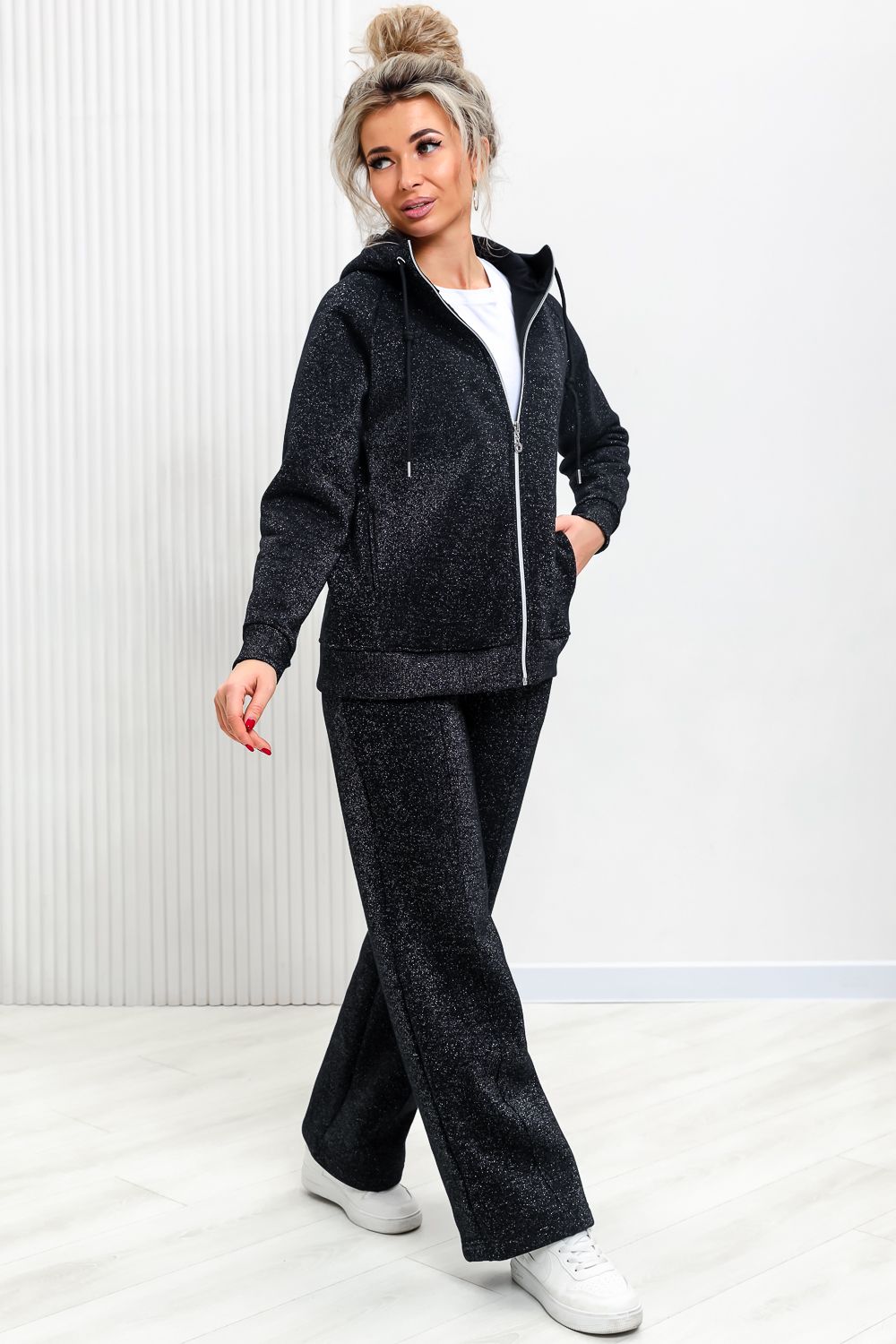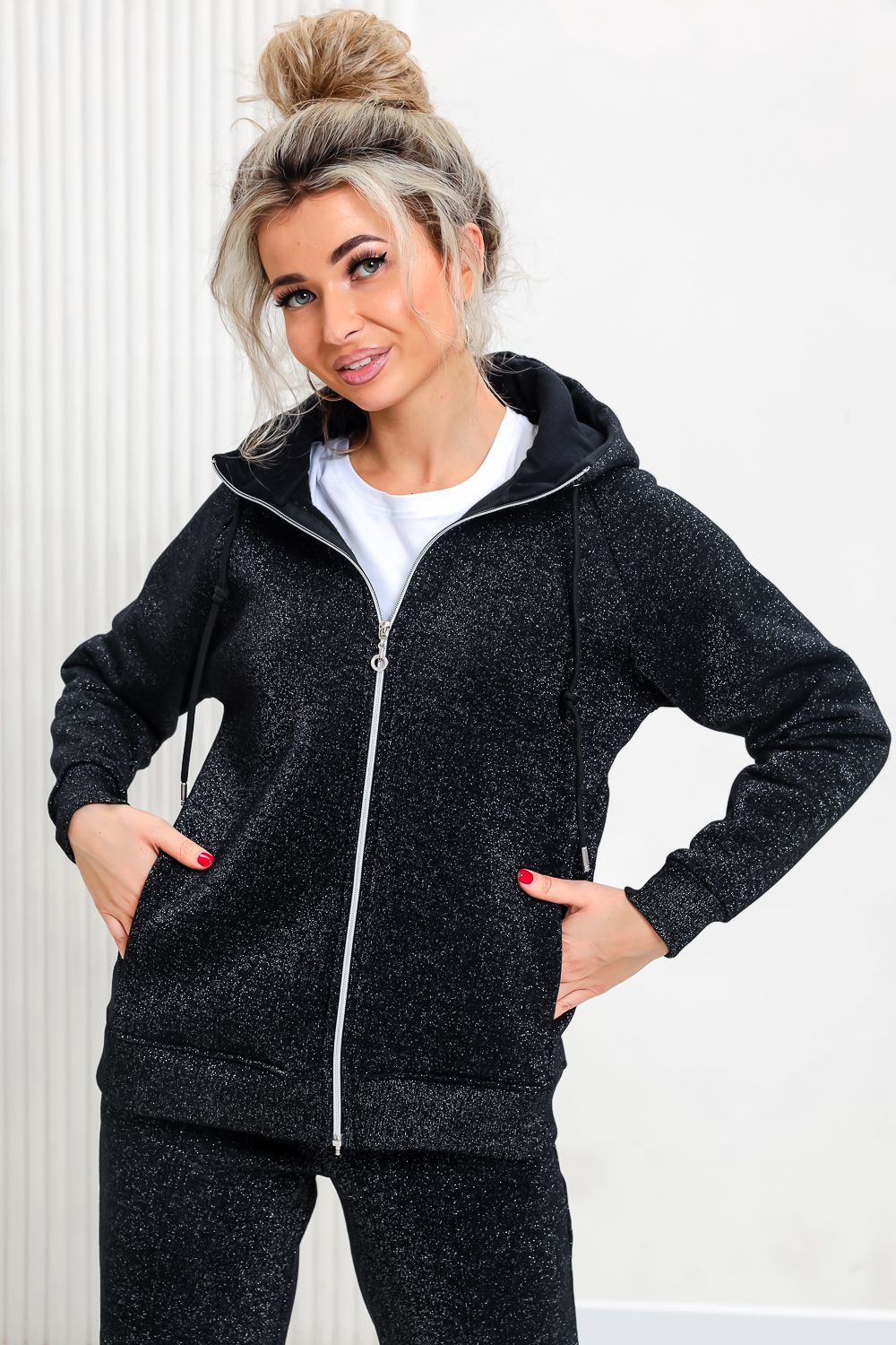 Толстовка прямая, с капюшоном, на молнии. Рукав реглан, длинный. На полочке в рельефном шве обработаны карманы. Низ толстовки и манжеты рукавов выполнены из эластичного полотна.