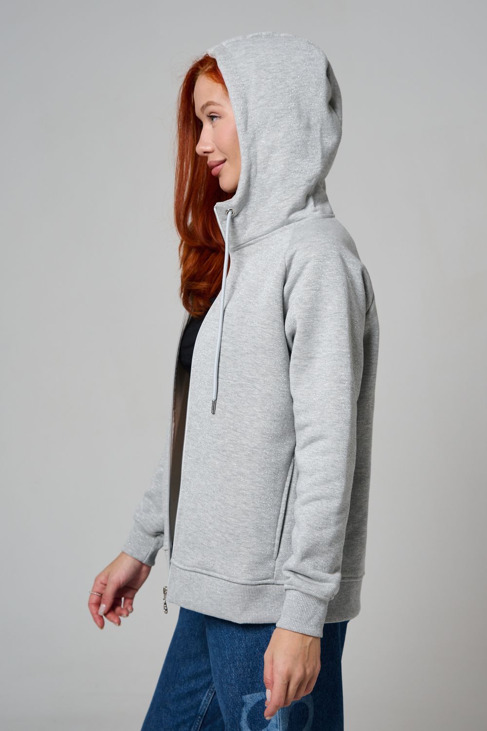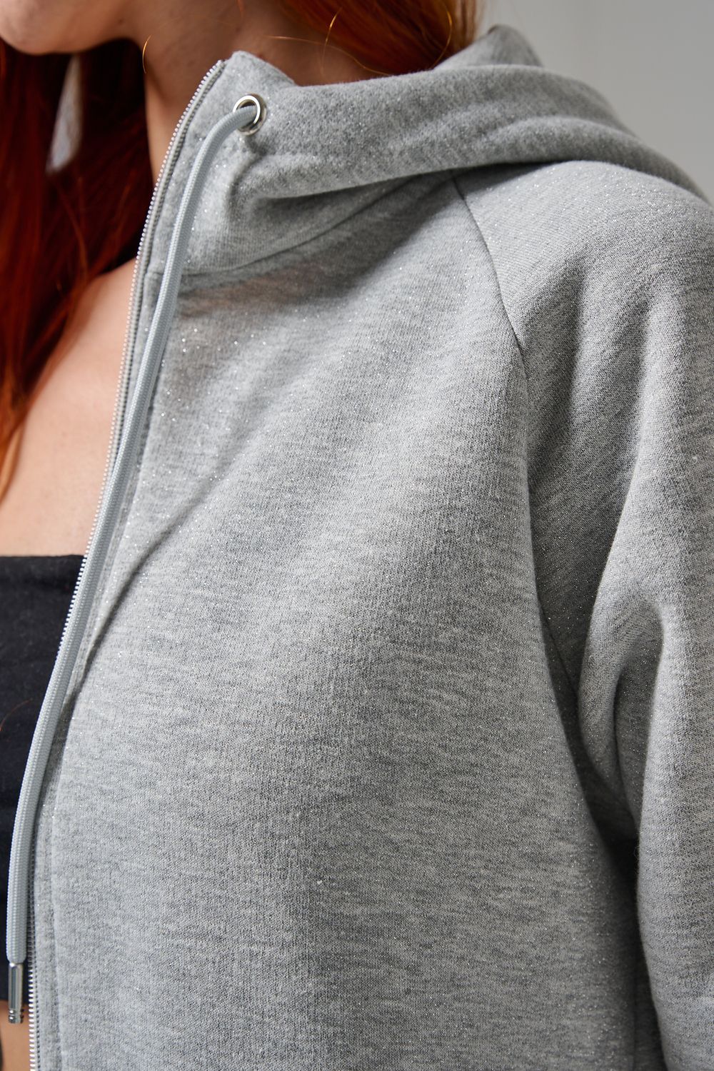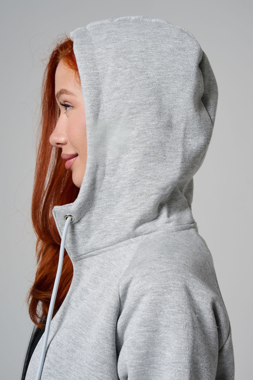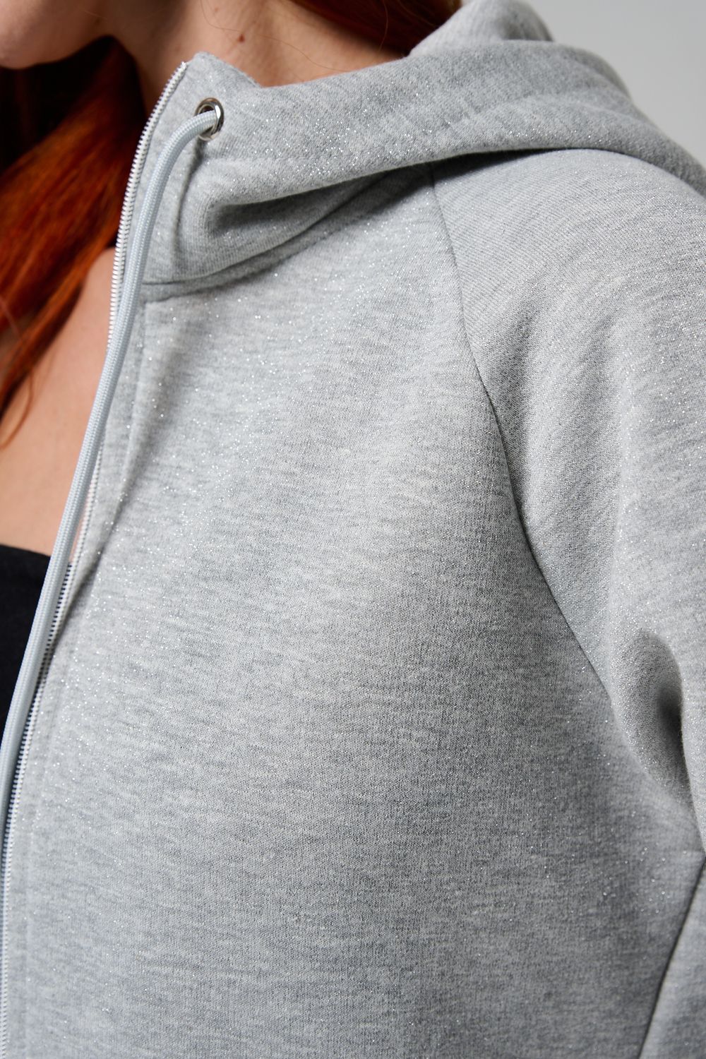 Толстовка прямая, с капюшоном, на молнии. Рукав реглан, длинный. На полочке в рельефном шве обработаны карманы. Низ толстовки и манжеты рукавов выполнены из эластичного полотна.