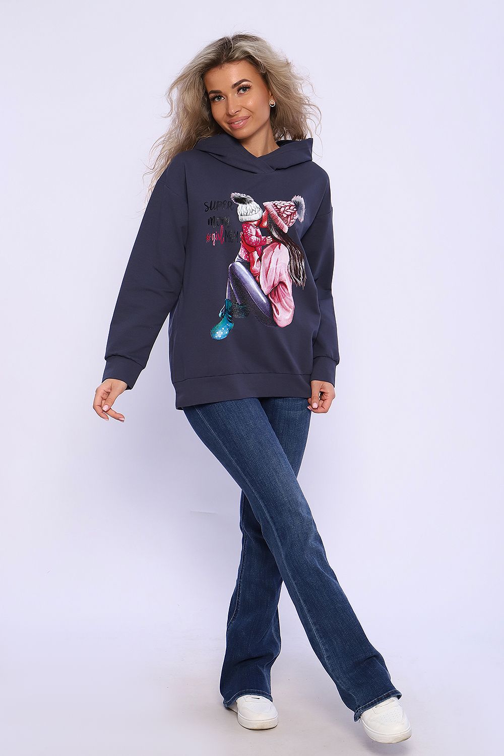 Молодежная толстовка с ярким принтом и капюшоном. По боковому шву карман. Рукав спущенный, на манжете. Благодаря свободному крою замечательно подойдет к любой фигуре.