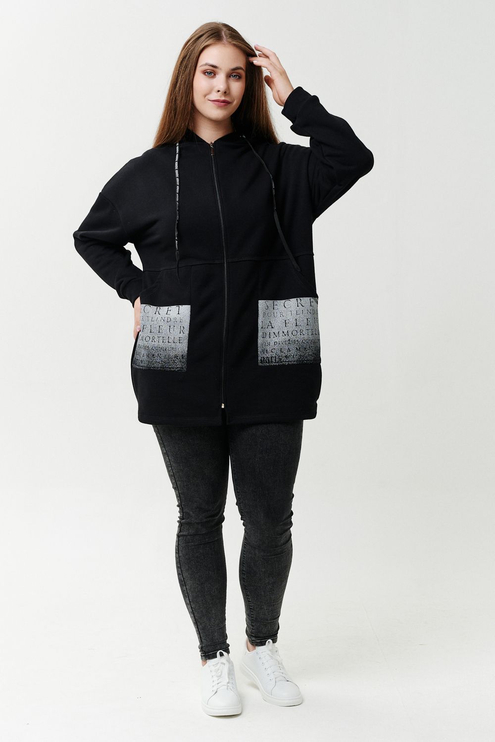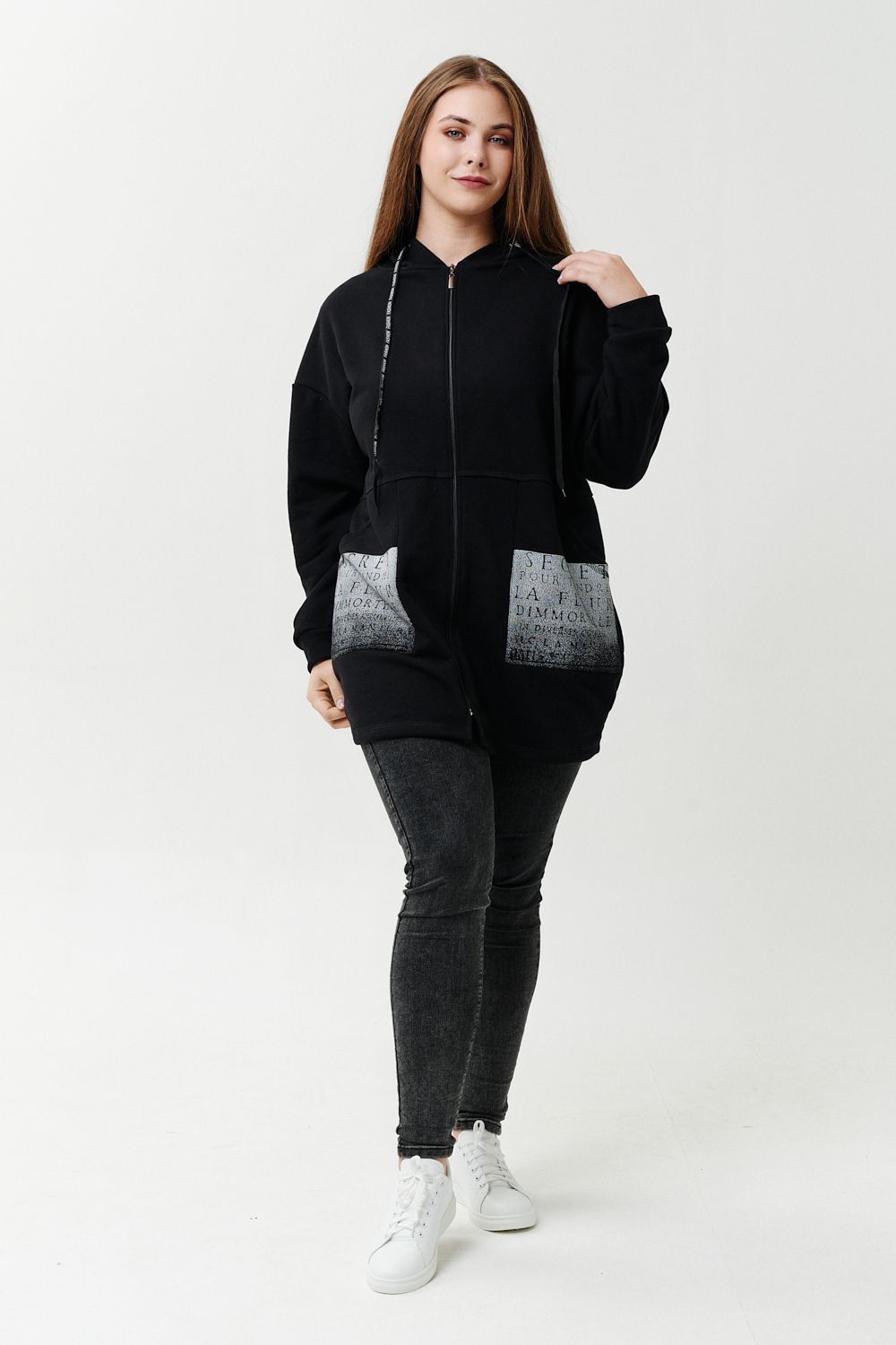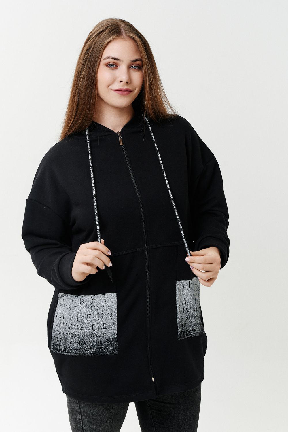 Толстовка женская прямого силуэта до линии бедер, в нижней части заужена по бокам. Рукав втачной с заниженной линией плеча, с манжетой. Капюшон с люверсами и декоративными шнурками с надписью. Застежка на тесьму-молнию. В нижней части полочки два накладных кармана со стильным принтом. Материал - футер 3-х нитка петля.